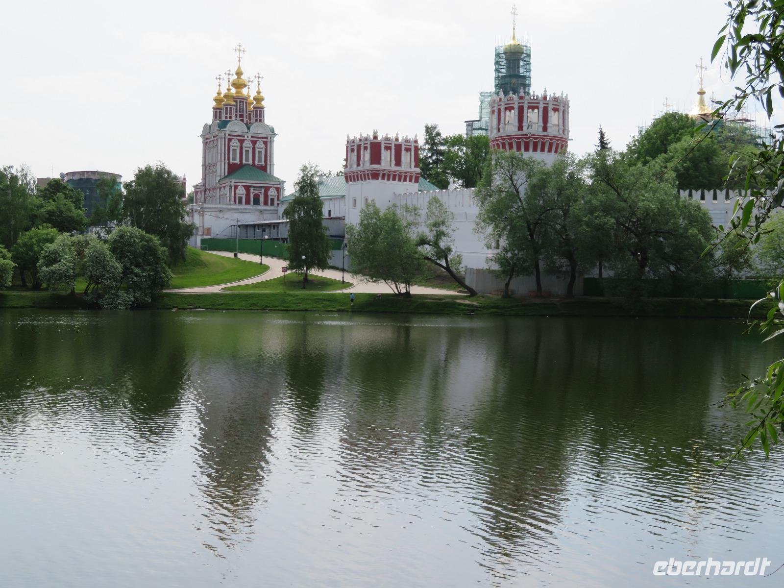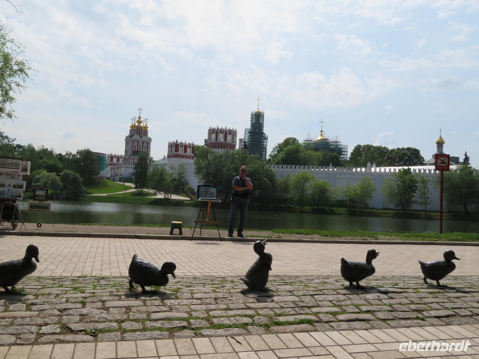 An einem Freitag ist der Verkehr auf Moskaus Straßen dicht; viele fahren bereits auf die Datschen hinaus. So benötigten wir doch ein Weilchen, ehe wir, u.a. am Gorki-Park vorbei, die Aussichtsplattform auf den Sperlingsbergen erreichten. Die Lomonossow-Universität im Rücken schauten wir auf die Stadt bei, wie oft, etwas dunstiger Sicht. Linker Hand entwickelt sich die Moskauer City - auch wenn die höchsten Bauträume wohl nicht im Sand der Moskwa aufgehen werden. Unser nächster Stopp erfolgte am Teich neben dem Neujungfrauenkloster mit den Enten von Barbara Bush. Interessant wie immer und für kulturell und politisch-historisch Interessierte ein spannender Bummel durch die Geschichte ist der Besuch des Prominentenfriedhofs neben dem Kloster. Eine Kurzvisite führte uns an den Gräbern von Künstlern zu Gogols und Tschechows Grab, an Militärs vorbei zu Chrustschov, Tupolew und dann in die jüngste Politik zu General Lebed, Gorbatschova und Jelzin. - Geschichte pur.