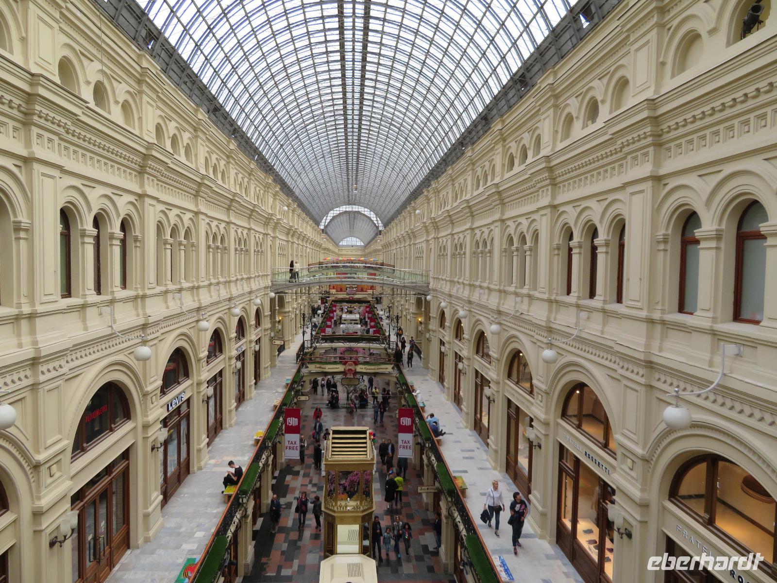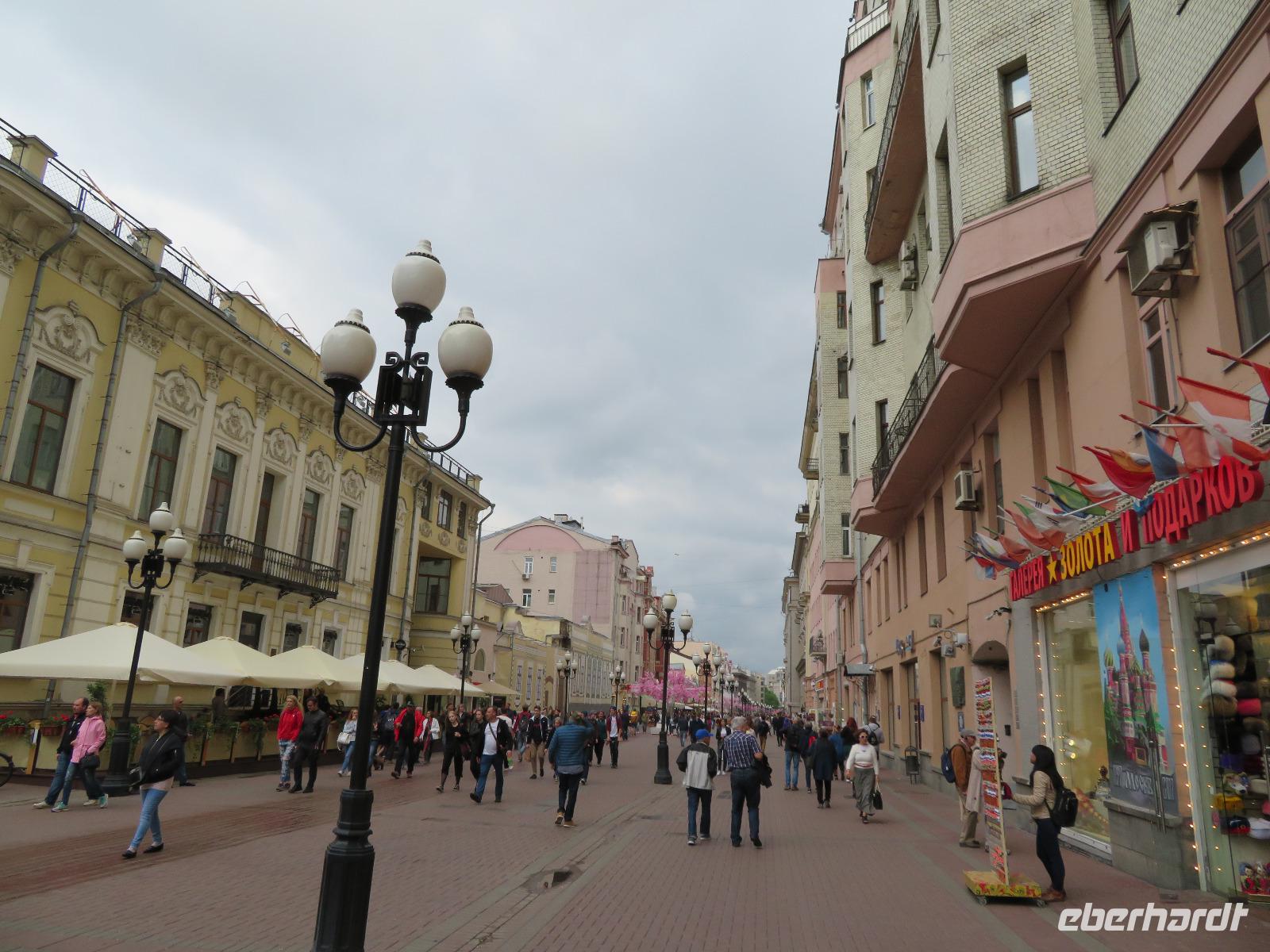 Nach einer Mittagspause „bummelten" wir beim Restregen durch Kitai Gorod zur Nikolska, denn durch das Kaufhaus GUM zur Basiliuskathedrale. Von außen immer wieder beeindruckend, bietet sie, trotz qualitativ schlechter Innenbemalung, einige interessante Aspekte unserer historischen Reise. Nach ein wenig Freizeit für GUM, Roten Platz und Nikolska trafen wir uns für die Metrobesichtigung und einen Bummel auf dem Arbat. Die Metrostationen Platz der Revolution und einige Stationen auf der Ringbahn vermittelten einen guten Eindruck von der Üppigkeit der architektonischen Gestaltung der Metrostationen Moskaus und vom Geist der Sowjetunion.