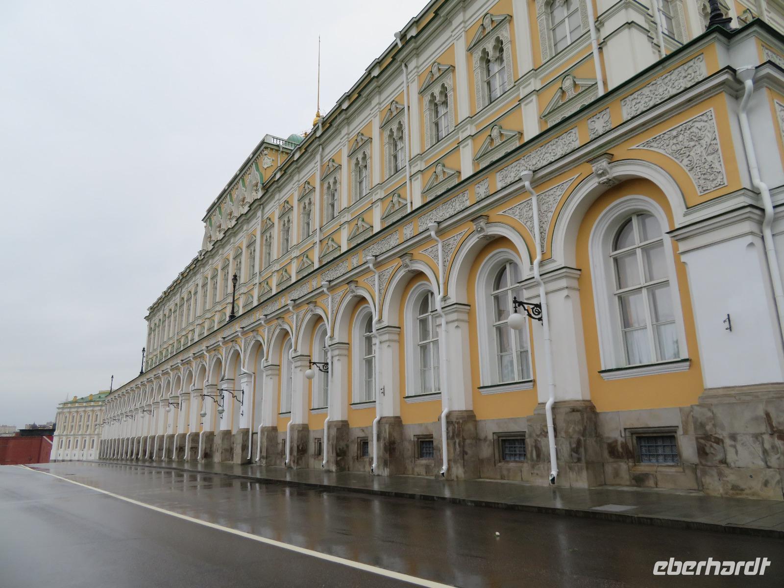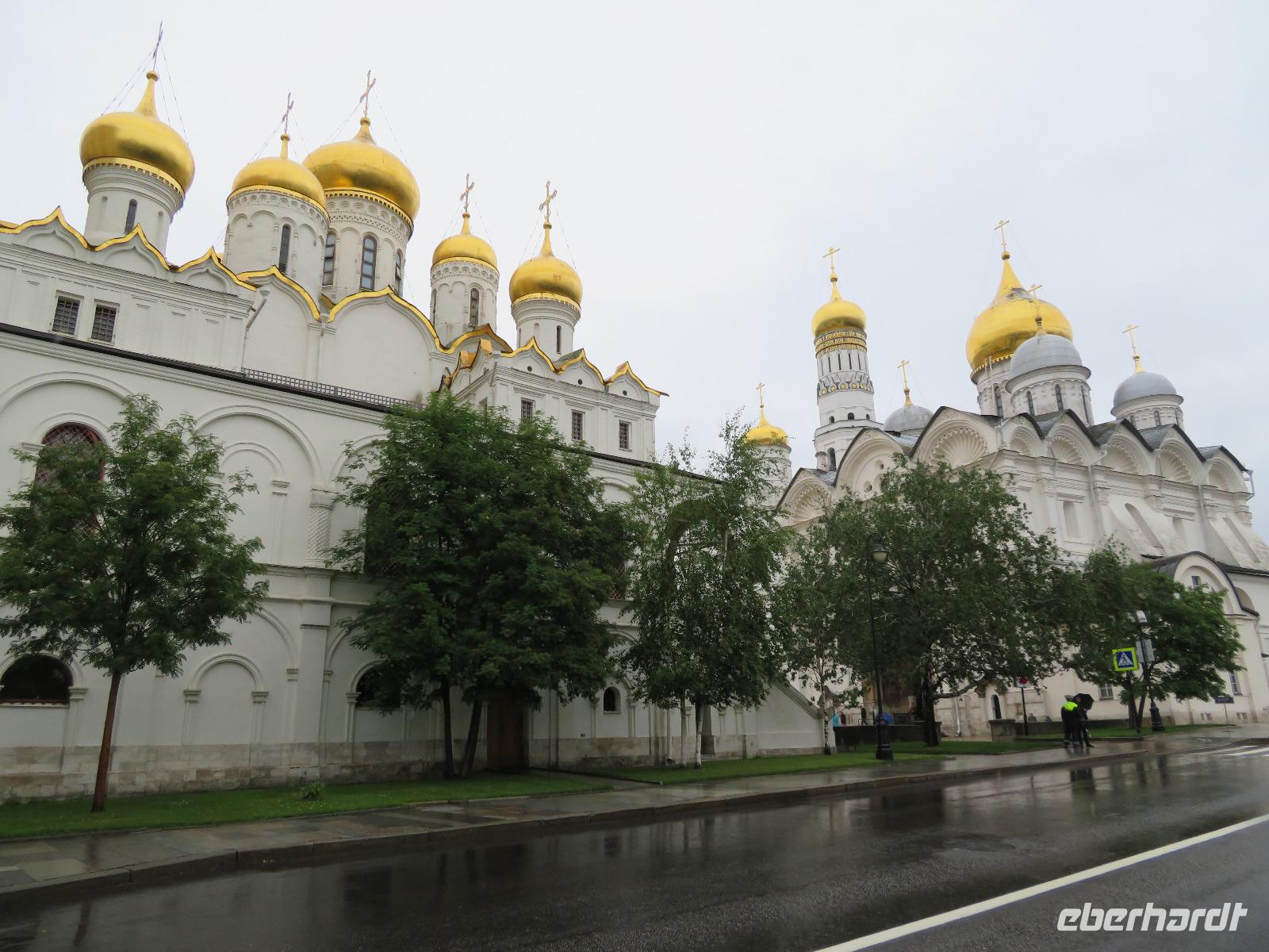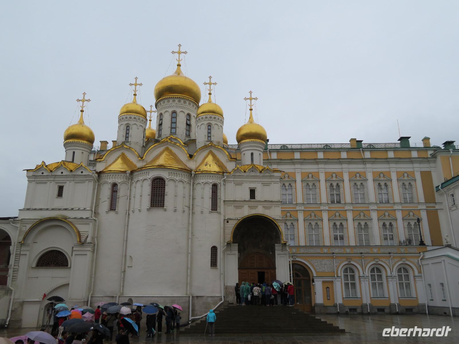 Pulloverwetter! Als wir am späten Vormittag das Hotel verließen, zeigte das Thermometer 8 Grad und es nieselte. Dies sollte uns bis fast in die Abendstunden begleiten. Recht zügig ging es am Sonntag nach Kolomenskoje. Bei diesig-regnerischem Wetter war der Fototermin an der weißen Himmelfahrtskirche nicht so der Hit. Oxana schlug die Besichtigung des Kolomenskoje-Museums im Torbogen oberhalb der Kirche vor. Die Ausstellung rundete unser Bild vom Übergang von russischen Großfürstentümern zum Zarentum bestens ab. Mittagessen dann im kleinen Hinterhofrestaurant in der Nähe des Krasnaja Worota. Ein öffentlicher Radtag auf dem Ring behinderte unsere Planungen, mit dem Bus recht schnell zum Kreml zu gelangen. Wenn die Straßen gefüllt sind, nimmt man in Moskau die Metro. So gelangten wir fast pünktlich zum Kreml-Einlass. Dieser verzögerte sich etwas - wie immer: hunderte Touristen - mehrheitlich aus China quollen auf den Eingang mit Security zu. Bei Nieselregen waren gerade so zwei Kathedralen mit einer Besichtigung zu schaffen, dann ging es zügig zum letzten Einlass in die Rüstkammer. Viel Zeit ist nicht bis 18 Uhr: Oxana, unsere Reiseleiterin machte „museumspädagogisch" aber das beste aus der Situation; nach den Kutschen der Zaren und Ihrer Kleidung standen wir doch recht bald vor den eigentlichen Höhepunkten der Rüstkammer in der oberen Etage; Faberge'-Eier, brilliante Bucheinbände, eine riesige Sammlung deutscher Silberarbeiten, Kettenhemden und Rüstungen, edelsteinbesetzten Waffen. Ein kurzer Spaziergang durch den Alexandergarten und wir erreichten die Manege, von wo wir zügig mit dem Bus zum Hotel und letztem Abendessen in Moskau fuhren.