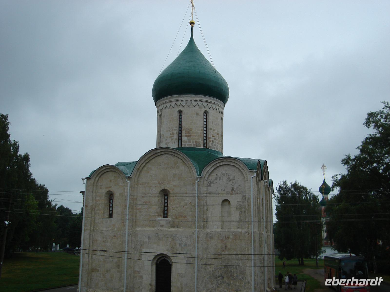 In Pereslawl Salesski gibt es, wie in Moskau, auch einen Roten Platz. Die ursprüngliche Bedeutung von „Roter Platz" ist 'schöner Platz', in Pereslawl Salesski wie auch in Moskau. Wir sahen eine noch erhaltene mittelalterliche Wallanlage und eine einmalig schöne Kirche, die Erlöser- und Verklärungskirche. Der Regen hatte für einen Moment aufgehört. So konnten wir brauchbare Fotos machen.