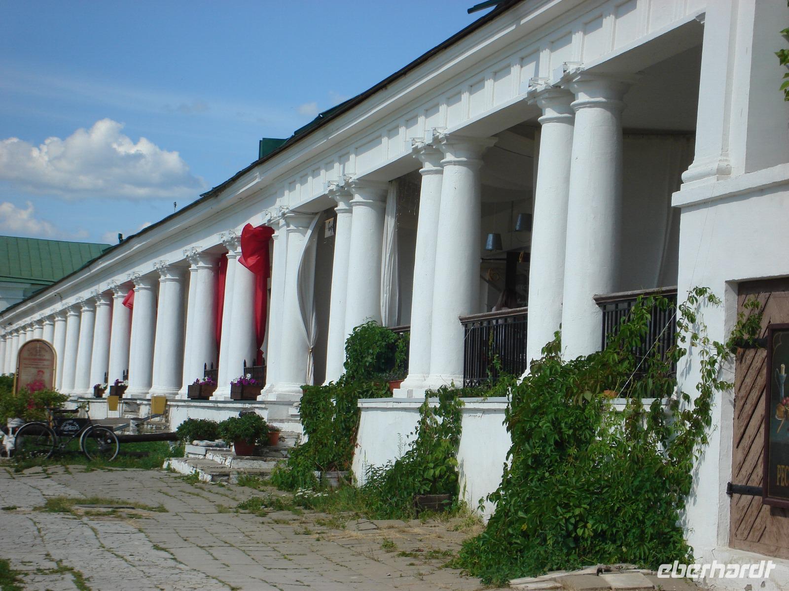 Ein Gewitter zog auf. Wir schafften es gerade noch in unseren Bus. Weiter ging es ins Zentrum von Kostroma, wo uns ganz besonders die bekannten Handelsreihen faszinierten. Der Platz vor den Handelsreihen ist ein beliebter Treffpunkt und heißt Sussanin-Platz. Hier steht auch das Wahrzeichen der Stadt, der Feuerwachturm aus dem Jahr 1823.