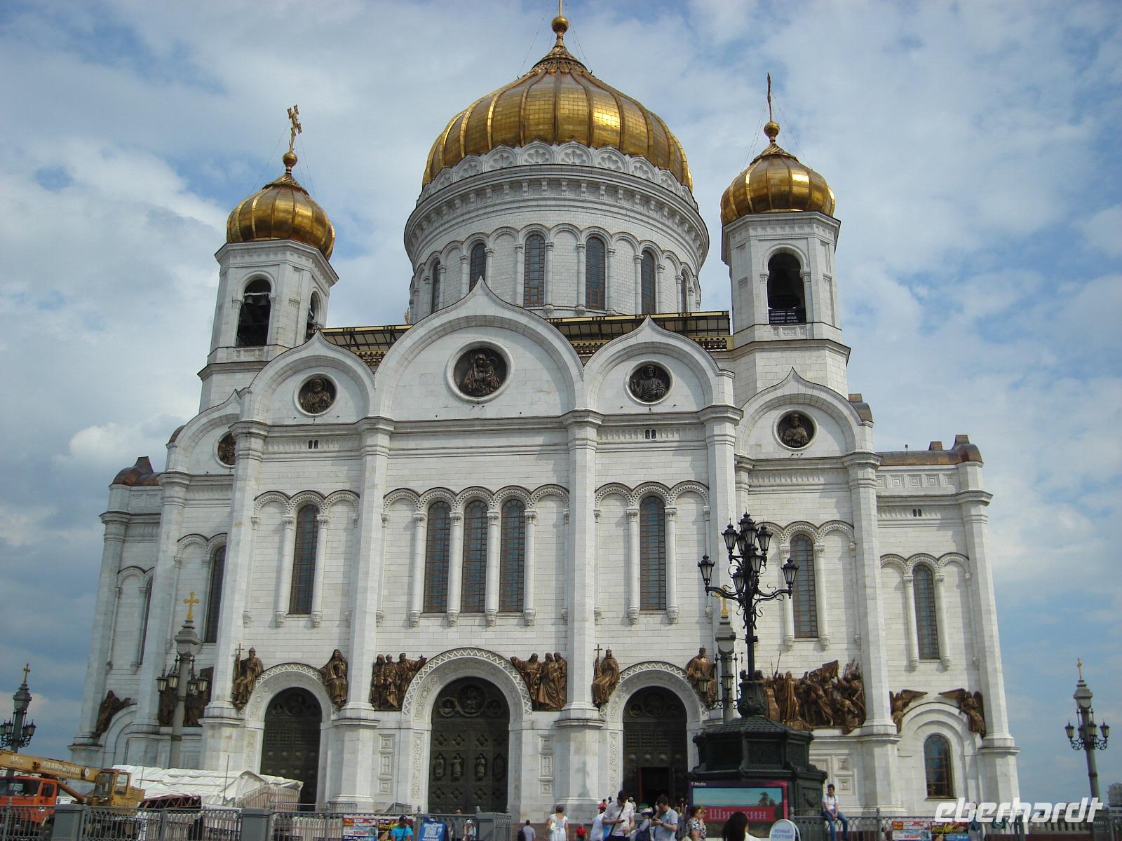 Nun fuhren wir weiter zu unserem Restaurant, diesmal einem ukrainischen mit dem Namen Taras Bulba. Nach der Stärkung mit einem schmackhaften Essen ging es weiter durch Moskaus Straßen zur Christ-Erlöser-Kathedrale, der größten russisch-orthodoxen Kathedrale der Welt. Oksana zeigte uns alte Fotos, erklärte die wirklich turbulente Geschichte dieses imposanten Bauwerkes. Die Kirche wurde 1931 durch die Bolschewiki zerstört und erst im Jahr 2000 wieder aufgebaut.