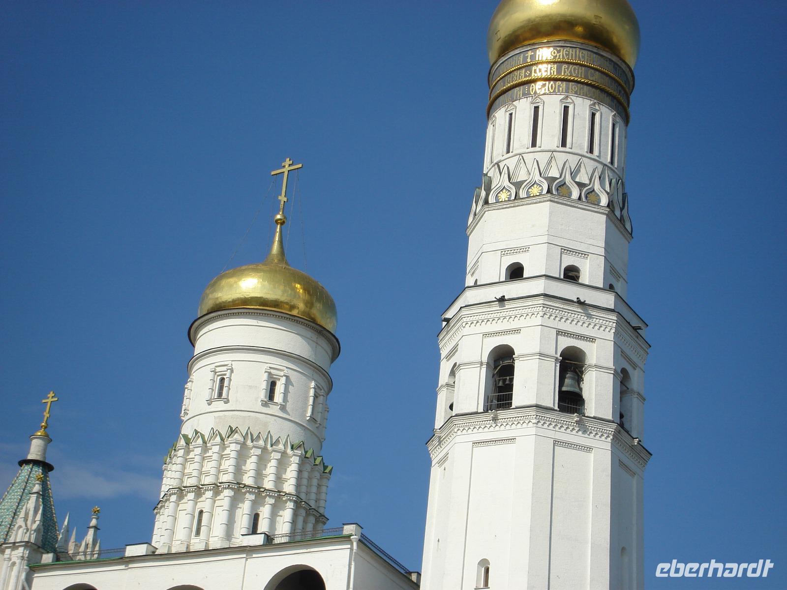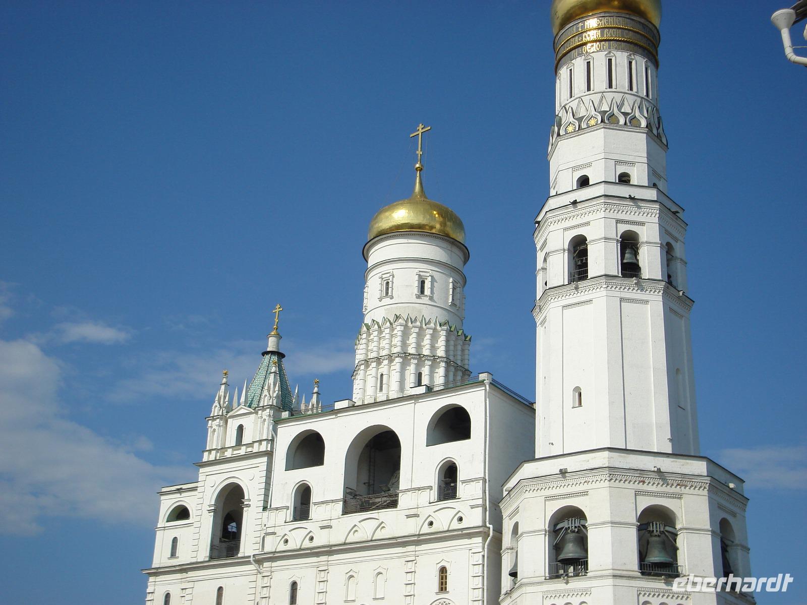 Absoluter Höhepunkt der Besichtigungstour war dann das älteste Gebäude der Stadt, die wunderschöne weiße Uspenski-Kathedrale [deutsch: Mariä Entschlafens] mit ihrem weltberühmten Großen Geläut. Der Glockenturm verfügt über 15 Glocken, die größte von ihnen ist 32 Tonnen schwer! Pünktlich um 12 Uhr fanden wir uns nach einem ausführlichen Rundgang und auch einem Gang über die Wehrmauer am Glockenturm ein und bewunderten das schöne Geläut und auch den Glöckner, der die vielen Glocken zum Schwingen brachte. Die Sonne kam heraus, wir machten Fotos und hatten auch Zeit für eine Verschnaufpause am Teich in der Mitte der Anlage.