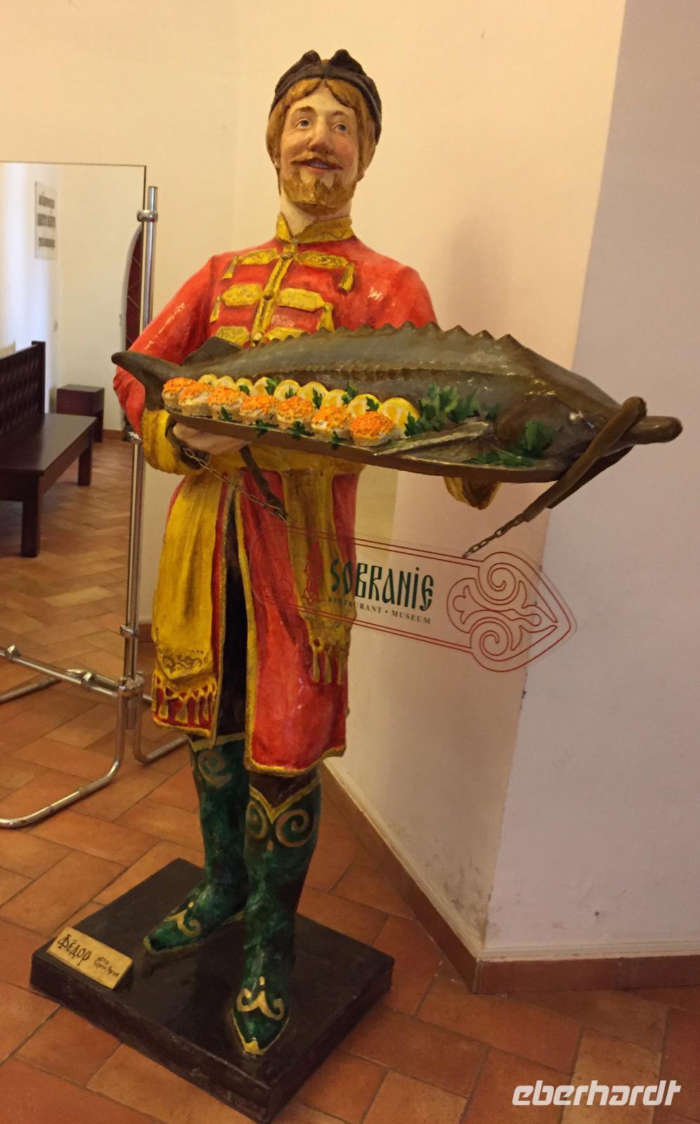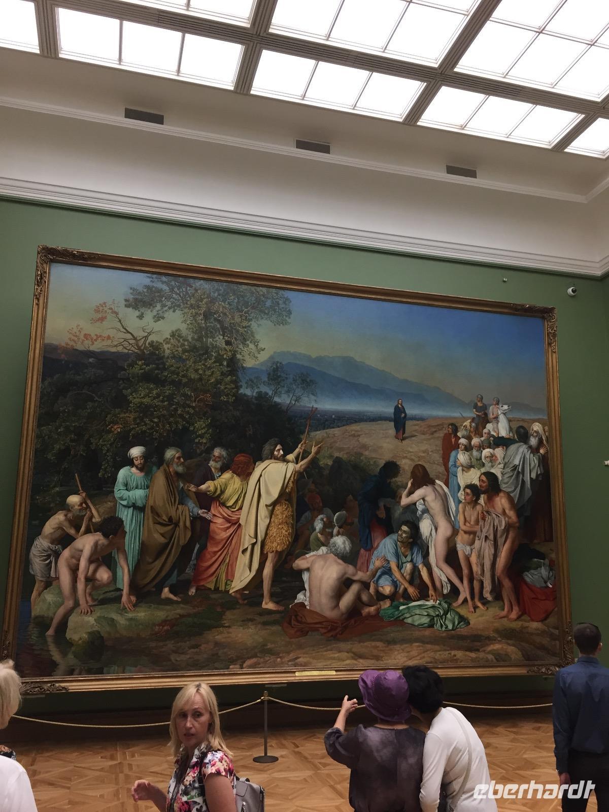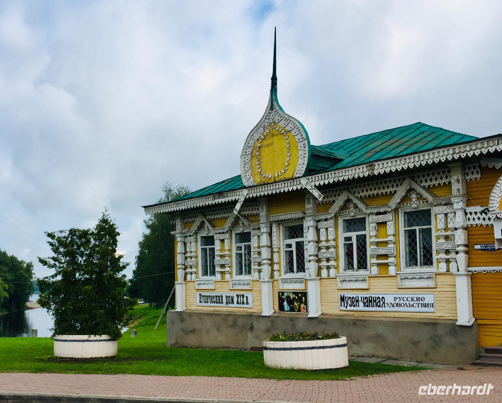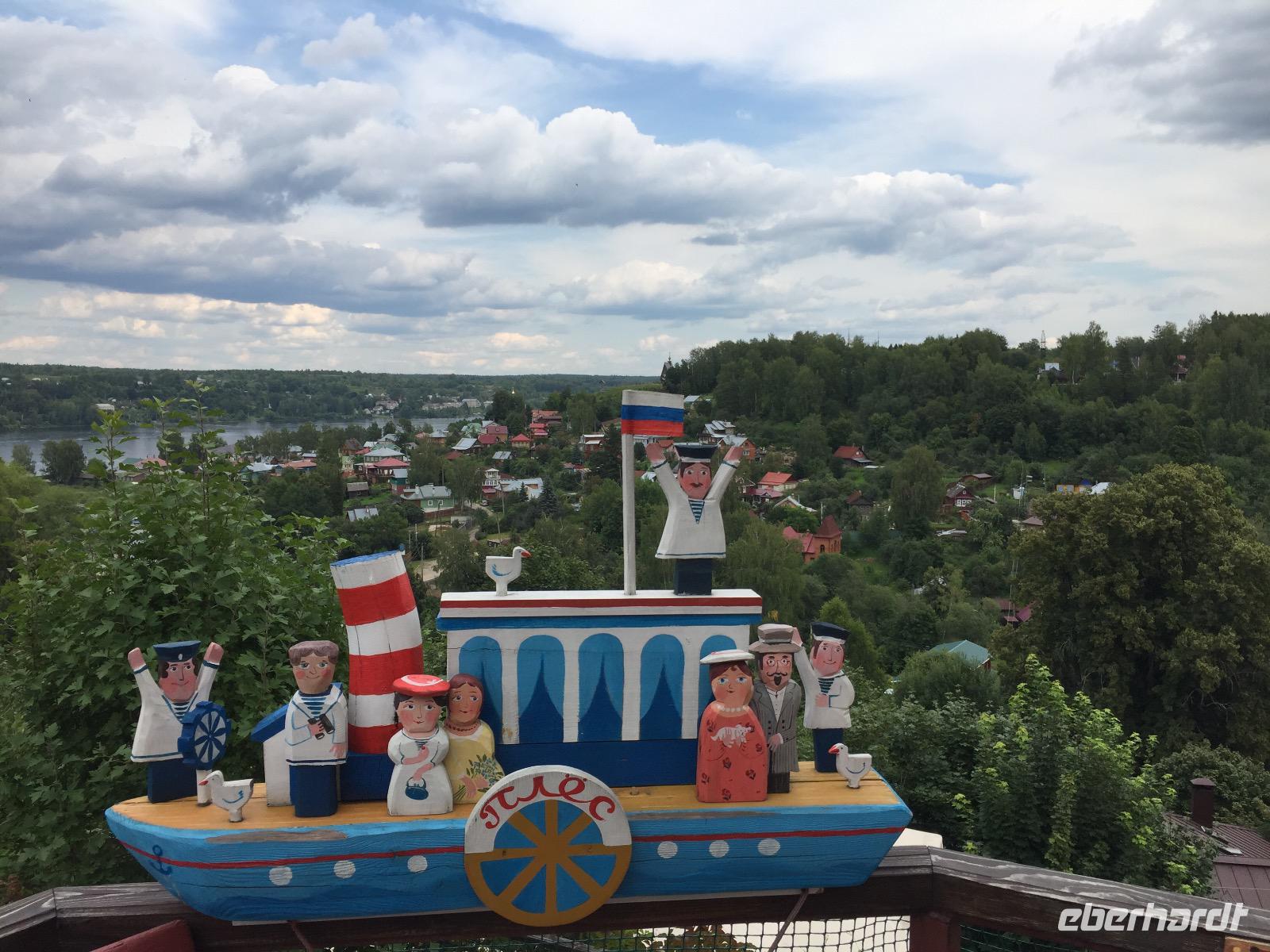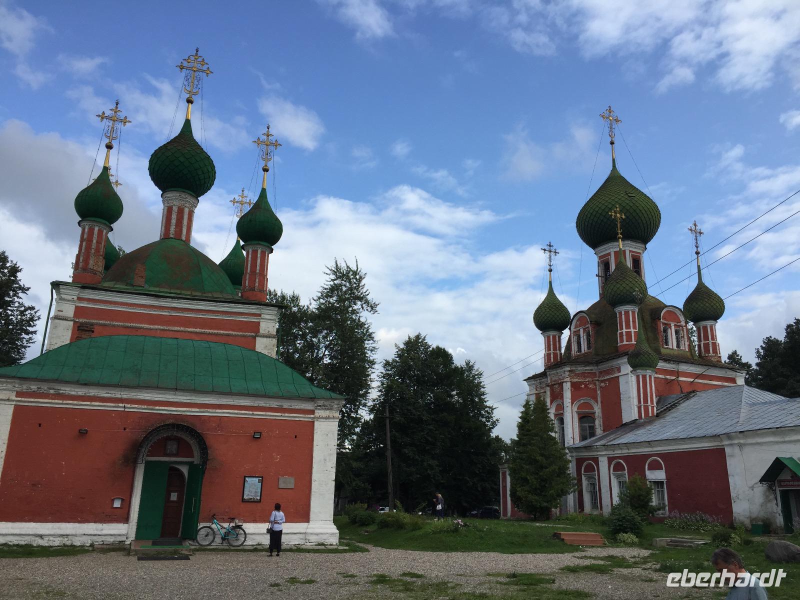 Nach einem Mittagessen in schönem Ambiente fuhren wir weiter nach Tutaew, einem Ort, der noch als Geheimtipp gilt und wo man sich besonders über unseren Besuch freute. Am liebsten hätte uns die Fremdenführerin alles gezeigt. Wir bewundern mit ihr von den Danilower Höhen aus den schönen Ausblick zur gegenüberliegenden Seite der Wolga mit ihren diversen Kirchen. In der Auferstehungskathedrale (Woskressenski Sobor) aus dem 17. Jhd., wo wir einige Minuten dem orthodoxen Gottesdienst bewohnen, sehen wir die Gläubigen unter der Ikone auf Knien hindurch kriechen. Der Besuch des kleinen Heimatmuseum wird uns von der Stadt geschenkt und gibt uns einen Einblick in die jüngere russische Geschichte der Stadt, die vor 1918 eigentlich aus den zwei Städten Romanow und Borisoglebsk bestand.