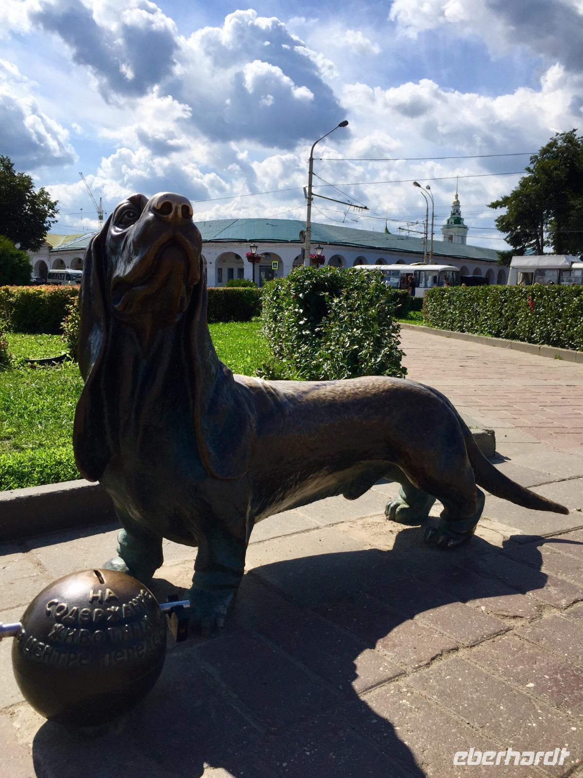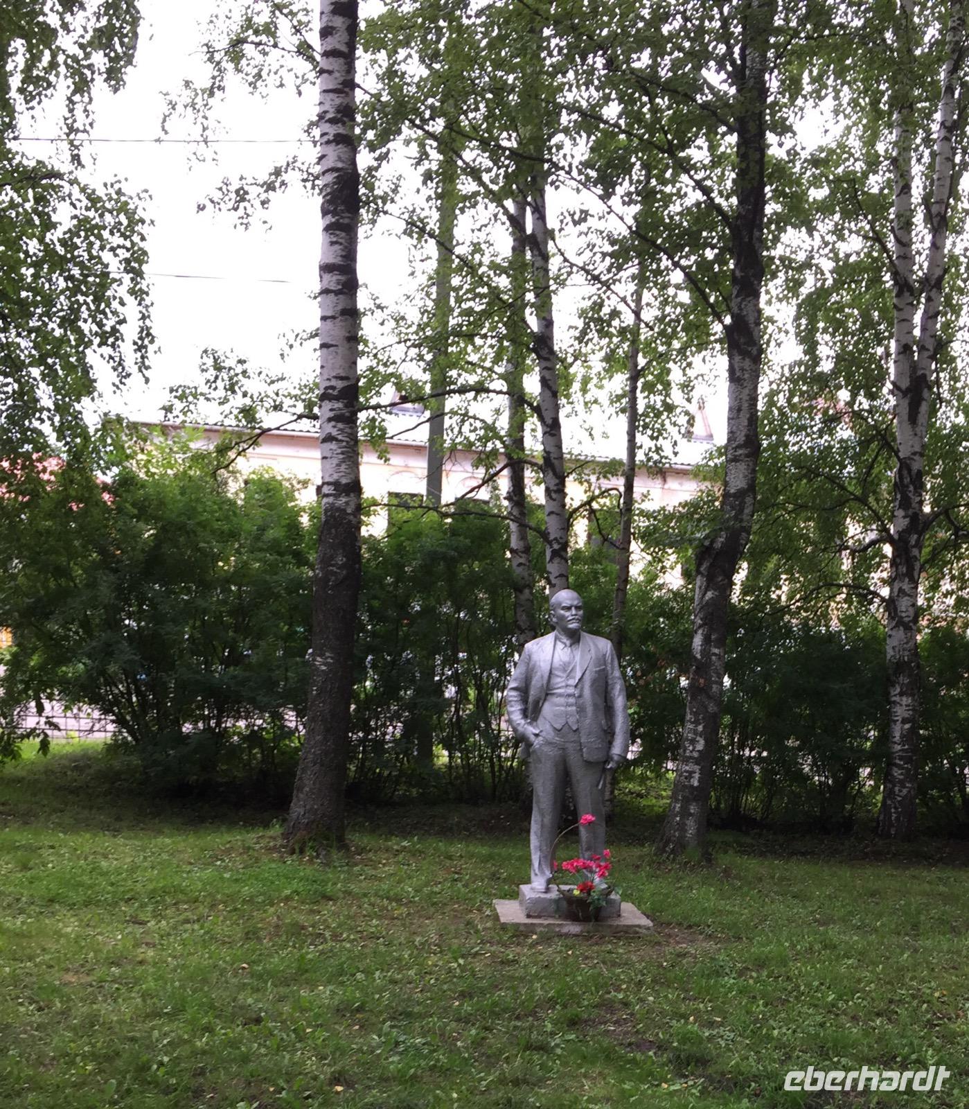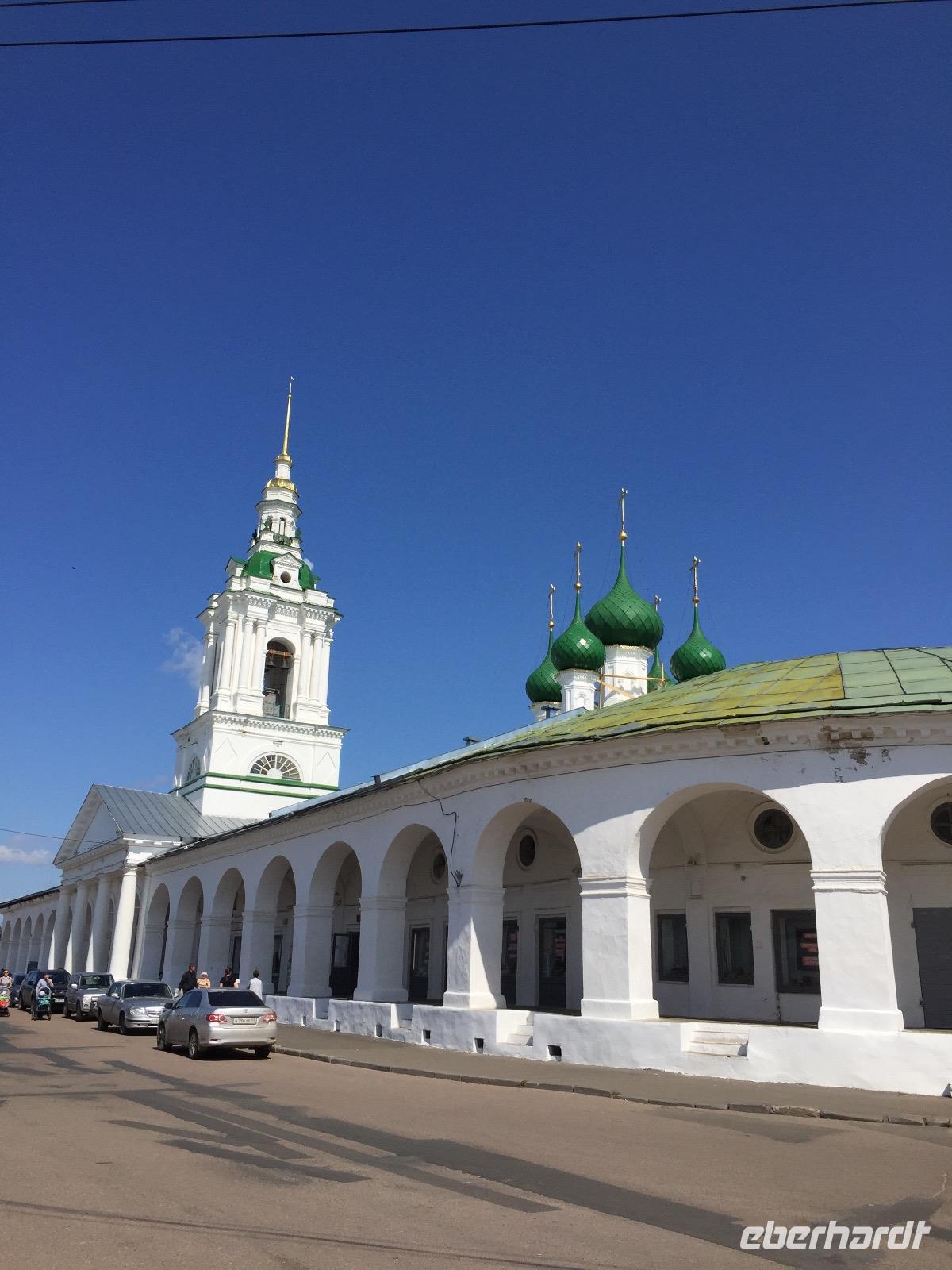 Die Stadt mit circa 300.000 Einwohnern mit finnisch-tatarischem Ursprung erhielt eine erste Erwähnung im Jahre 1213. Der Name bedeutet soviel wie Festung oder vielleicht ist sie auch nach der Fruchtbarkeitsgöttin Kostroma (Symbol der Weiblichkeit und der Erde) benannt worden. Hier begleitet uns die lustige Führerin Larissa, die mit ihrem feinen Humor die Geschichte der Stadt und die reizvolle Architektur erklärt. Entlang des Handelsreihen-Komplexes mit den Ende des 18. Jhds. erbauten Mehlreihen, Pfefferkuchenreihen und Fischreihen sowie der Erlöserkirche mit dem barocken Glockenturm. Als wir dann vor dem Lenin-Monument verweilen, welcher eigentlich auf dem Monument der Zarenfamilie steht, verweist sie darauf, das alle Statuen von Lenin in Richtung Zukunft zeigen. Nun hier weist er zum Gefängnis. Aber laut Larissa ist Lenin in anderer Hinsicht wichtig für den Tourismus der Stadt, denn er steht in der Nähe der Kreuzfahrtschiffs-Anlegestelle. Verirrt man sich bei einem Besuch Kostromas, braucht man nur nach Lenin fragen. Doch viel interessanter ist vielleicht die Feuerwehr mit ihrem, an einen Leuchtturm erinnernden Wachturm auf dem Sussanin-Platz, die kleinen Tierstatuen, die in der ganzen Stadt verteilt sind und der kleine Markt an dem wir vorbei schlendern und doch leider zu wenig Zeit für einen Bummel haben.