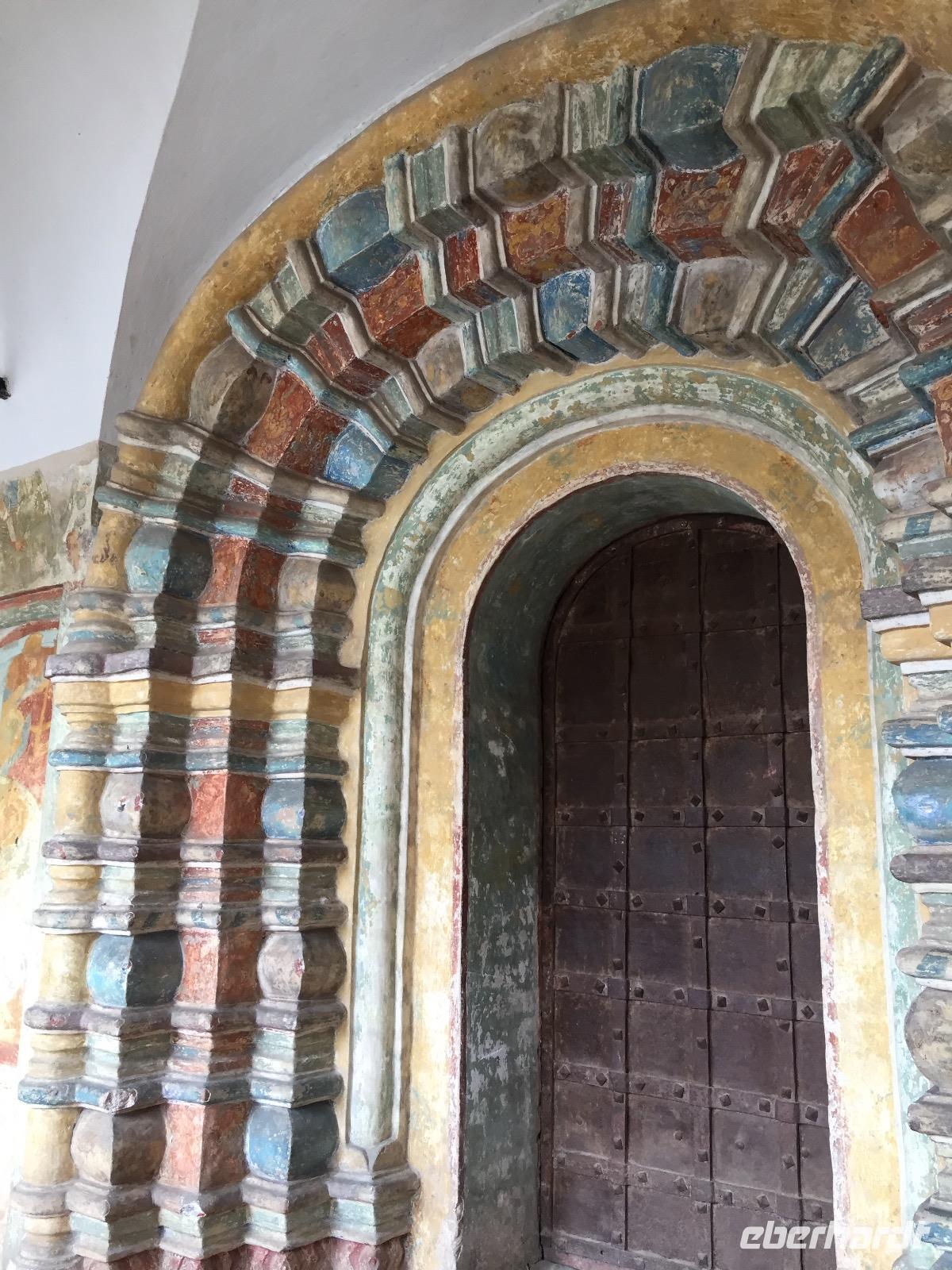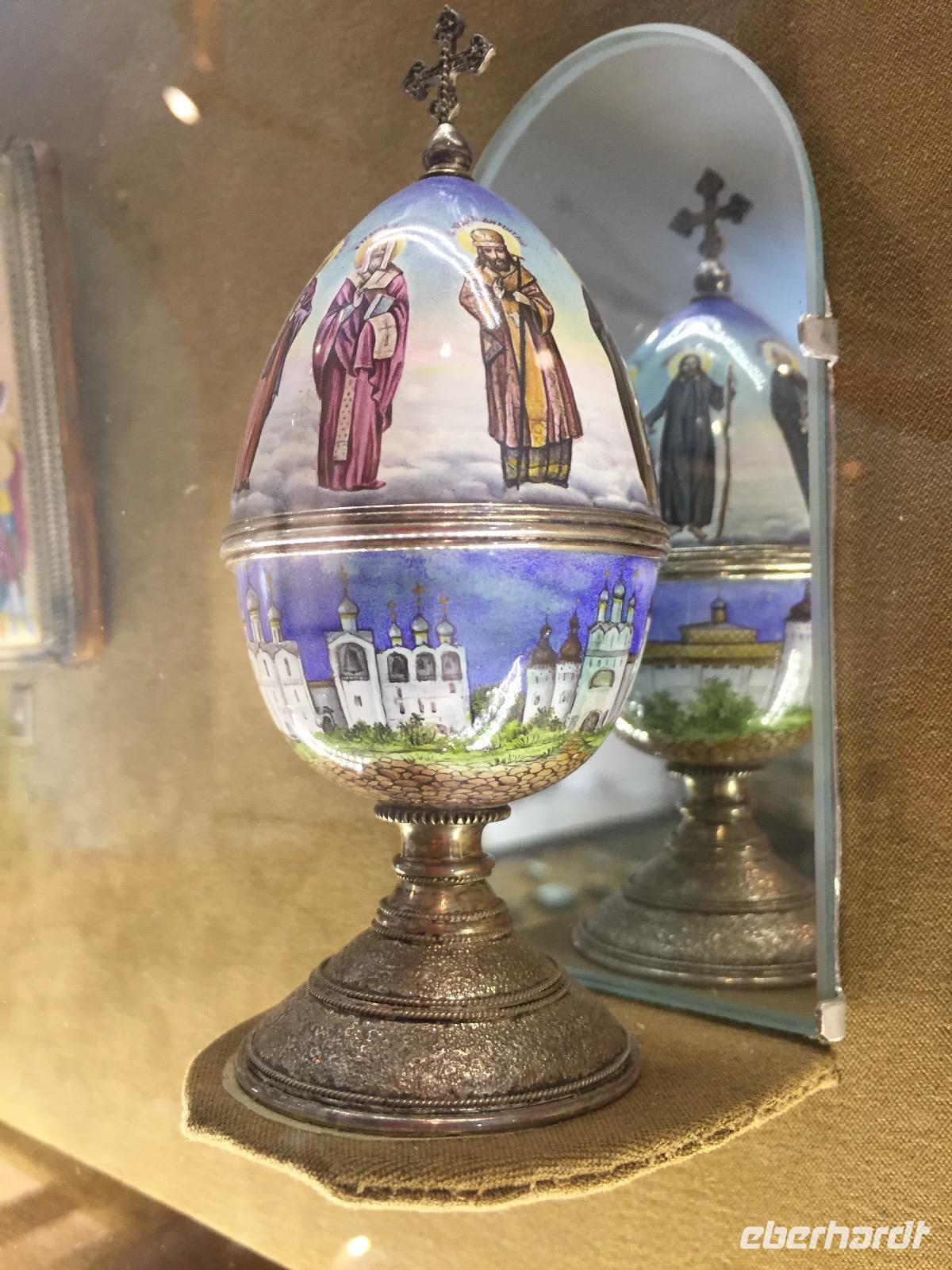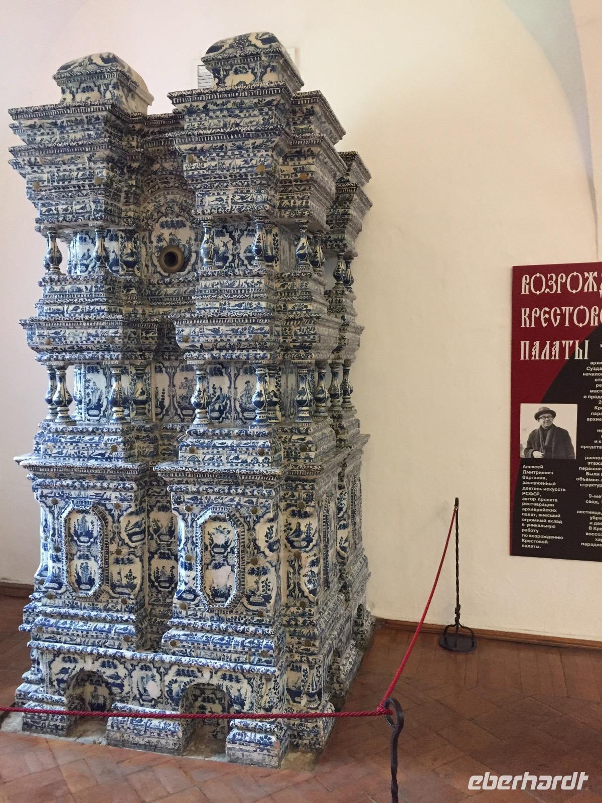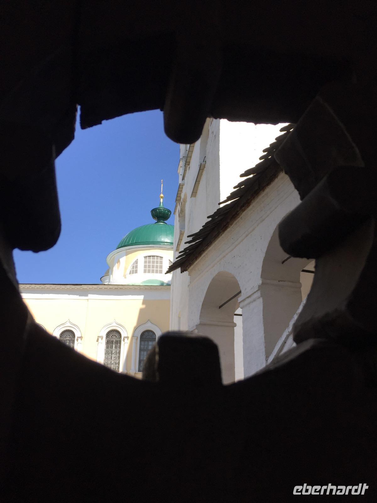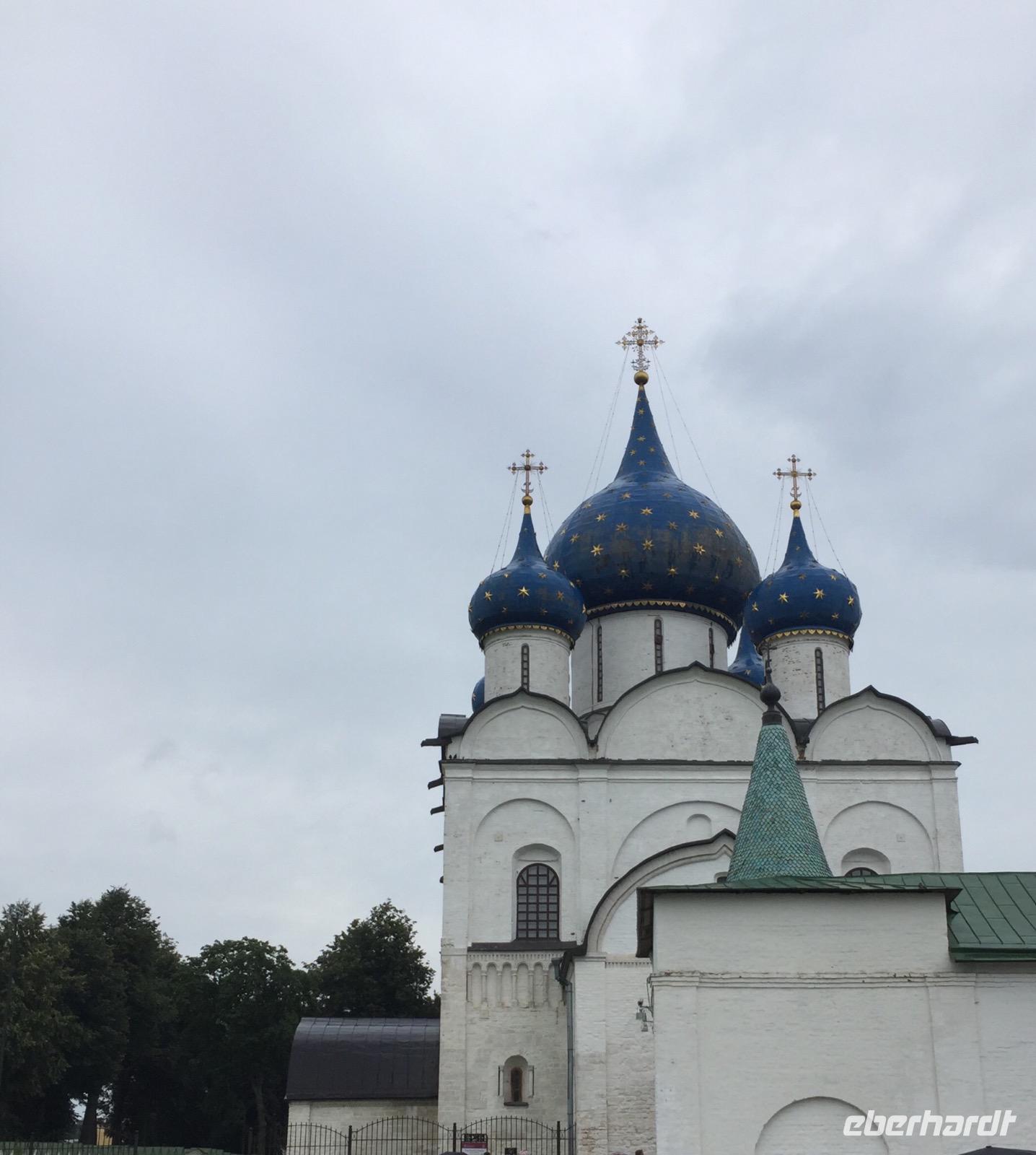 Ein entspannter Morgen lag vor uns, da wir den heutigen Tag ganz der kleinen Stadt Susdal widmeten, die im 7. Jahrhundert gegründet, eine der ältesten Ansiedlungen in Zentral-Russland ist. Mit unserem lokalen Guide Ilija begannen wir in Kidschenka, in der ältesten Steinkirche Russlands, wild-romantisch am Fluss Nerl gelegen. Erholsam für die Augen ist diese Kirche, weil weniger Pracht, aber einfache Schönheit zu sehen ist. Und man kann die Gepflogenheiten der orthodoxen Kirche verstehen lernen, z.B. runder Stein in der Mitte, der den Nabel der Welt symbolisiert, auf welchem der Priester predigt. Schon damals baute man die Kirche erdbebensicher, durch einen zweiten Rundbogen über den Fenstern und Türen erkennbar. Erstaunlich in einer Gegend, wo heftige Bewegungen der Erdoberfläche eher selten bis gar nicht vorkommen und Zerstörungen der Kirche vorrangig durch Menschenhand zustande kam.