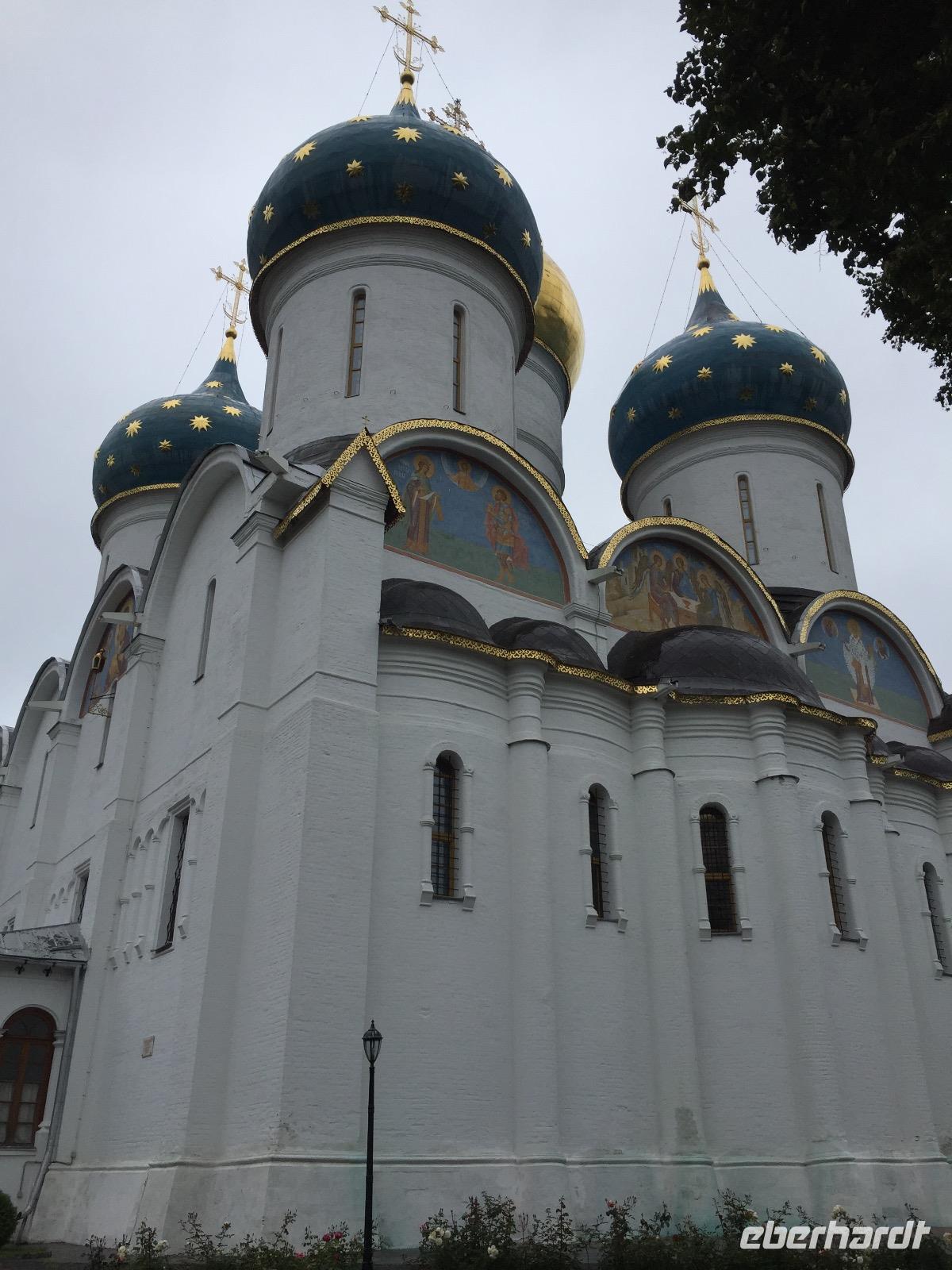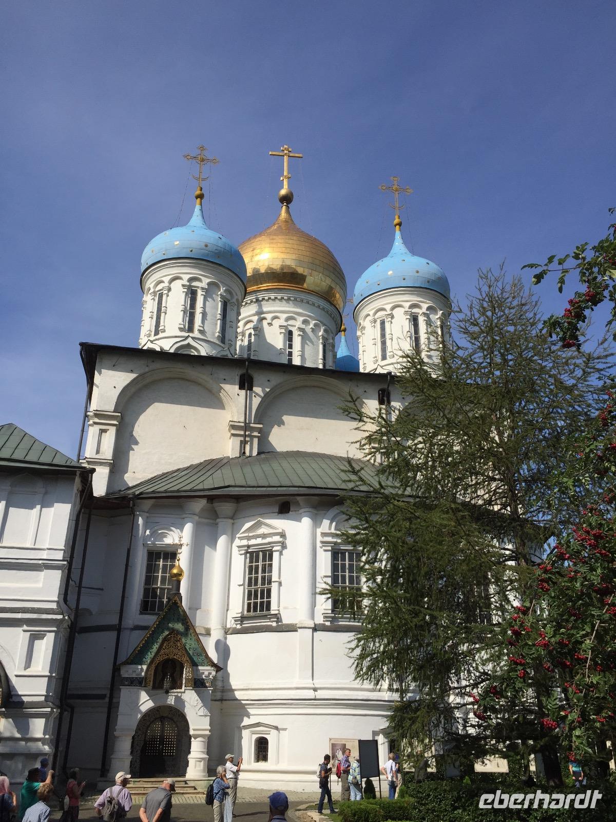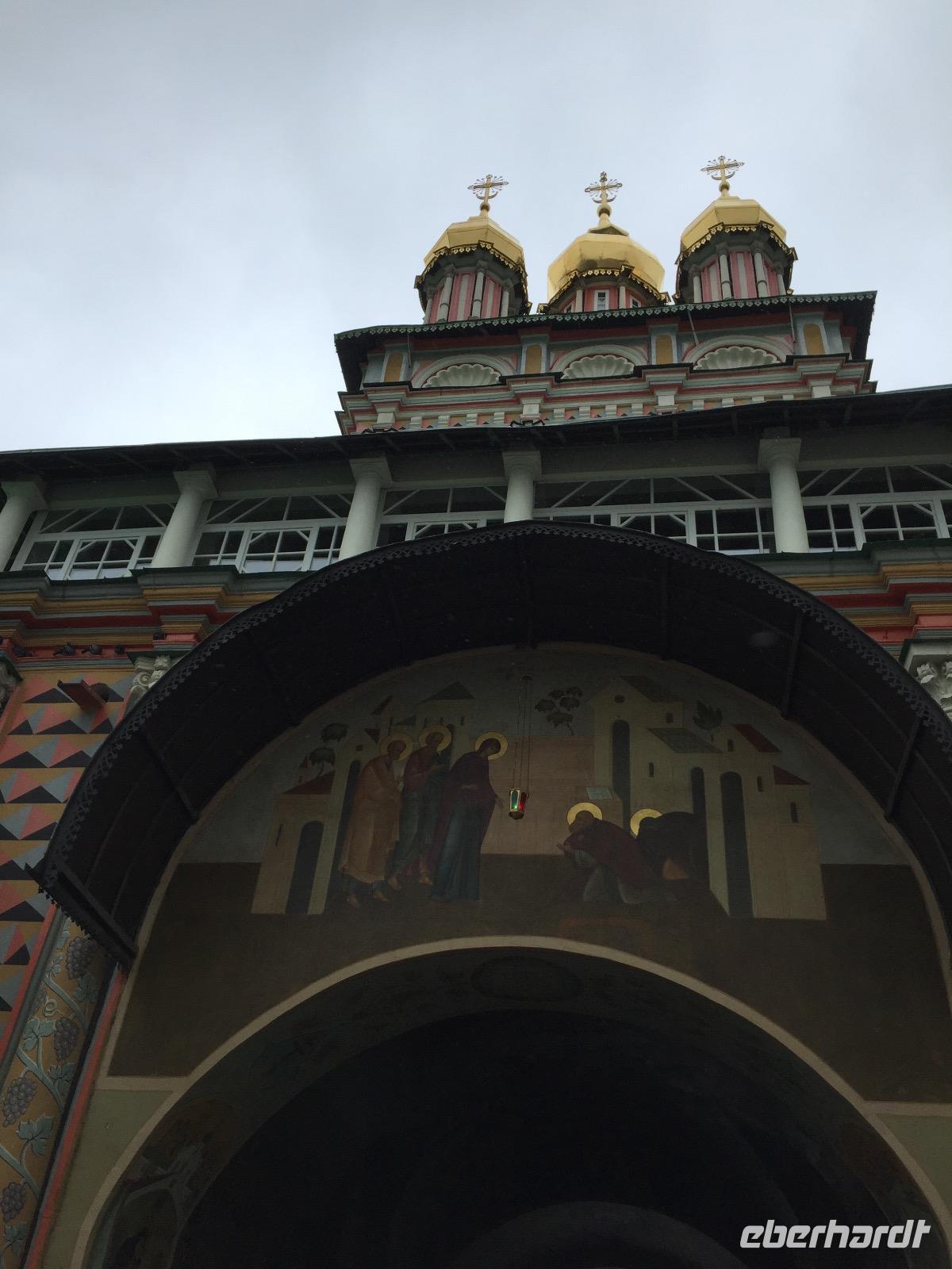 Bei Regen starteten wir in den ersten Reisetag mit unserer netten Fremdenführerin Oxana und dem stets auf unsere Sicherheit bedachten Busfahrer Victor. Das erste Ziel des Tages war das Dreifaltigkeitskloster des Heiligen Sergius in Sergijew Possad, einem der wichtigsten Zentren der russisch-orthodoxen Kirche und unser erstes UNESCO-Welterbe auf der Reise. Die Anfänge des Klosters reichen bis in die 1340er Jahre zurück als von dem Mönch Sergios von Radonesch und dessen Bruder hier eine kleine Holzkirche gebaut wurde, die den Grundstein zu dem heutigen beliebten Wallfahrtsort legte. Aber nicht nur dies verbindet man mit dem Kloster: der Zar Iwan IV. wurde hier im Jahr 1530 getauft, Peter, der Große suchte Zuflucht vor den Rebellen, die Kommunisten beschlagnahmten wertvolle Gegenstände und schlossen die Kirchen und Kathedralen. All diese Informationen, die Pracht und Schönheit des Klosters flog an uns vorüber, denn das nasskalte Wetter oder die vielen laut sprechenden chinesischen Reisegruppen erschwerten es uns, zu geniessen oder auch die Spiritualität des Ortes zu erfassen.
