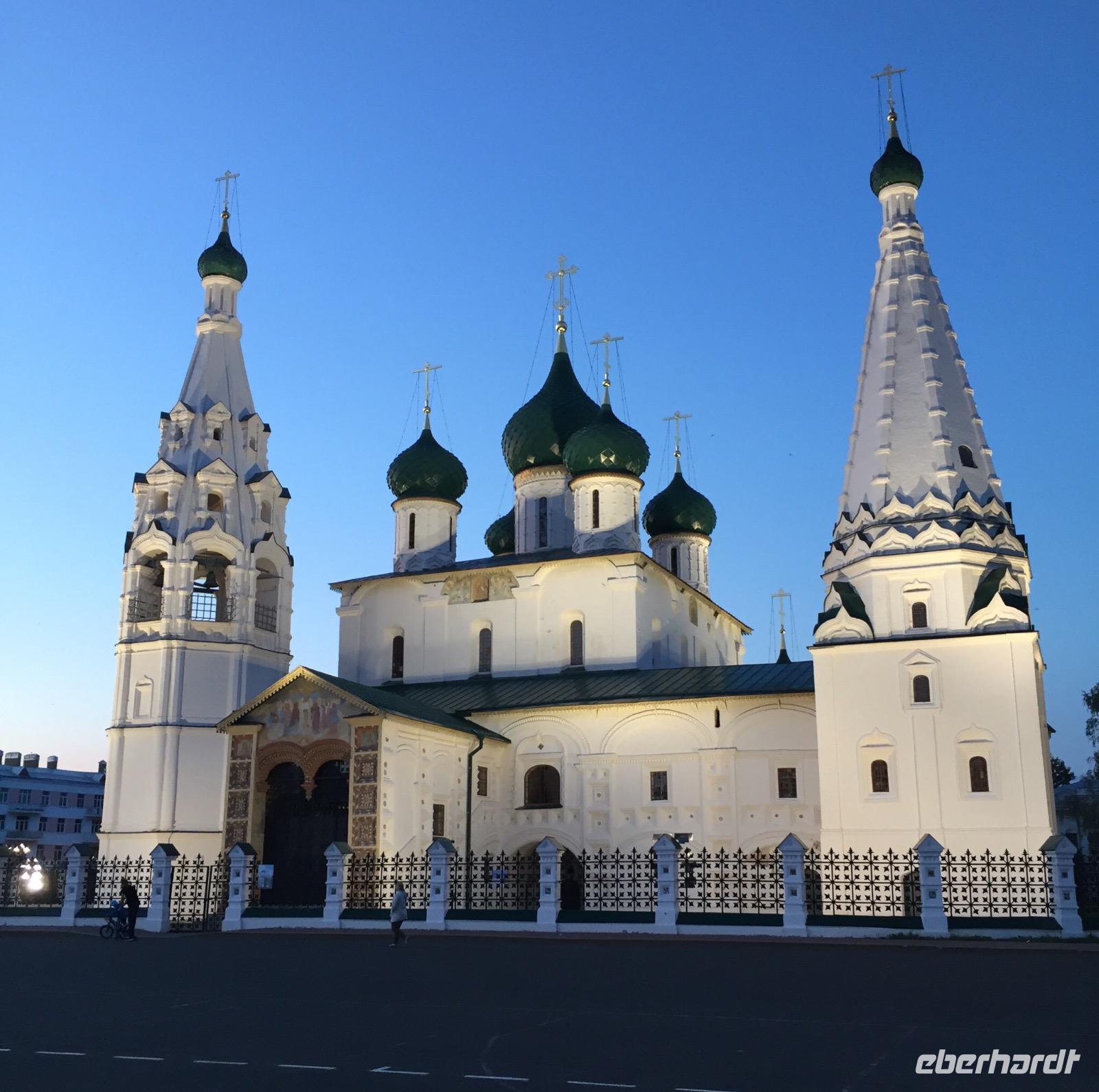 Die wohl schönste Kirche Jaroslawl bei Tag und Nacht scheint mir die Prophet-Elias-Kirche, mit vier Pfeilern, fünf grünen Zwiebelkuppeln und zwei Zeltdach-Türmen, die von einer reichen Kaufmannsfamilie in Auftrag gegeben wurde, die Zobel und andere Pelze an den Zarenhof lieferte. Im Inneren der Kirche zeigen Fresken das Leben des Propheten Elias.
