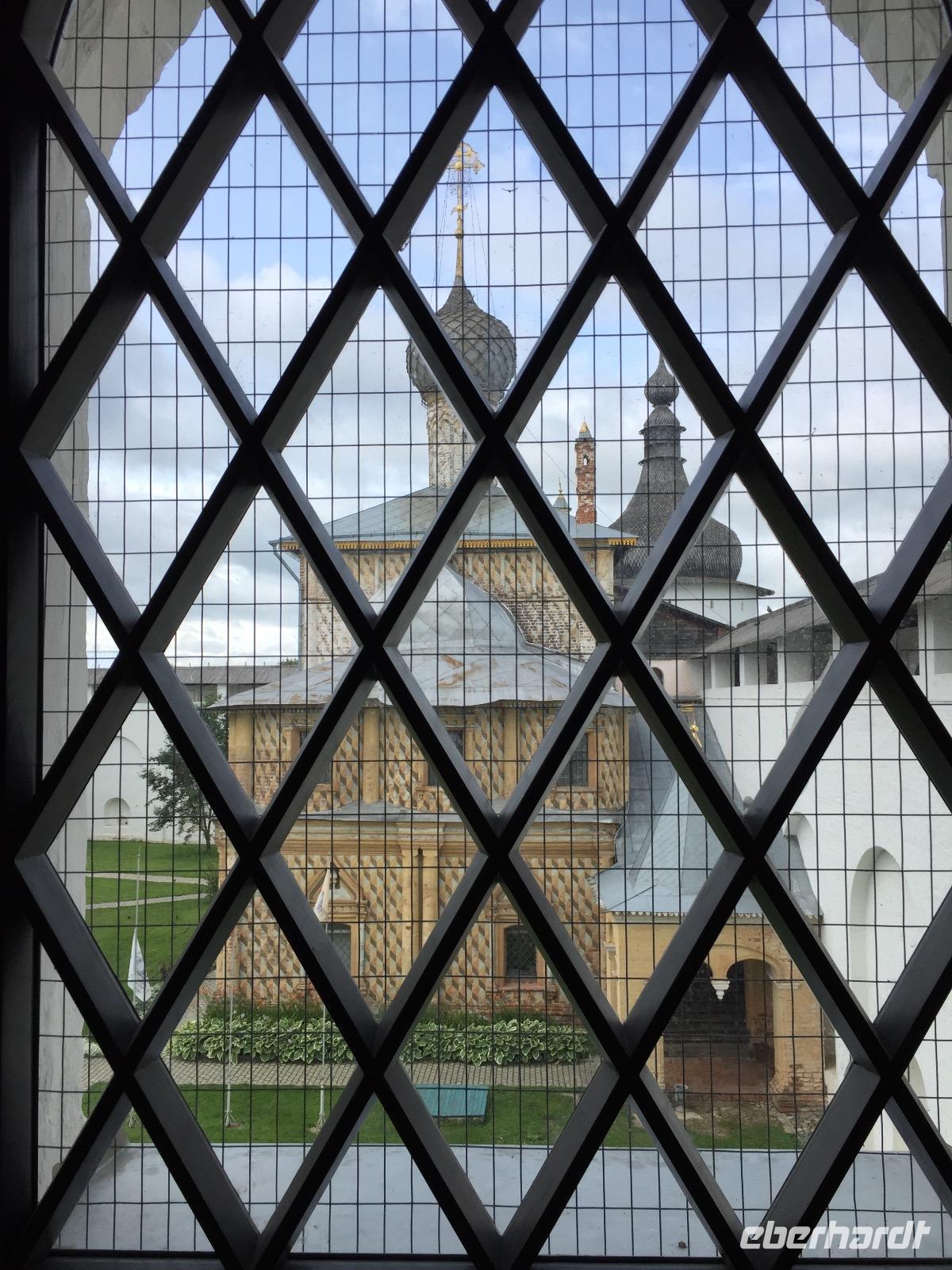 Leider viel zu schnell müssen wir uns vom Hotel in Peresslawl Salesski verabschieden, aber auf uns wartet bereits das 862 gegründete Rostow Weliki, mit einer kundigen Führung durch den dortigen Kreml. Im übrigen wissen wir nun, dass es nicht nur in Moskau einen Kreml gibt, sondern in vielen altrussischen Städten steht oft die kleine Zitadelle, eine in sich abgeschlossene Festung mit einer Kirche mit den typischen Zwiebeltürmen. Der Kreml in Rostow ist mit knapp 350 Jahren ein junges Bauwerk, wurde als Residenz für die orthodoxen Metropoliten von Rostow und Jaroslawl am malerischen Nero-See gebaut. Schon von weitem grüßten uns die silbernen Kuppeln der weißen Uspenski-Kathedrale und der Auferstehungskirche.