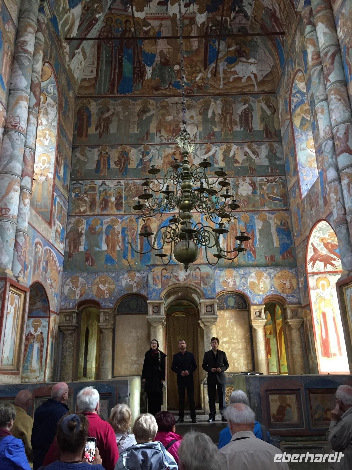An der Stelle des Todes des jungen Zarewitsch baute man später die Dimitri-Blutskirche, vor der wir jetzt stehen. Noch viele weitere solcher Details erfuhren wir auch beim Besuch des Zarenpalais. Ein wenig Zeit zum Entspannen blieb uns bei dem exzellenten Gesang eines Männerchors, der uns noch ein wenig länger verzaubern hätte können.
