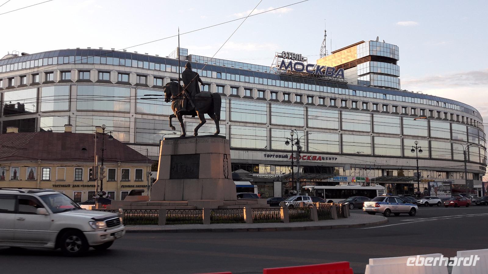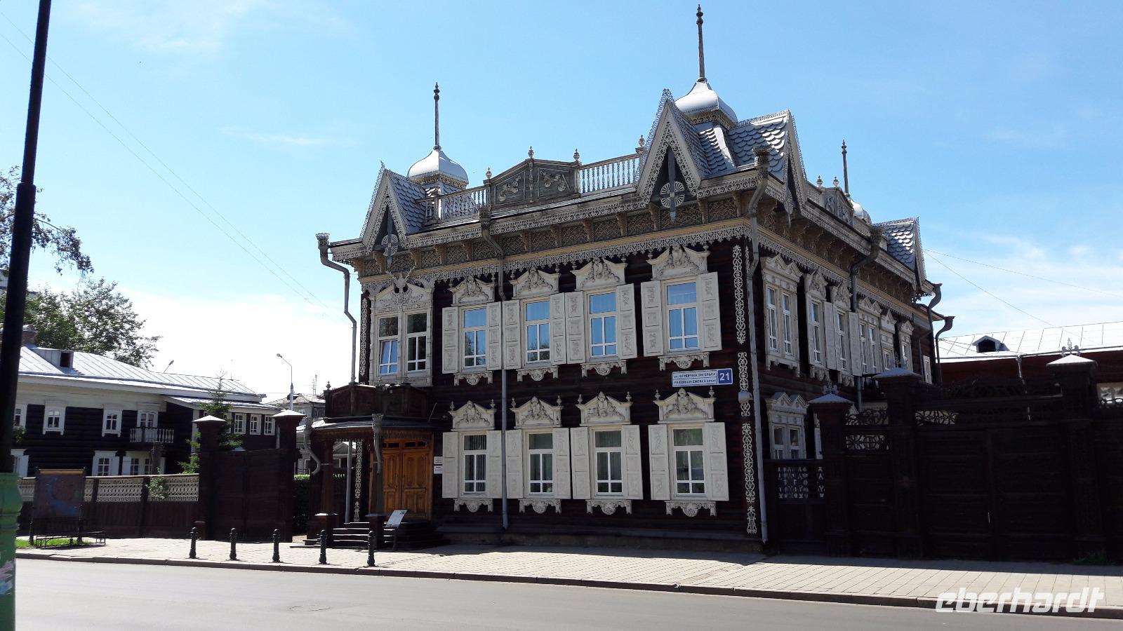 Wir anschauen die Gotteserscheinungskathedrale, rekonstruierten Erlöserkirche mit bedeutenden Außenfresken aus der Zeit der Christianisierung der Burjaten. Unsere Rundfahrt führte uns durch Straßen mit erhalten gebliebenen sibirischen Holzhäusern voller geschnitzten Verblendungen und Fensterrahmen - am schönsten das Europahaus.