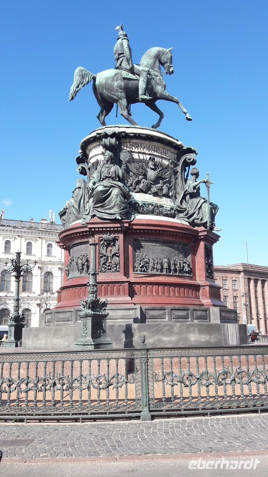 Dann fahren wir weiter und machen ein Fotostopp am Isaak-Platz, der nach der nahegelegenen Kathedrale benannt ist. Der Blickfang ist das Reiterdenkmal von Nikolaus I. Am Postament erkennt man die Töchter und die Gattin von Nikolaus I und das Relief stellt verschiedene Stationen seiner Regentschaft dar.
