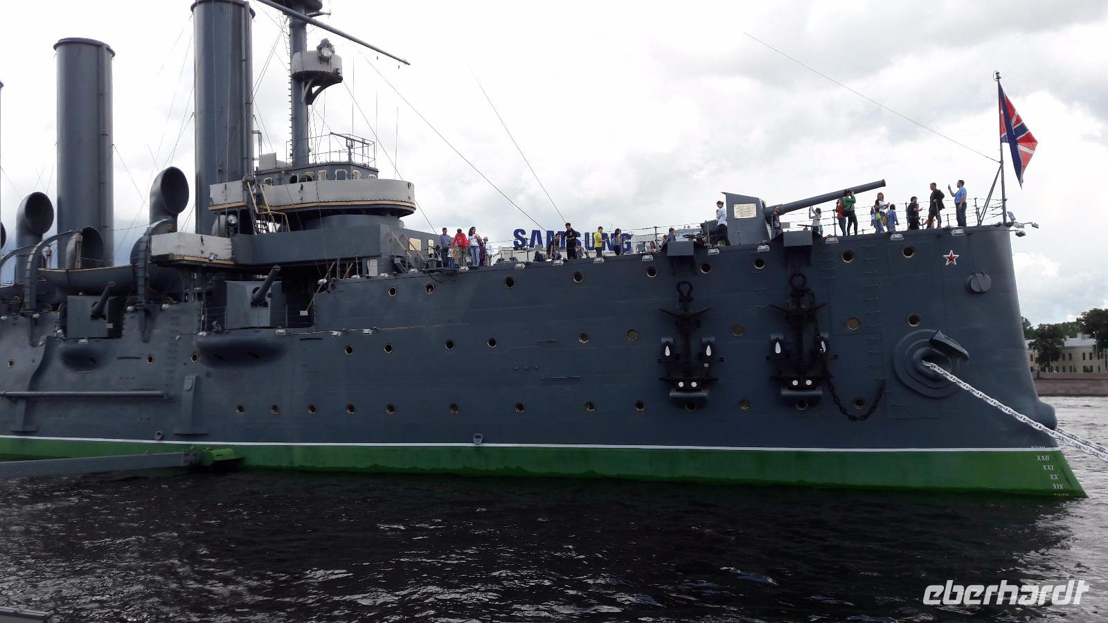 Wir sind mit unserem Rundgang in der Peter-Paul-Festung nun zu Ende und fahren zum legendären 1900 gebauten Panzerkreuzer Aurora, der am 25. Oktober 1917 mit seinem Kanonenschuss den Sturm auf den Winterpalast und die Machtübernahme der Bolschewiki auslöste.