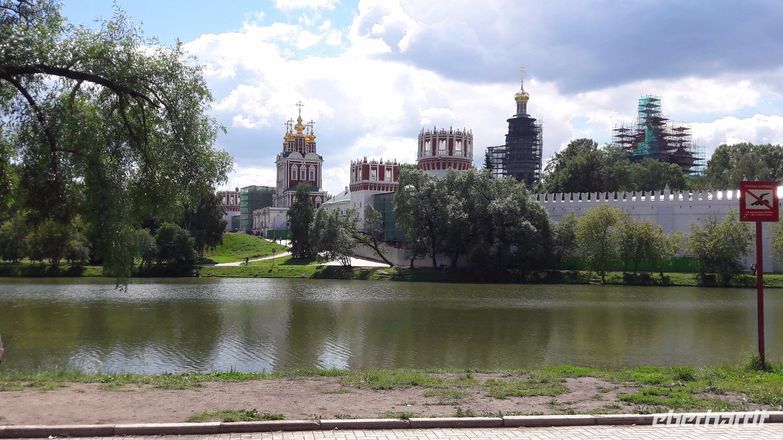 Zwischen dem Jungfrauen-Kloster und dem Moskwa-Fluss erstreckt sich ein kleiner gemütlicher Park mit zwei Teichen und malerischen Brücken dazwischen. Weiße Klostermauern und Trauerweiden reflektieren sich auf der Oberfläche des Wassers.