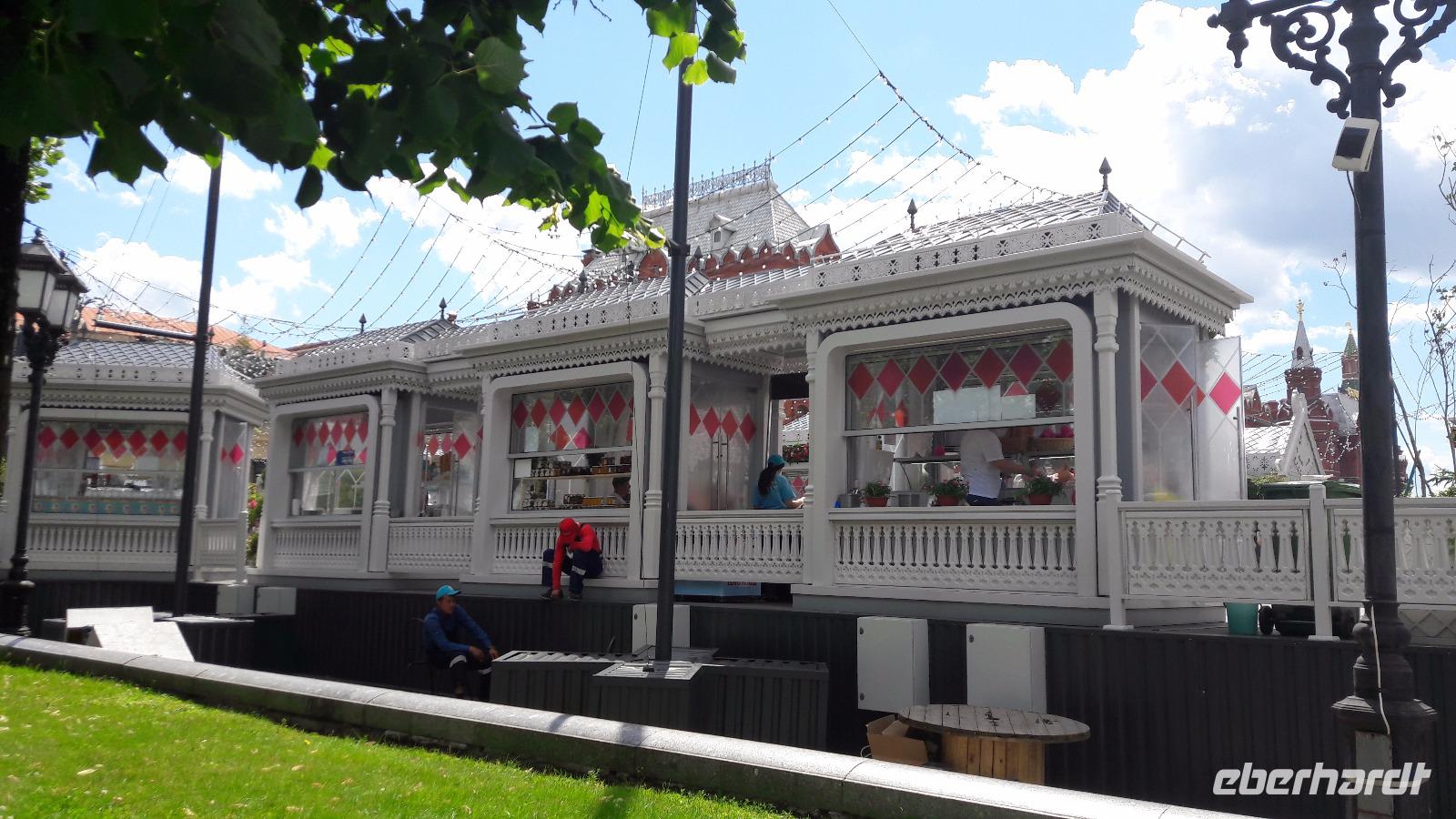 Wir bummeln durch die prächtigen, herrlich verzierten Gänge, bewundern Springbrunnen, einen Wintergarten, einen kleinen Bach oder... ja auch eine historische Toilette. Auf der dritten Ebene befinden sich etwas preiswertere Cafes und Fastfood-Restaurants. In einem Cafe stärken wir uns mit russischen Piroggen mit verschieden Füllungen, trinken Bier und sind bereit den Kreml zu erkundigen.