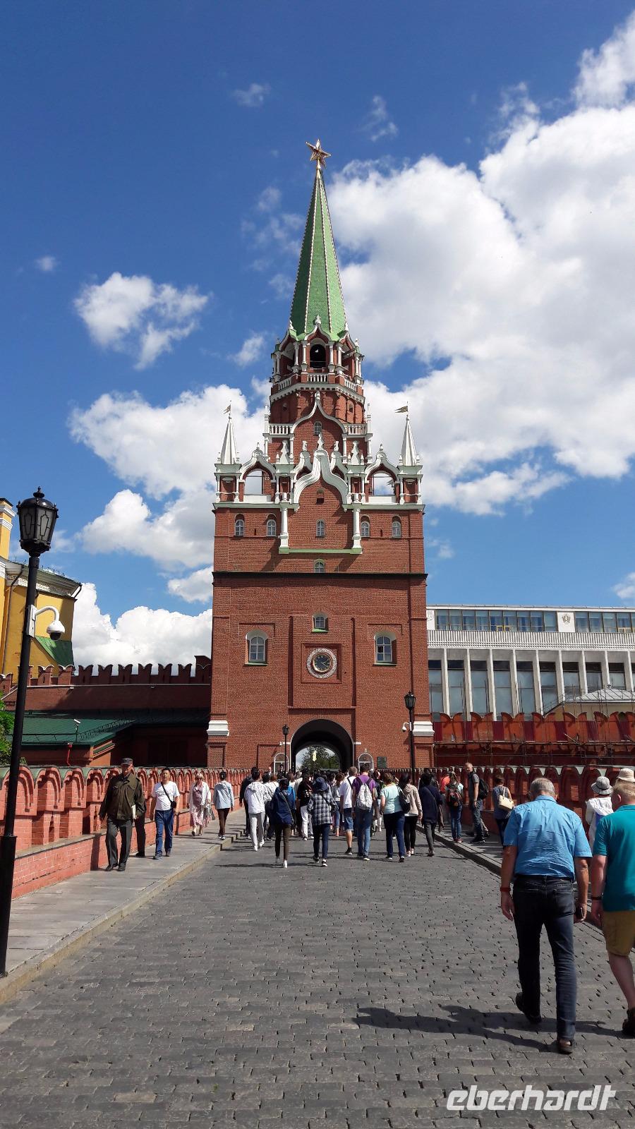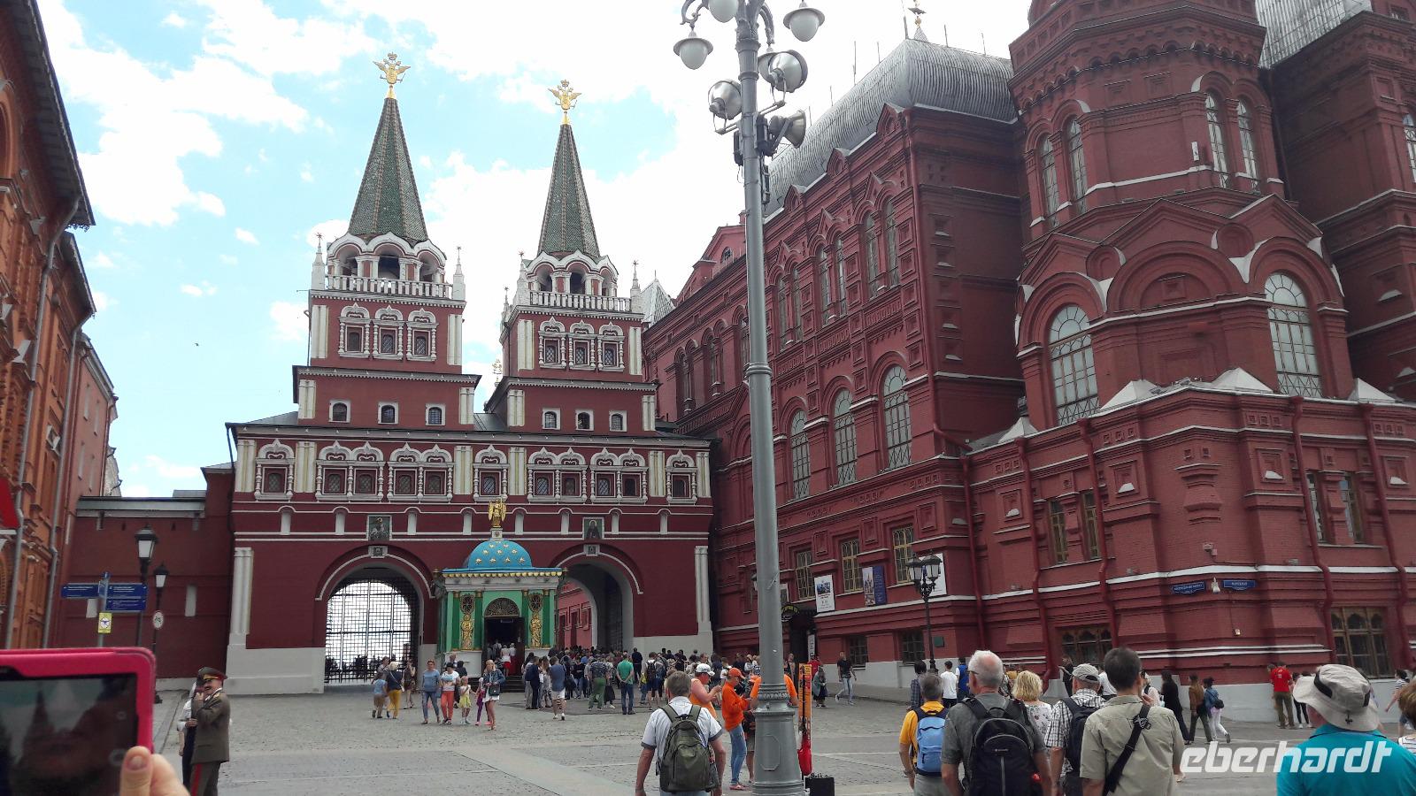 Jetzt steht der Kreml auf dem Programm. Wir steigen am Roten Platz aus und gehen vorbei am Reiterdenkmal des Marschalls Schukow, schreiten durch das eindrucksvolle Auferstehungstor. Auf der anderen Seite des Tors eröffnet sich uns dann endlich der Rote Platz. Dieser ist übrigens gar nicht rot, der Name kam durch eine mehrdeutige Übersetzung zu Stande, denn „rot" und „schön" sind im Russischen etwa gleich zu übersetzen. „Schön" trifft es dann auch besser als „rot".