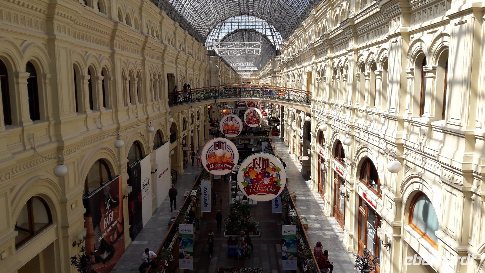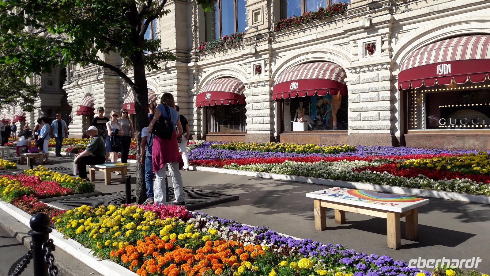 Gegenüber der Kremlmauer steht eine Prachtbau, der keineswegs ein Regierungsgebäude ist, sondern ein über 100-jähriges Kaufhaus, das GUM. Die Verkaufsläden sind auf drei Etagen in Galerien angeordnet und über Jungendstilbrücken zu erreichen. Eines der schönsten Kaufhäuser, die ich je gesehen habe! Es hat nur einen Nachteil: die Waren, die hier angeboten werden, sind fast unerschwinglich.