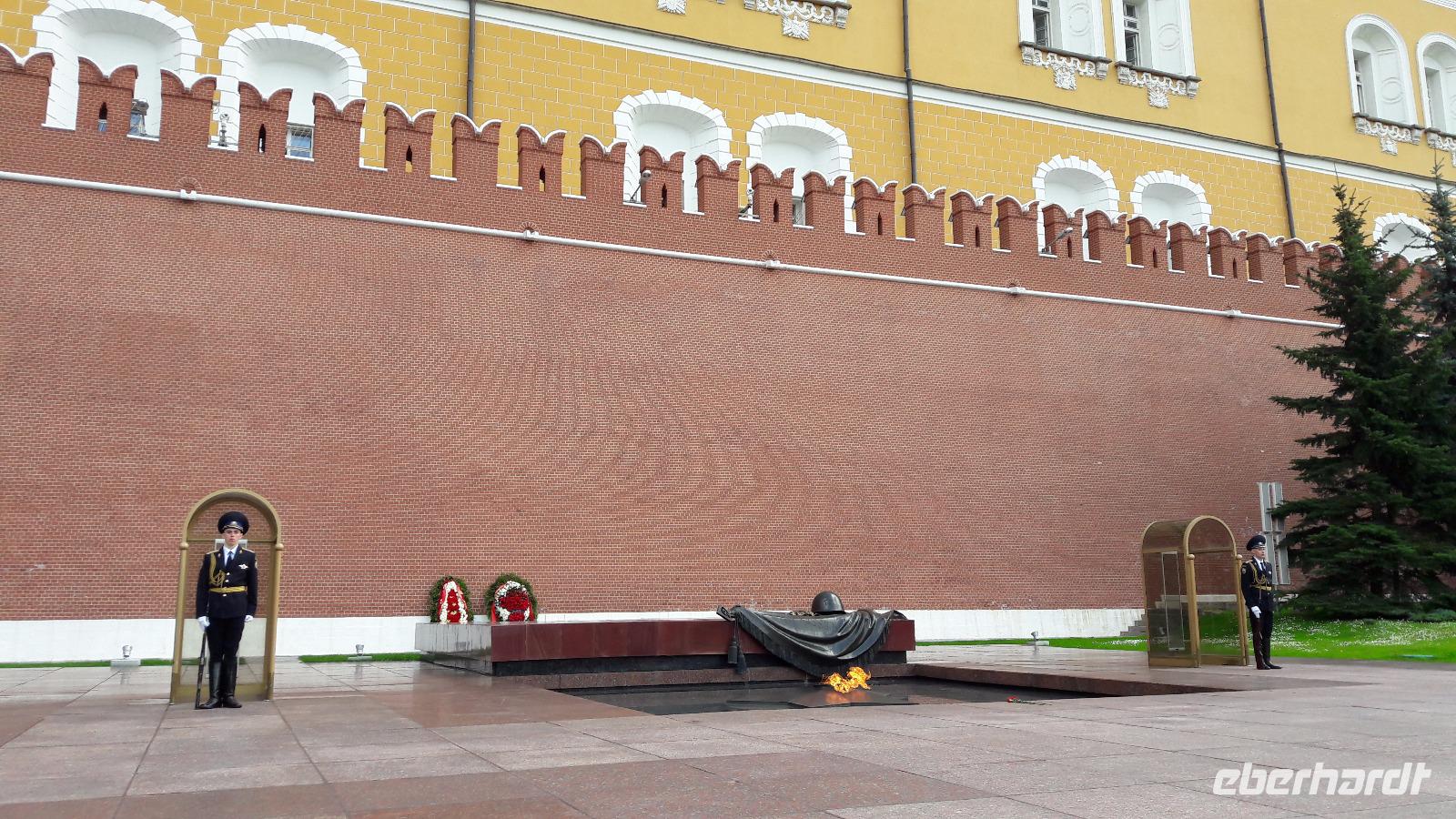 Nach einer Stunde Wartezeit in einer langen Besucherschlange sind wir auf dem Weg zu Lenins Mausoleum. Bevor wir es eintreten, passieren wir die Nekropole in der Kreml Mauer, in welcher ehemalige russische Präsidenten wie Stalin, Chernenko, Brezhnev, Andropov oder andere russische Berühmtheiten wie Kosmonaut Yuri Gagarin begraben sind.