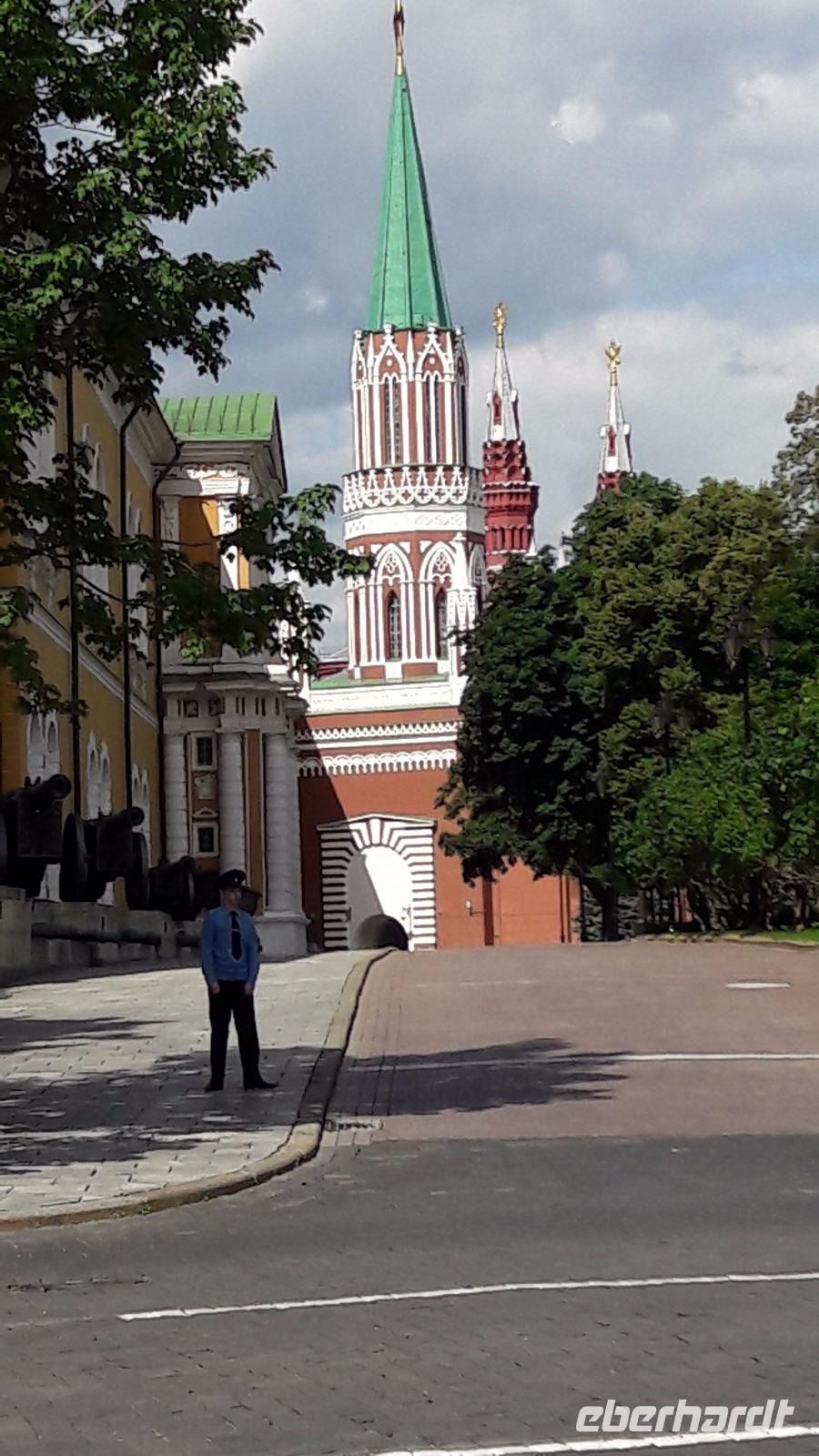 Wir spazieren durch den Alexandergarten in das Kreml-Gelände. Auch hier passierten wir eine Sicherheitskontrolle bevor wir in das Gelände durften. Als wir den Eingang über eine Brücke passiert haben, sind wir überrascht, wie wenig im Kreml los ist. So haben wir freie Sicht auf das Senatsgebäude und über den Platz Iwan des Großen.