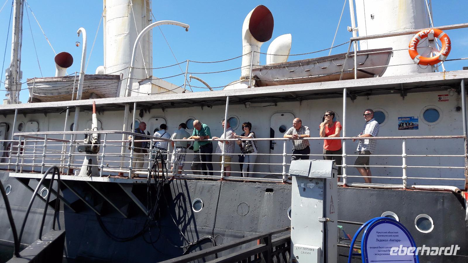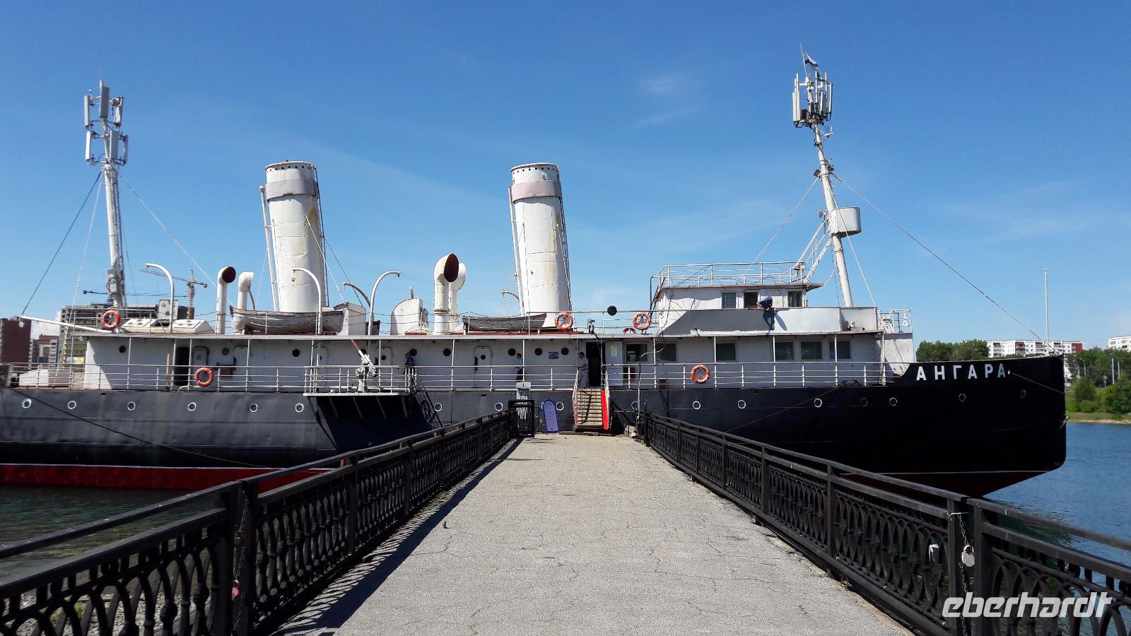 Wir fuhren an den südlich der Stadt gelegenen Stausee. Hier liegt der Eisbrecher "Angara", der älteste Eisbrecher der Welt wurde erstmals im Jahr 1900 eingesetzt. Gebaut wurde das Schiff in der Werft in New Castle im Auftrag des Komitees zum Bau der sibirischen Eisenbahn. Während der Gleisarbeiten wurden Wagons mit einem Dampfschiff transportiert, dessen Weg der Eisbrecher freimachte. Wir besichtigten den Kesselraum und staunten, dass eins von damals zwölf gebauten Schiffen noch erhalten ist.