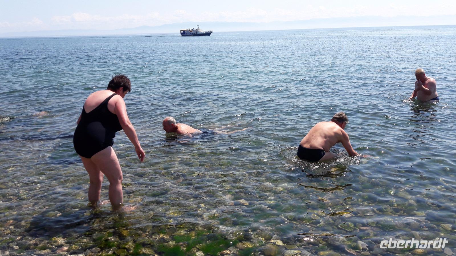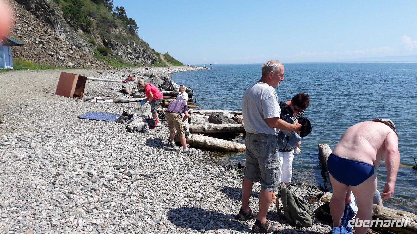 Bei der Ankunft im Hotel „Krestowaja Pad" hat uns die Reisegruppe „Transsibirische Eisenbahn" von Eberhardt Travel herzlich begrüßt. Nach dem kurzen Austausch von Reiseerlebnissen stellten wir unsere Koffer an der Rezeption ab und fuhren weiter zur Anlegestelle. Mit der Fähre erfolgte der Transfer über Angara nach Port Baikal.