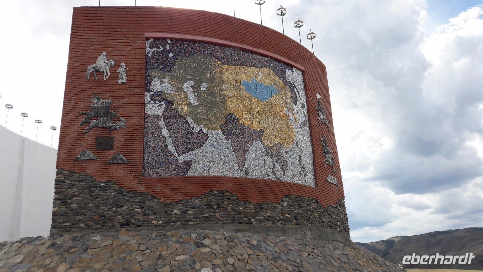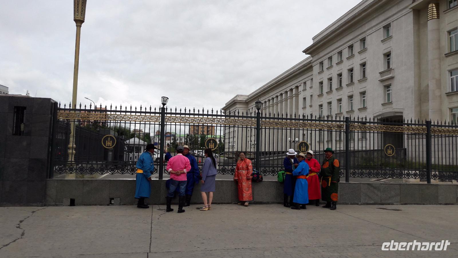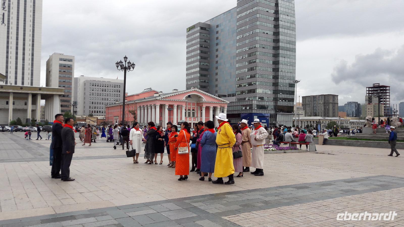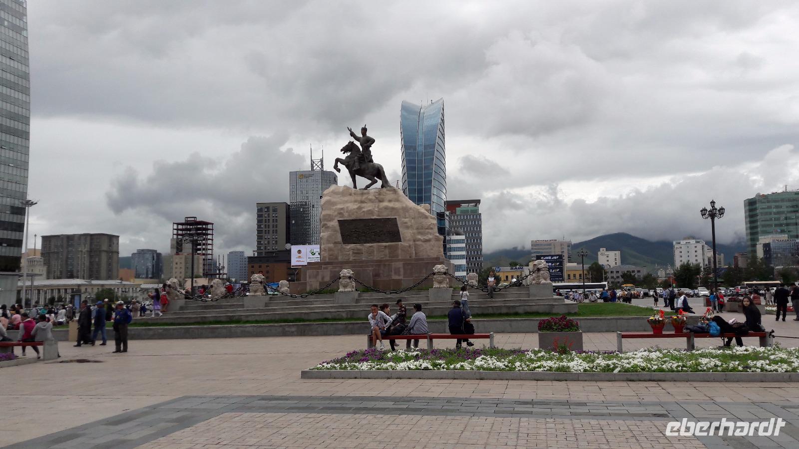 Wir fahren jetzt zum Hauptplatz - Suche Bator-Platz. Es ist der zentrale Platz der Hauptstadt und ist nach dem kommunistischen Staatsgründer benannt, der 1921 gegen China mit russischer Unterstützung den Kampf für den Kommunismus und die mongolische Eigenstaatlichkeit für die damalige äußere Mongolei führte. In der Mitte des Platzes steht sein Reiterdenkmal. Rund um den Suche Bator-Platz reihen sich interessante und schöne Gebäude, das Parlamentsgebäude, vor dessen Eingangsbereich der Herrscher des Mongolischen Weltreiches Dschingis Khan wie ein Buddha trohnt (Dschingis Khan Memorial). Auf der Ostseite erheben sich der Zentrale Kulturpalast und das Operntheater, das Nationalmuseum für Geschichte. Ewas weiter südlich befindet sich die Staatsbibliothek und das rote modern-klassizistische Nationaltheater.