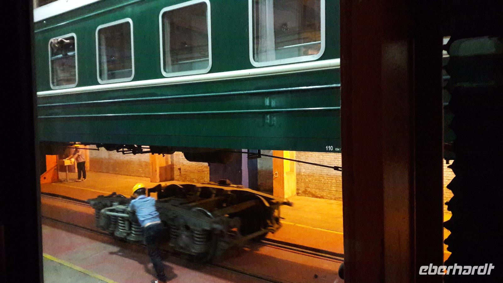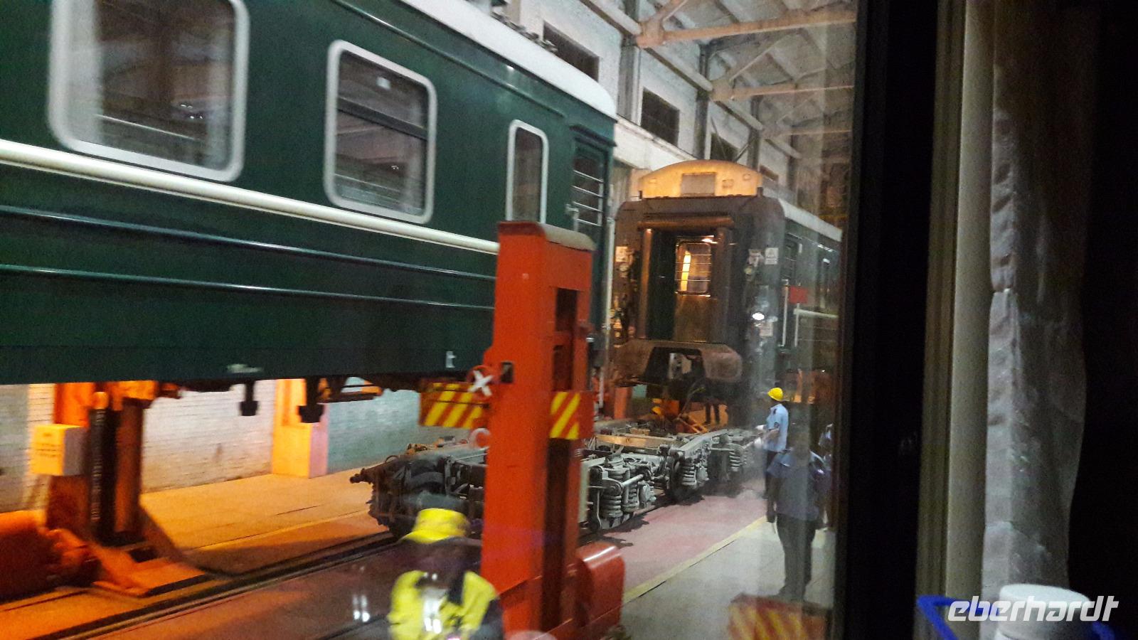 Nach einer Weile wurden die Waggons in die schon erwähnten langen und großen Umspurhallen zurückgeschoben. Es erfolgte eine Umspurung von der breiteren russischen und mongolischen Spur auf die engere chinesische Spurweite. Dazu wurden die Fahrgestelle der Waggone entriegelt, die Waggons gehoben und auf die neu eingeschobenen chinesischen Fahrgestelle wieder aufgesetzt. Wir haben uns dabei im Waggon aufgehalten und interessant war es, das Vorgehen auf dem Nebengleis beobachten zu können. So konnte man die technische Handlung aus dem eigenen Waggon von oben und beim anderen von unten her zu sehen.
