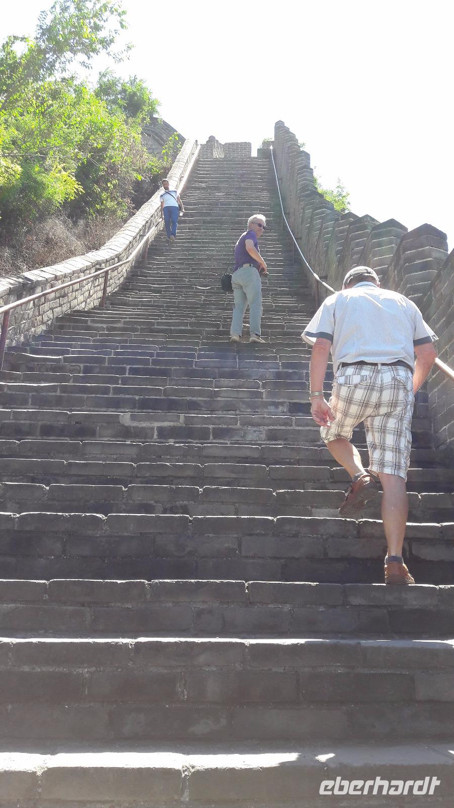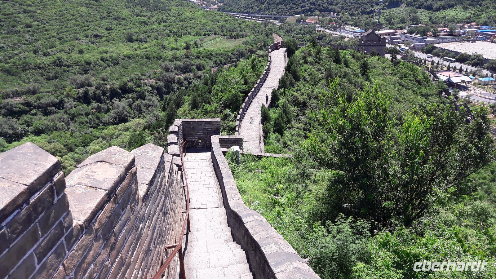 Dieser Abschnitt der chinesischen Mauer hat es in sich. Sie „beginnt" im Tal und geht dann ziemlich steil den Berg hinauf.