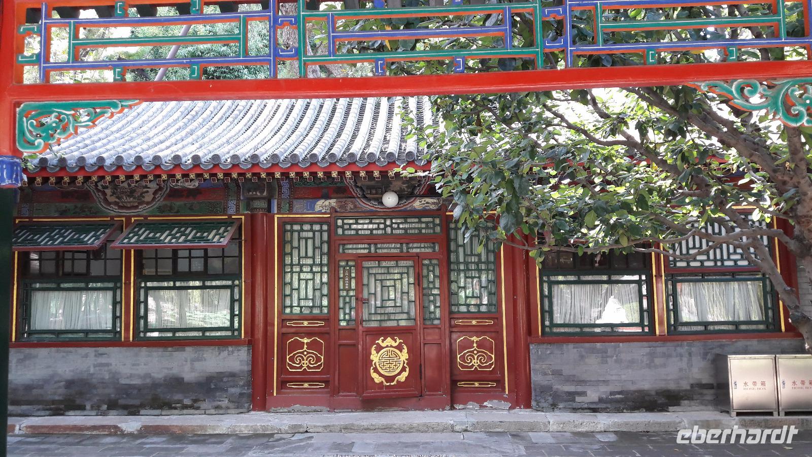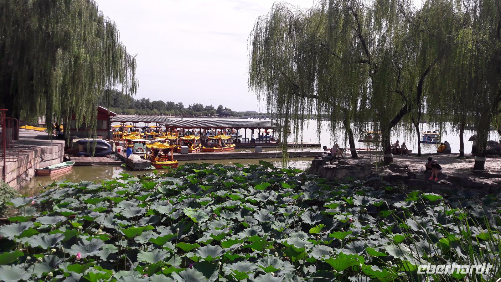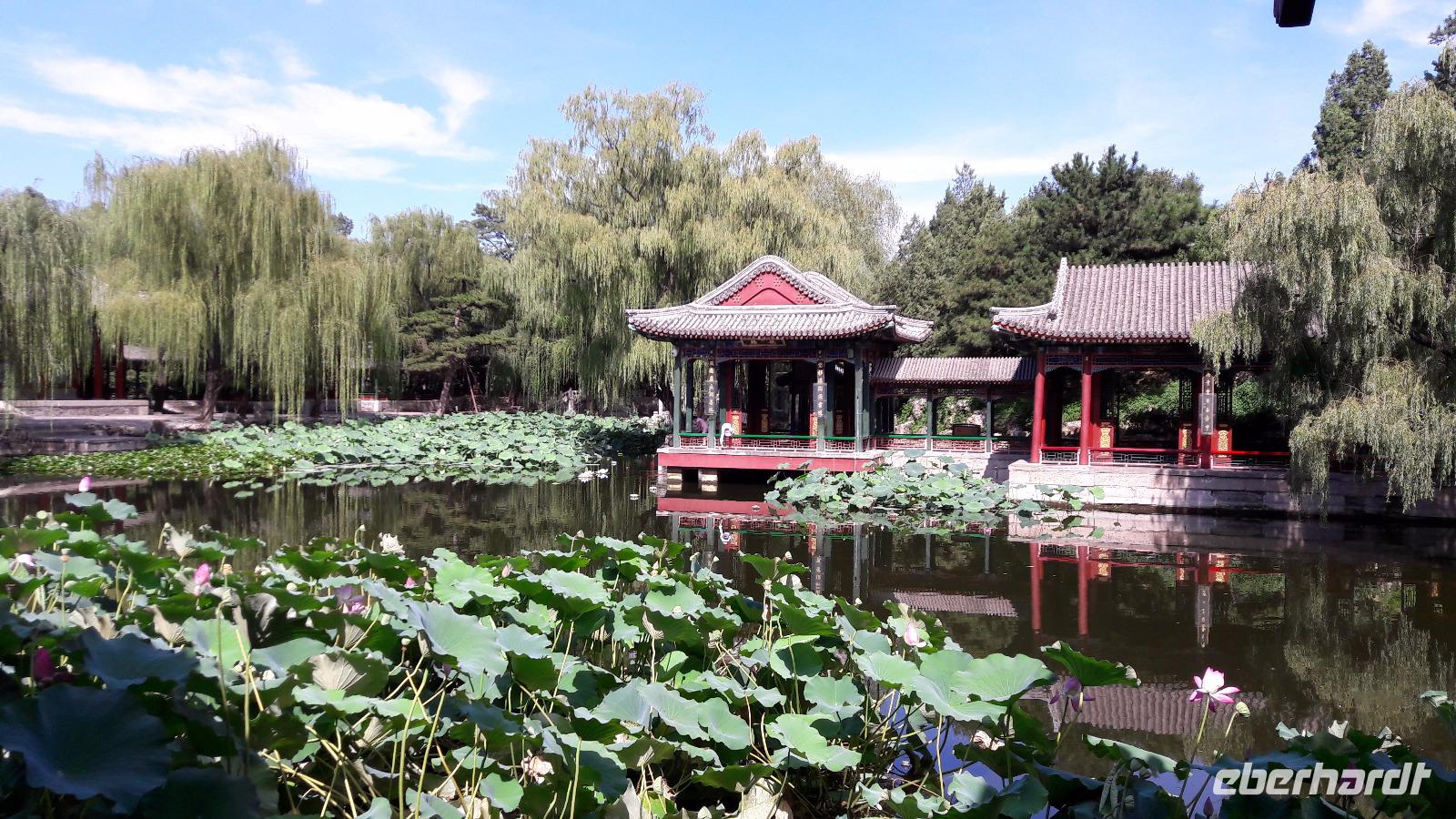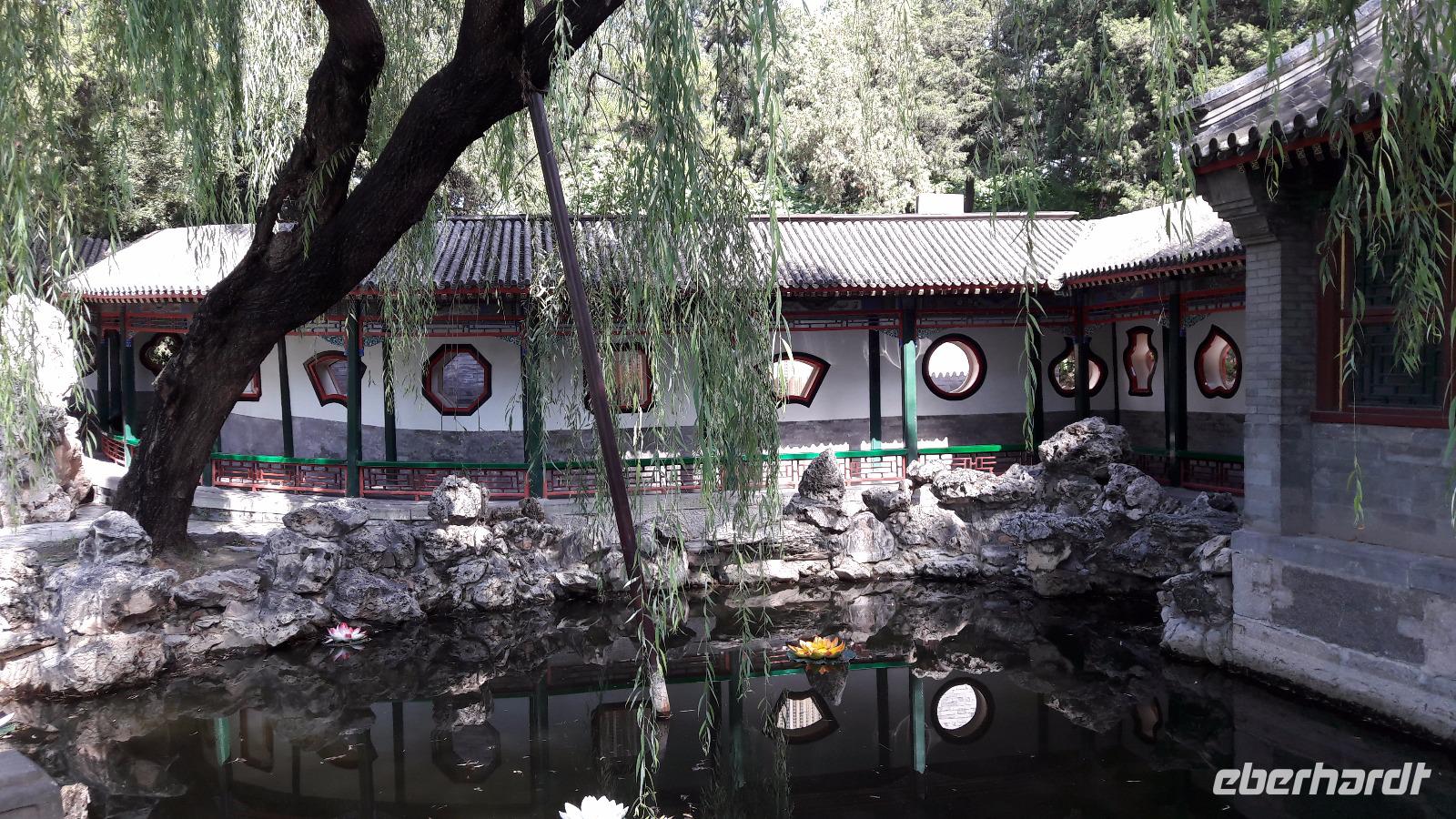 Dieser Palast und weitere vielfältige Bauten wie Pavillons, Tempel, Brücken, lange überdachte und kunstvoll bemalte Wandelgänge findet man in dieser romantisch angelegten Gartenlandschaft. Auch der See ist zum großen Teil künstlich erweitert worden. Yiheyuan heißt dieser Park und bedeutet Park der Gehegten Harmonie; Künstliches und Natürliches sollten hier harmonisch miteinander verbunden werden.