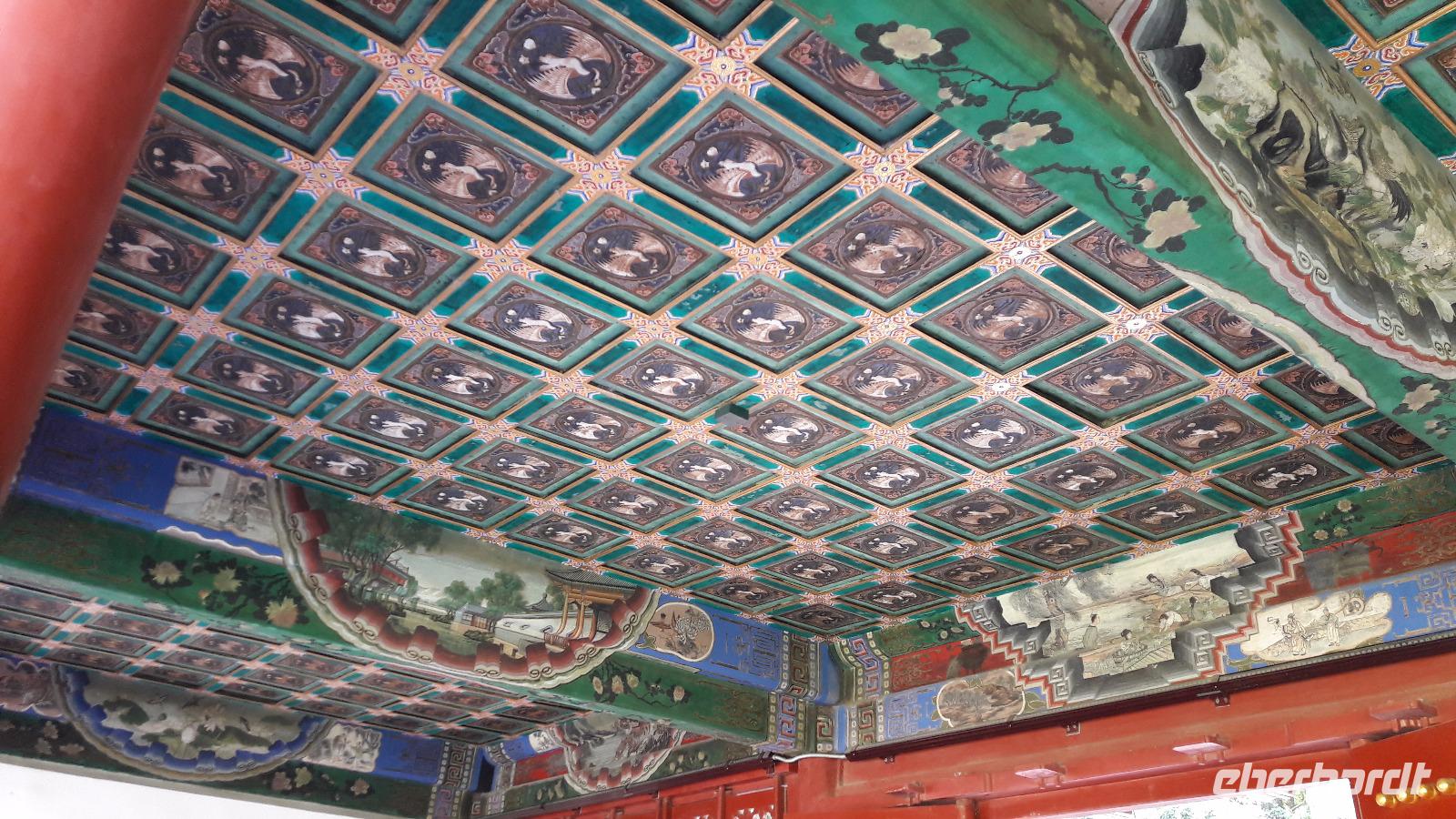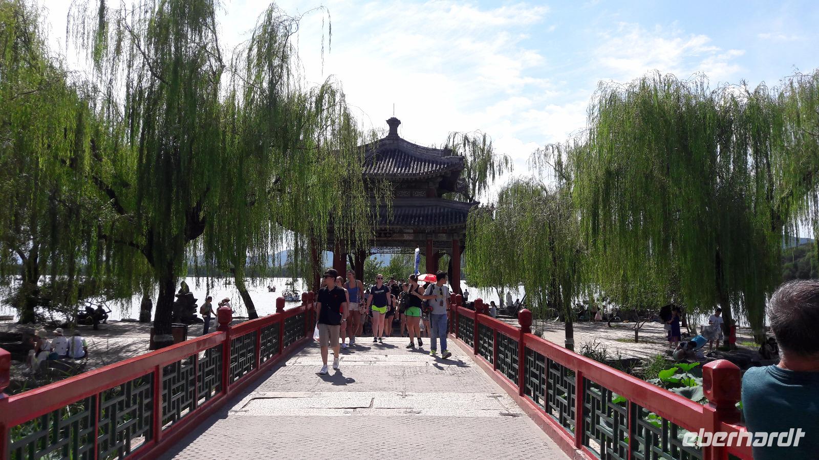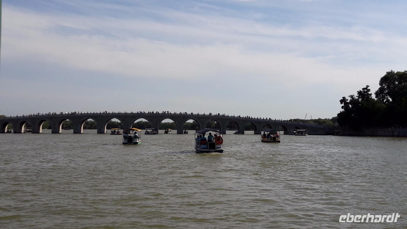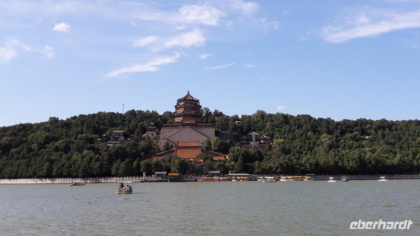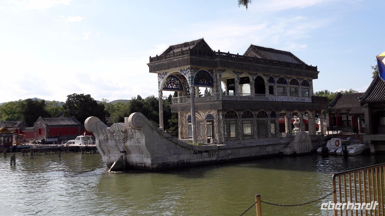 Der Palast diente als Erholungs- und Rückzugsgebiet der Kaiser, allen voran der Kaiserin Witwe Cixi, die auch den Bau des steinernen (und somit völlig seeuntüchtigen) Marmorbootes in Auftrag gegeben hat. Das liegt noch heute am Ufer des Kunming-Sees zu Füßen des Palastes. Wunderschön sind die Bogenbrücken, die hübschen Promenaden sowie der 728 m lange Wandelgang am nördlichen Seeufer, der mit unzähligen Motiven aus der chinesischen Literatur und Landschaftsmalerei bemalt ist.