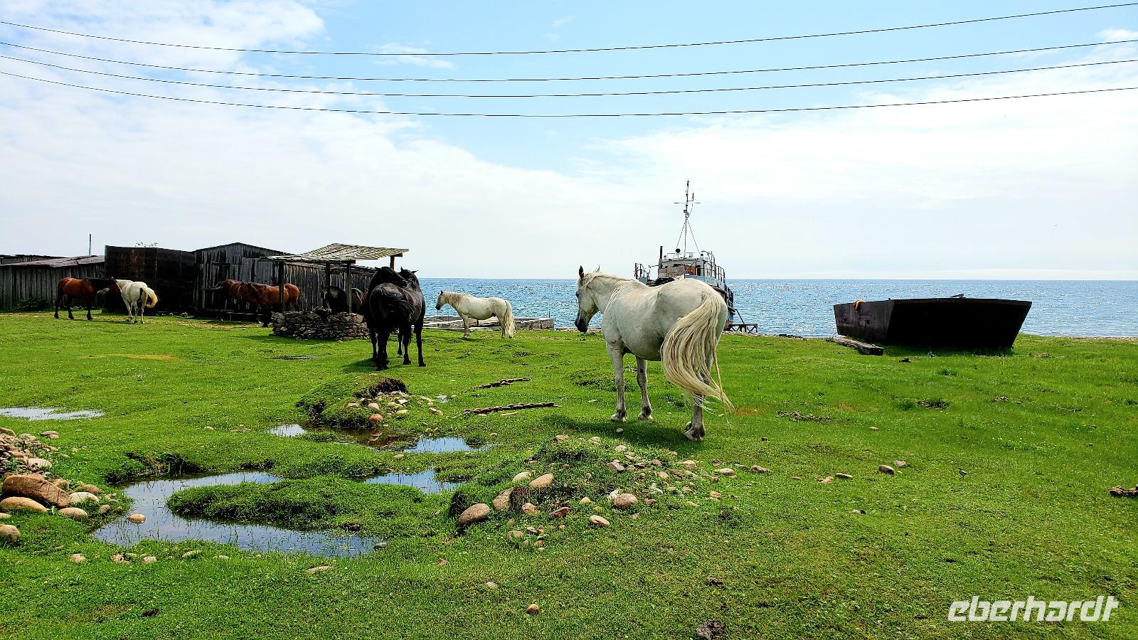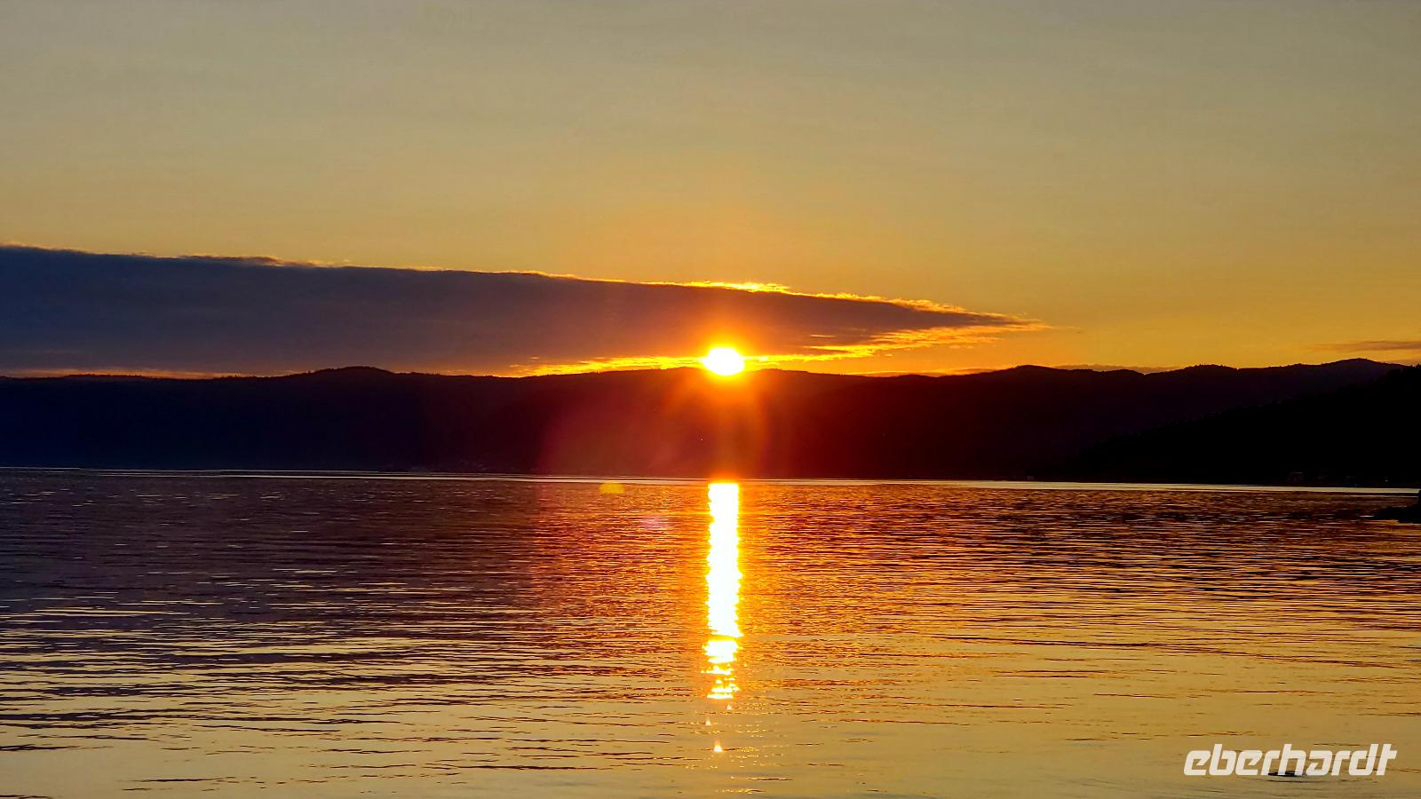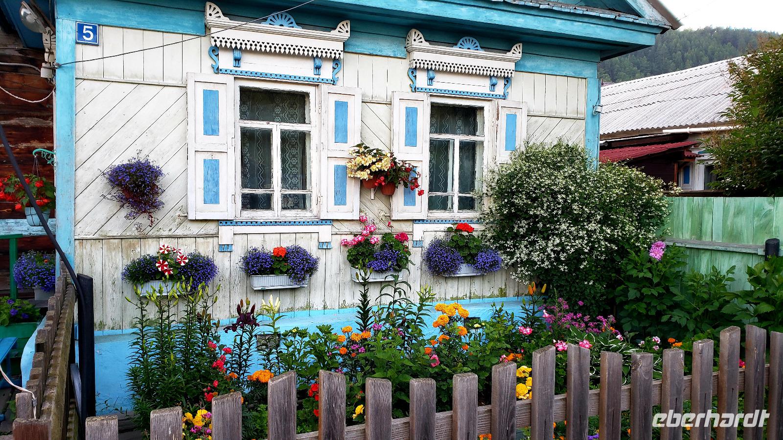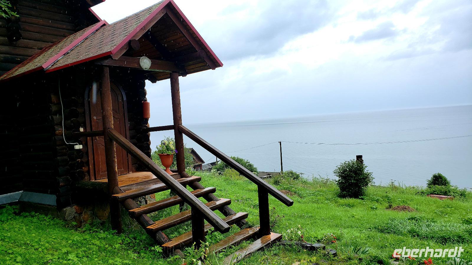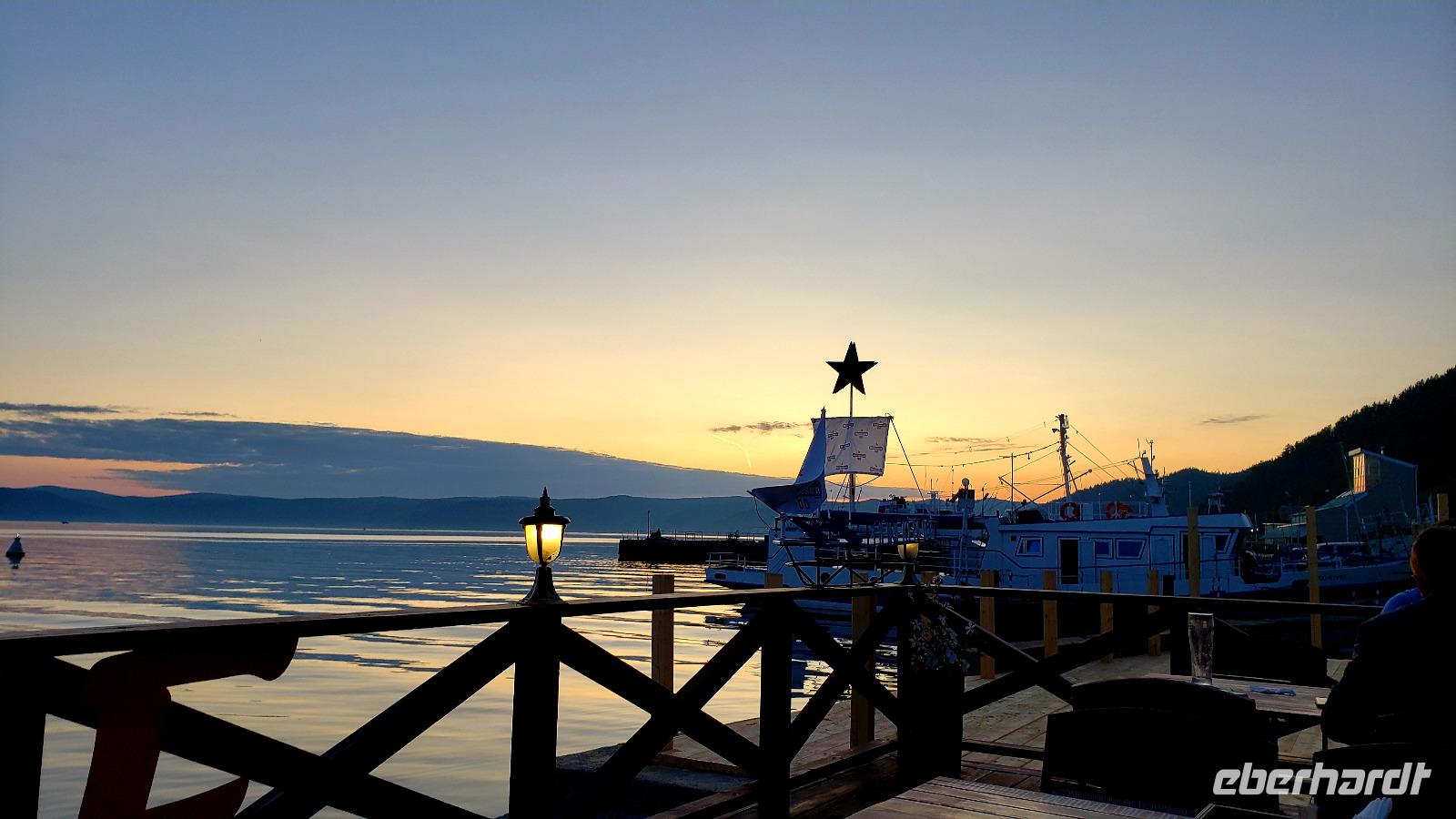 Yuhuu! Endlich blauer Himmel und die Sonne lachte. Da sah der Baikalsee doch gleich viel fantastischer aus! Also flugs aufs Schiff und eine Stunde Fahrt zum kleinen Dorf Bolshiye Koty. Wir sind schon früher angelandet und die letzten 5 km den wunderschönen Küstenwanderweg entlang gegangen, hoch über dem See durch Nadelwälder die herrlich dufteten. Einige haben im Baikalsee ein kühles Bad genommen, während die anderen am Uferrand die Sonne genossen. Im Dorf haben wir den Krämerladen besucht und ein paar Kleinigkeiten gekauft und die hübschen Holzhäuser bewundert. Dieses Dorf ist hauptsächlich ein Forschungsort für Wissenschaftler und Studenten die den Baikalsee erforschen. Außerdem gibt es die typischen Dadschas, die russischen Sommerhäuser. In ihre Dadscha lud uns Tatjana ein, die uns herzlich begrüßte und ein typisch sibirisches Mittagessen servierte. Der Tisch bog sich unter den Speisen und anschließend gab es noch Preiselbeerkuchen und Kaffee. Wir brauchten dringend einen Verdauungsspaziergang und wanderten durch den Birkenwald am Dorfrand. Dann ging es glücklich und satt wieder mit dem Schiff zurück nach Listwjanka. Allen hat dieser Ausflug super gut gefallen! Die Zeit bis zum Abendessen hatten wir zur freien Verfügung und so bummelten wir ein bisschen durch die Stadt. Der krönende Abschluss war ein romantischer Sonnenuntergang über dem Baikalsee, den wir uns nach dem Essen anschauten. In einer netten Bar direkt über dem Wasser ließen wir diesen tollen Tag bei einem Bier ausklingen.