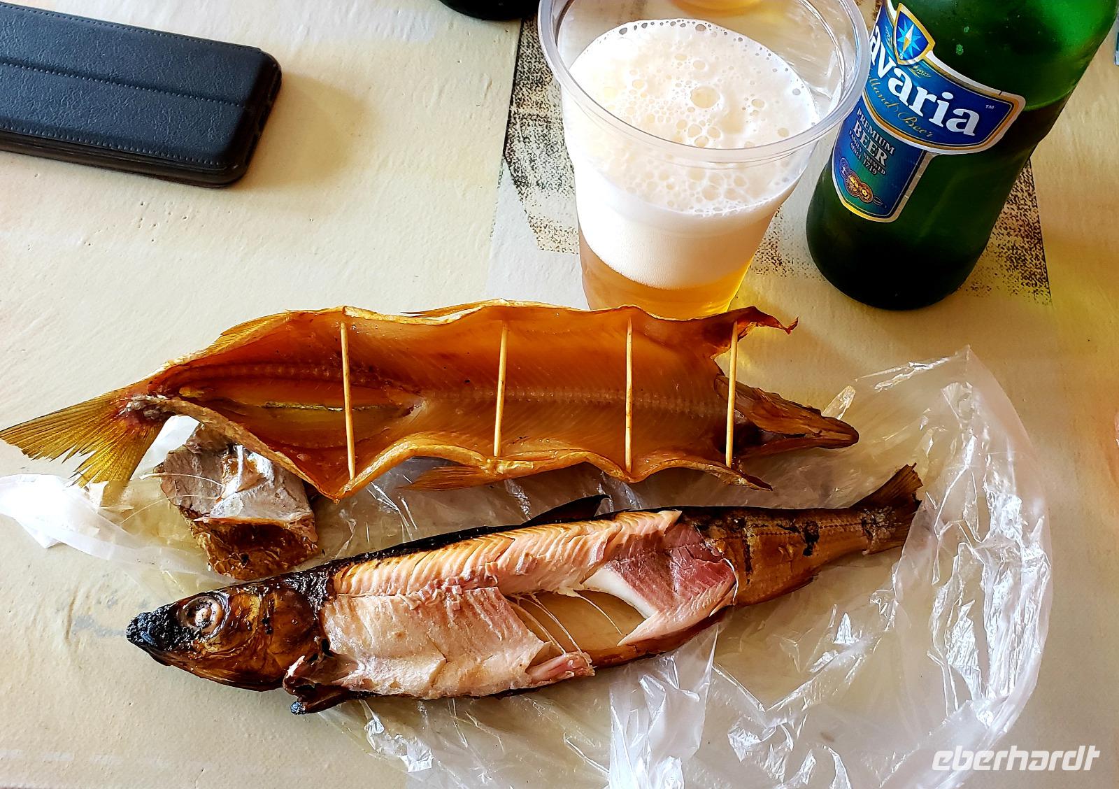 Heute Morgen starteten wir mit einem Besuch des Baikalmuseums, ein kleines aber hochinteressantes Museum, welches Einblick in die Erforschung des Baikalsees gibt und auch ein Aquarium mit der Unterwasserwelt des Sees beherbergt, sowie zwei der niedlichen Baikalrobben. Ludmilla hat uns anschaulich erklärt wie die Erde entstanden ist und warum der Baikalsee schon von Anbeginn existiert und daher für Forscher so interessant ist. Leider war das Museum übervoll mit anderen Touristen Gruppen, die teils sehr laut waren, so dass Ludmilla es schwer hatte sich stimmlich durchzusetzen. Anschließend wanderten wir ein Stück den Berg hinauf zum Start der Seilbahn. Bei strahlendem Sonnenschein fuhren wir gemächlich im Sessellift zum Aussichtspunkt Tscherski Felsen. Es bot sich uns eine fantastische Aussicht auf die Flussmündung der Angara und den Baikalsee. Leider waren wir auch dort nicht die einzigen Touristen, an besonders schöne Orte wollen natürlich alle hin. Nachdem wir genügend Zeit für Fotos und die Aussicht genießen verbracht haben, ging es wieder mit dem Sessellift hinunter. Unter uns dufteten die Kräuterwiesen betörend. Im Winter gibt es hier Skipisten und „Reifenschlitten" für die Kinder. Dann stand der Fischmarkt auf dem Programm, der ist nicht sehr groß aber überall gab es leckeren Räucherfisch zu kaufen. Am bekanntesten ist der Fisch Omul, der zur Lachsfamilie gehört und sich hier großer Beliebtheit erfreut. Also kauften auch wir welchen, ganz frisch und noch warm verzehrten wir den Fisch im Lokal nebenan mit den Fingern direkt aus der Tüte mit einem Bier oder Tee dazu. War das lecker! Damit ging das offizielle Programm des Tages zu Ende und jeder konnte den Nachmittag nach seinem Gusto verbringen. Es gab verschiedene Möglichkeiten: Baikalrobben bei Kunststücken zuschauen, an der Küste spazieren, zur alten Holzkirche wandern, zur Huskyfarm oder in einem Café entspannen und den Blick auf den Baikalsee genießen. Einige von uns gingen am Abend zu einem klassischen Konzert in einer kleinen Kunstgalerie, das war ein schönes Erlebnis in sehr privater Atmosphäre. Eine Opernsängerin, ein Saxophonist und eine Pianistin gaben Werke von Bach, Schubert, Rachmaninow, Dvorak und anderen. Wir waren froh, dass wir hingegangen waren. Danach trafen sich alle am See im Schamanen Café, dort gab es zwar laute Diskomusik, aber das Bier schmeckte uns trotzdem und die Atmosphäre war nett. Das war unser letzter Abend in Russland! Listwjanka und der Baikalsee haben uns allen sehr gut gefallen, hier konnten wir die russische Seele wirklich etwas kennenlernen, abseits der großen Städte.