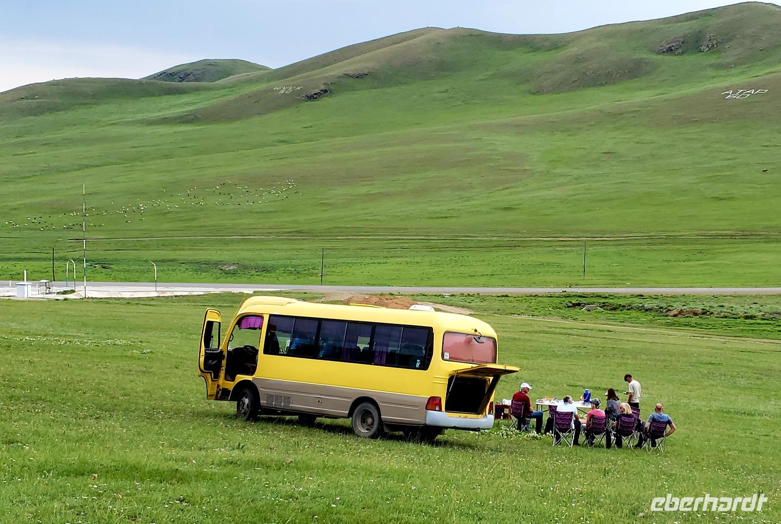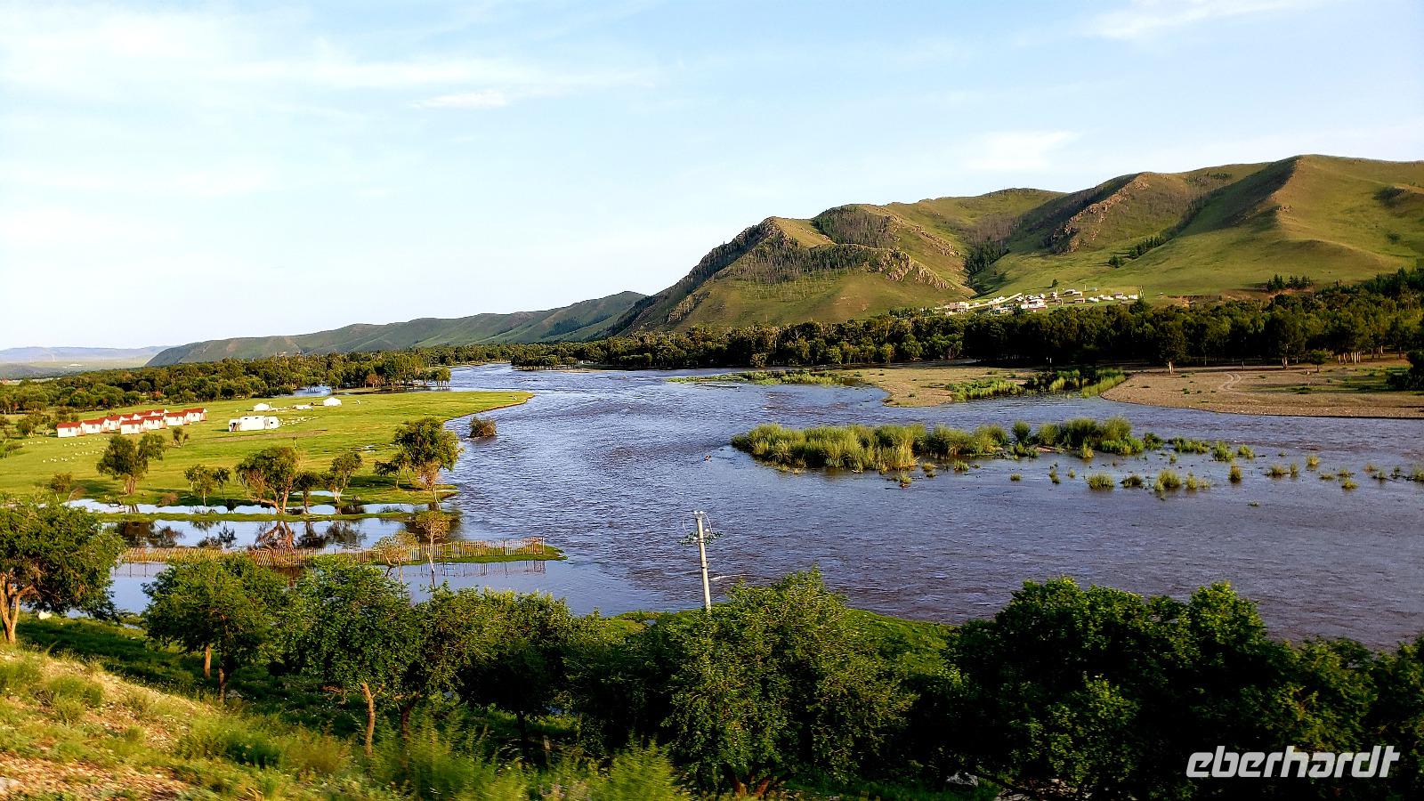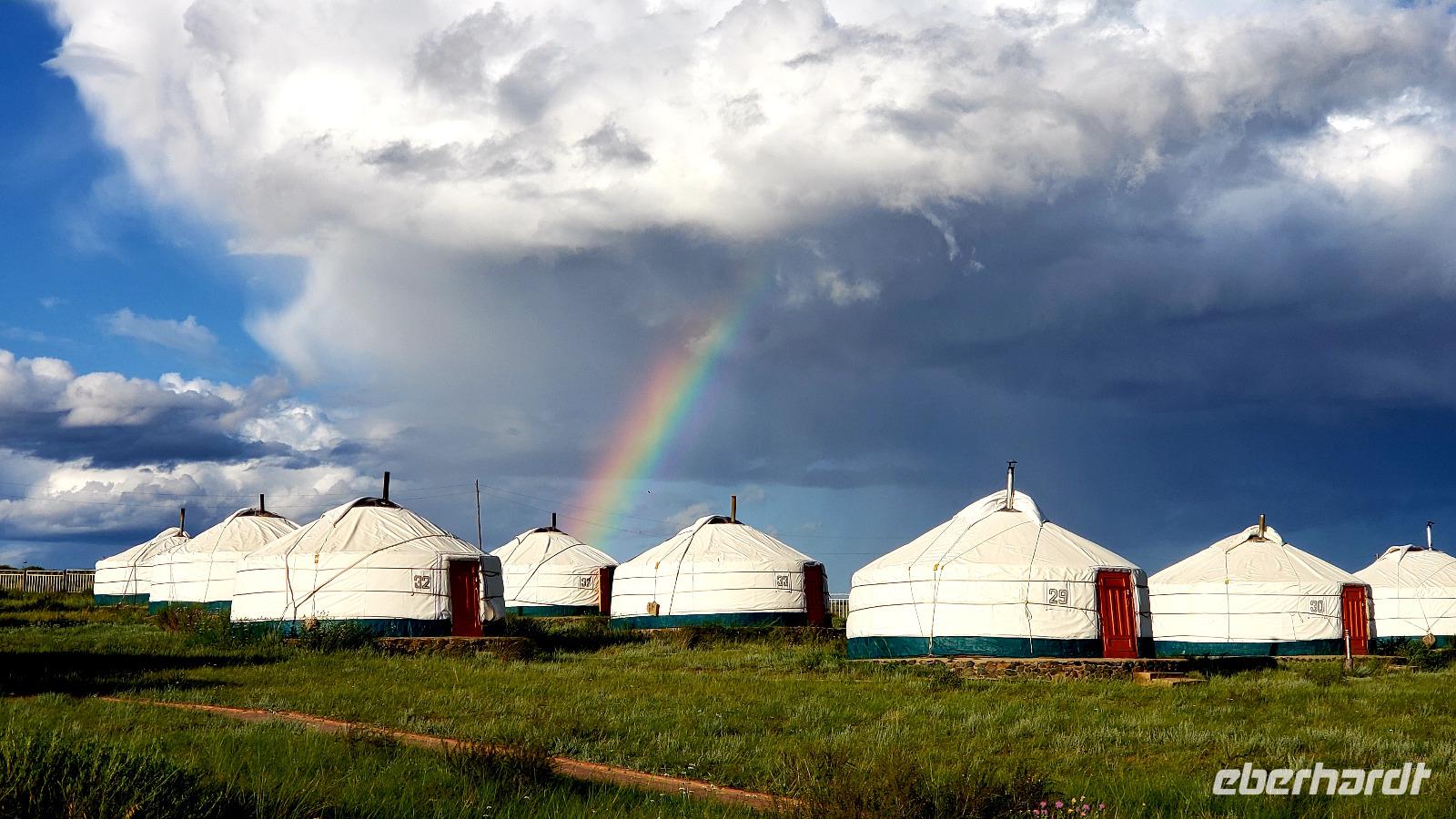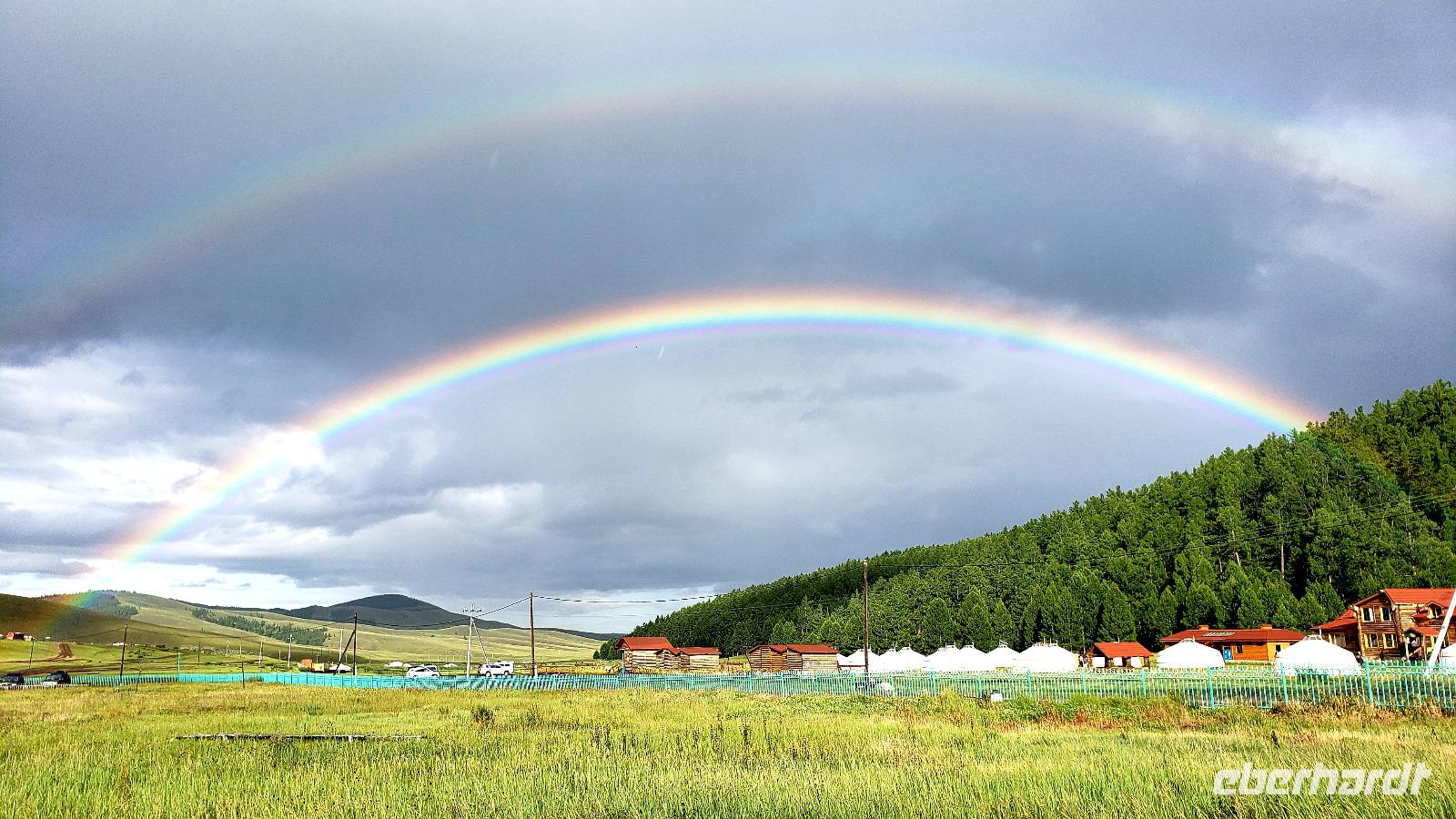 Nach dem Frühstück sind wir noch einmal zur Sanddüne gefahren, es lag sowieso auf dem Weg und so konnten wir die Ausmaße dieser Mini Wüste auch bei Tageslicht bewundern. Weiter ging es Richtung Karakorum, welches wir aber rechts liegen ließen, da unser Ziel heute die Zencher Thermalquelle war. Da hatten wir noch ein ganzes Stück Fahrt vor uns, zum Mittagessen machten wir in der kleinen Stadt Tsetserleg in einem landestypischen Restaurant eine Pause. Die Landschaft mit ihrem Farbspektrum in allen Grün- und Brauntönen faszinierte immer wieder, aber so viele Stunden im Bus waren doch anstrengend. Unterwegs hatten wir eine Reifenpanne, aber unser toller Busfahrer Gaanan hatte schnell den Ersatzreifen aufgezogen. Gegen Abend erreichten wir endlich die heißen Quellen. Die Fahrt über Stock und Stein abseits der Hauptstraße war länger als wir dachten. Einige gingen noch vor dem Abendessen in die entspannenden Thermalbäder, andere danach. Wir nutzen teilweise auch das sehr gute und günstige Massage Angebot. Das Jurten Camp begrüßte uns mit einem doppelten Regenbogen, da zwischen Regenschauern die Sonne herauskam.