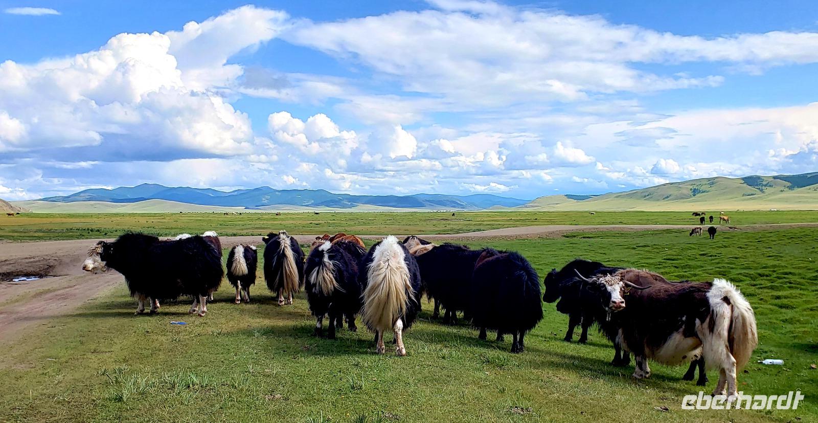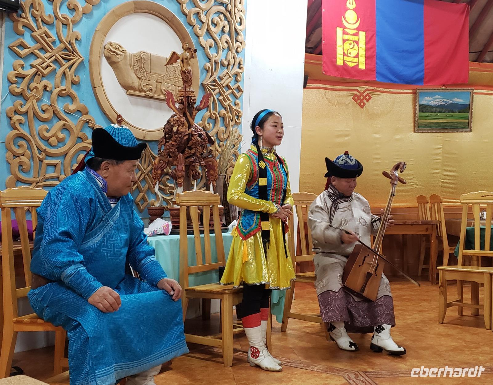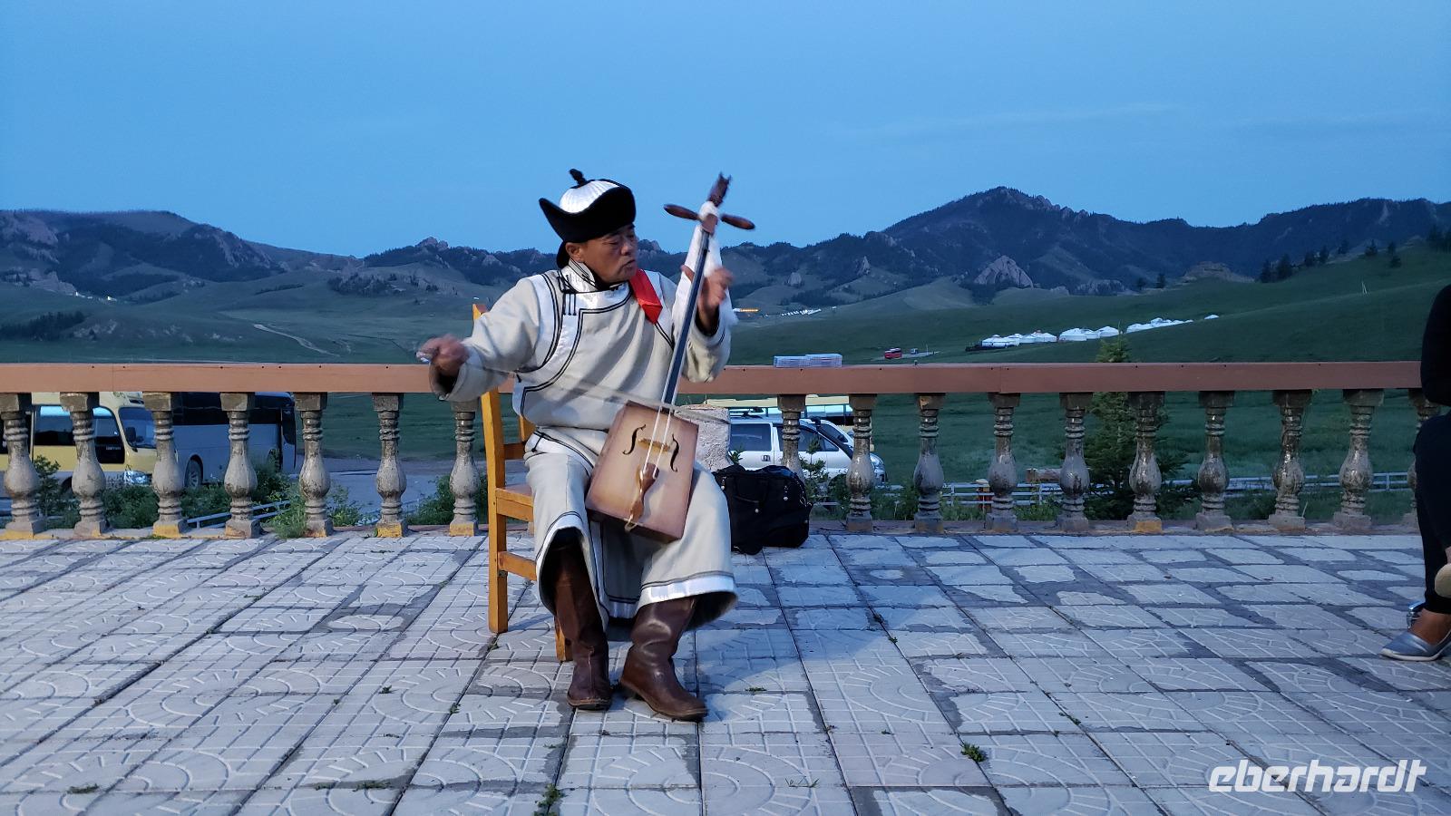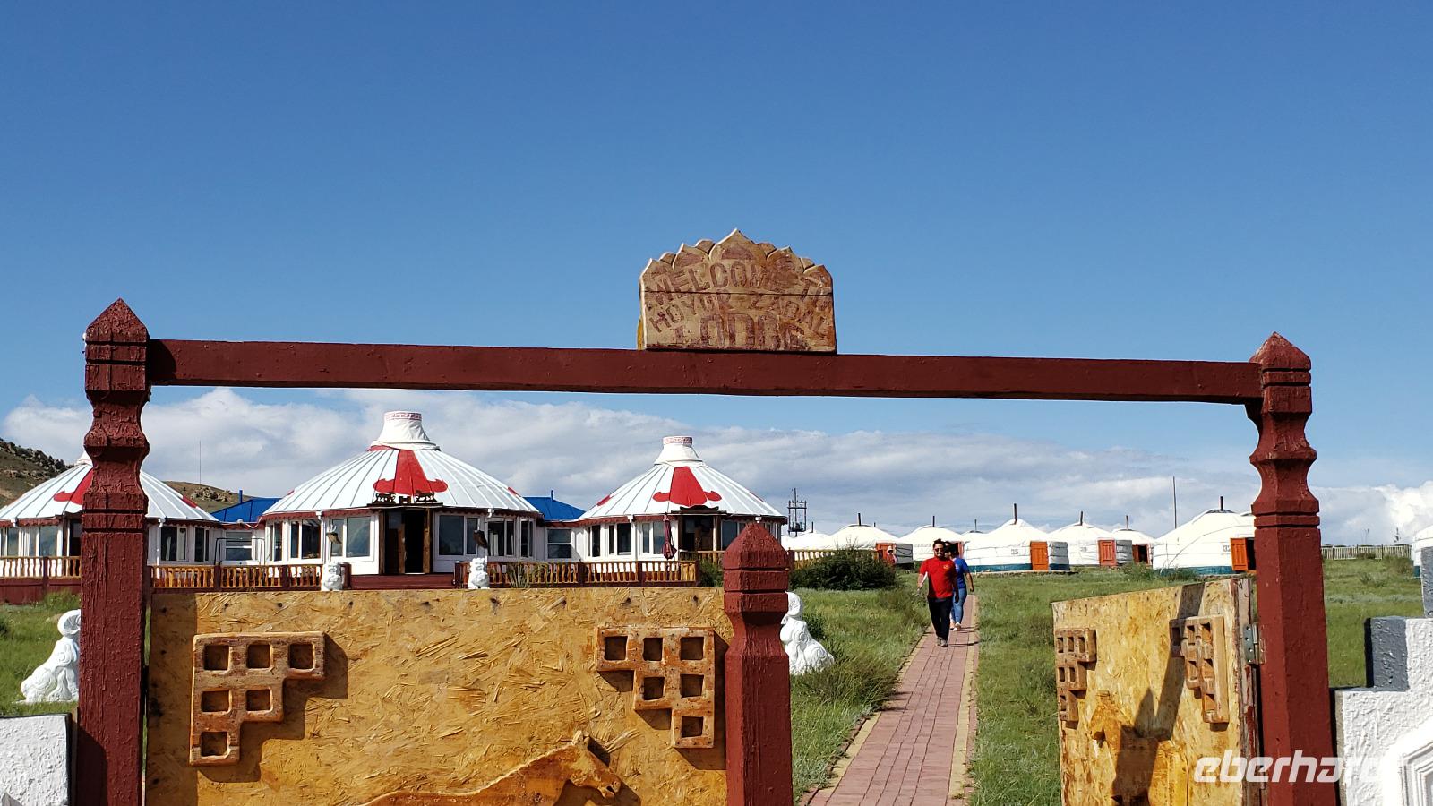 Auf Wiedersehen Russland, hallo Mongolei! Ludmilla hat uns noch bis zum Flughafen Irkutsk begleitet und nach nur einer Stunde Flug tauchten wir in eine ganz andere Kultur ein. Unsere neue Reiseleiterin Mandakh erwartete uns schon in Ulan Bator am Flughafen. Zuerst ging es in eine Bank um Geld zu wechseln und nebenan im Supermarkt konnten wir noch Wasser und Kleinigkeiten kaufen. Uns wurde schon vor der Reise mitgeteilt das das Programm für die Mongolei zwar feststeht, Reihenfolge und Ablauf aber variieren können...da lassen wir uns mal überraschen! Erstmal ging es mit einem Kleinbus raus aus der Stadt und unser erstes Ziel war die imposante Dschingis Khan Statue, die größte Reiterstatue der Welt! In dem Sockel befindet sich ein wunderschönes kleines Museum und es gibt auch ein hübsches Souvenirgeschäft. Wir kletterten in das Pferd von Dschingis hinein, kamen quasi aus dem Mähnenkamm heraus und sahen plötzlich das gigantische Gesicht vom Khan vor uns! Unglaublich riesig selbst seine Hand. Außerdem hat man von dort oben einen super Blick über die mongolische Steppe. Mandakh ließ uns genug Zeit alles ausreichend zu bestaunen, dann fuhren wir erst weiter. Zur Mittagszeit fuhr der Bus einfach von der Straße auf eine Wiese, es wurden Klappstühle, ein Tisch und leckeres Picknick ausgepackt. Bei blauem Himmel saßen wir in der „Walachei" und genossen den Tag. Gegen Abend erreichten wir unser erstes Jurten Camp und wir bezogen unsere Jurten. Das Jurten Camp Guru liegt im Nationalpark Terelj, welcher sich durch steile, schroffe Felsformationen auszeichnet. Es gab ein leckeres Abendessen, saubere heiße Duschen und nach dem Essen kam ein Kehlkopfsänger mit seiner Perdekopfgeige und gab uns eine Darbietung dieser Kunst. Er sprach sehr gut Deutsch, was uns überraschte und erklärte uns alles über Kehlkopfgesang.