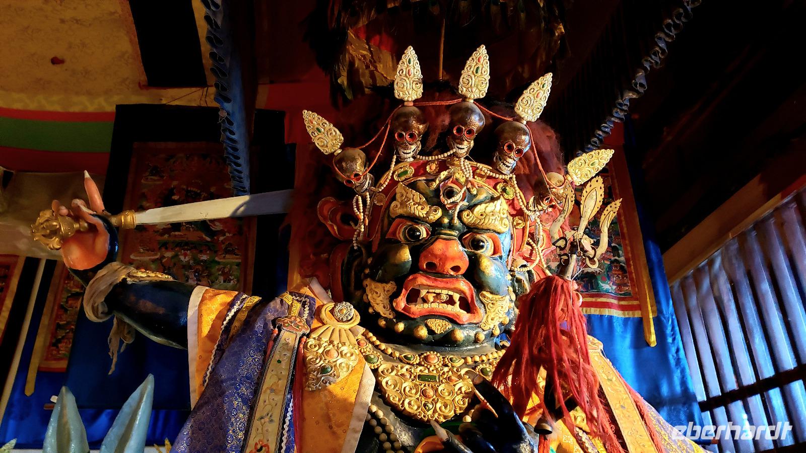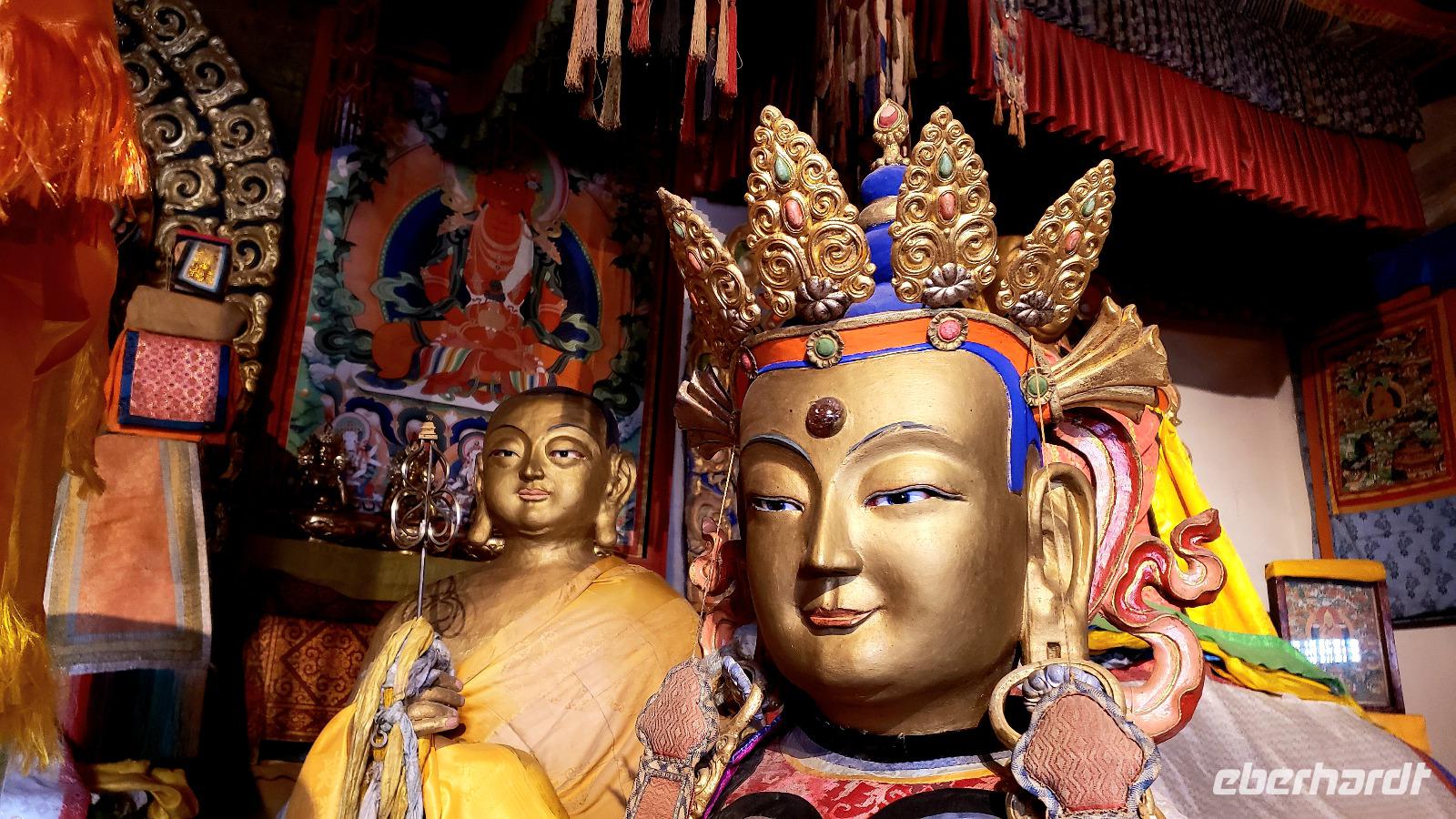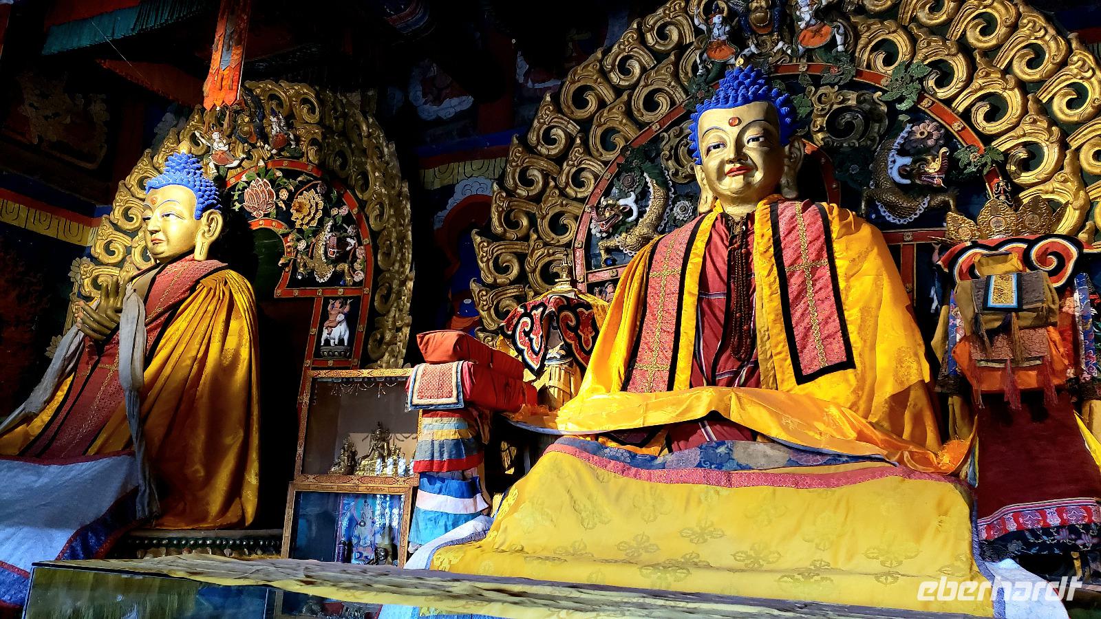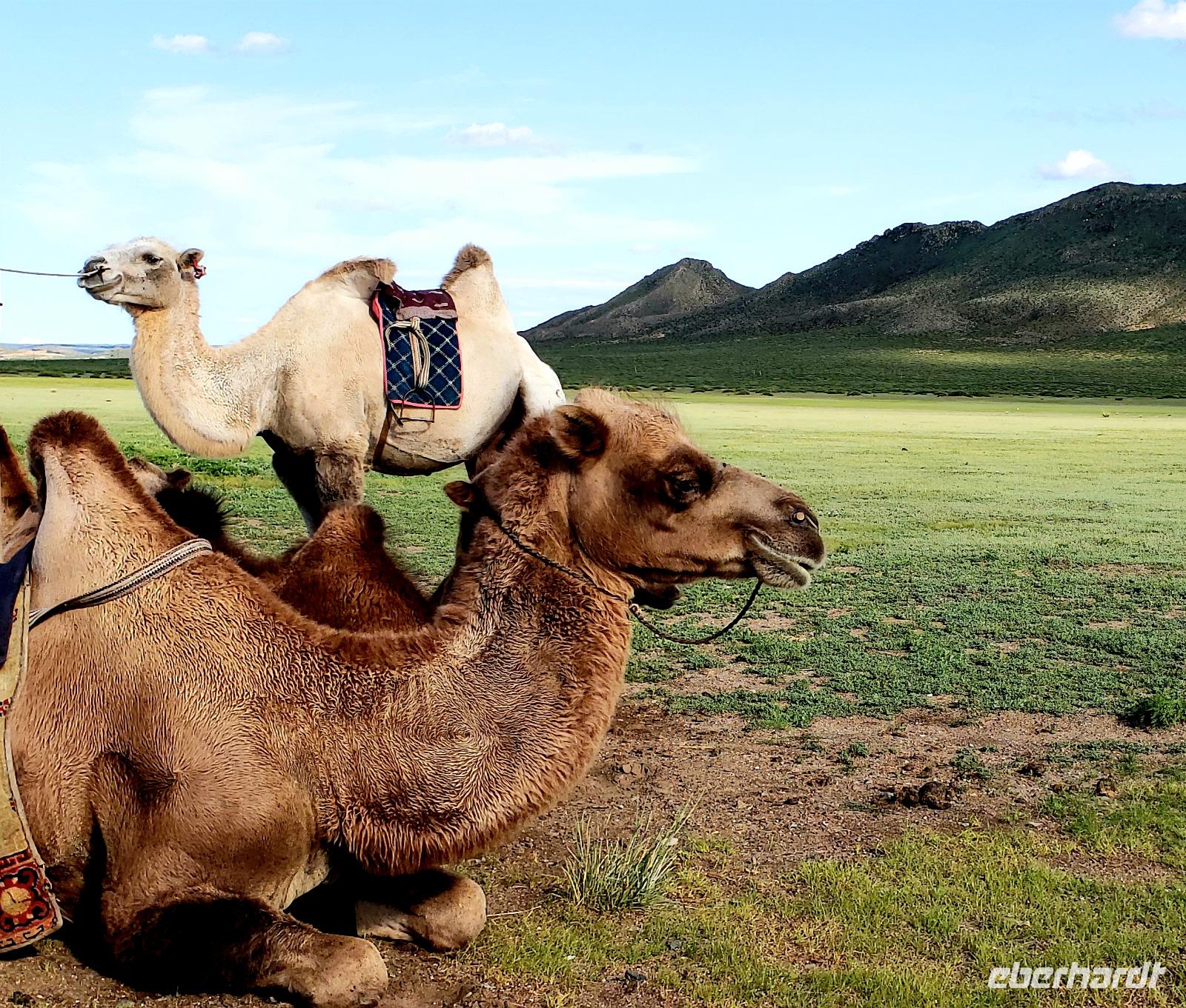 Auf Wiedersehen Russland, hallo Mongolei! Ludmilla hat uns noch bis zum Flughafen Irkutsk begleitet und nach nur einer Stunde Flug tauchten wir in eine ganz andere Kultur ein. Unsere neue Reiseleiterin Mandakh erwartete uns schon in Ulan Bator am Flughafen. Zuerst ging es in eine Bank um Geld zu wechseln und nebenan im Supermarkt konnten wir noch Wasser und Kleinigkeiten kaufen. Uns wurde schon vor der Reise mitgeteilt das das Programm für die Mongolei zwar feststeht, Reihenfolge und Ablauf aber variieren können...da lassen wir uns mal überraschen! Erstmal ging es mit einem Kleinbus raus aus der Stadt und unser erstes Ziel war die imposante Dschingis Khan Statue, die größte Reiterstatue der Welt! In dem Sockel befindet sich ein wunderschönes kleines Museum und es gibt auch ein hübsches Souvenirgeschäft. Wir kletterten in das Pferd von Dschingis hinein, kamen quasi aus dem Mähnenkamm heraus und sahen plötzlich das gigantische Gesicht vom Khan vor uns! Unglaublich riesig selbst seine Hand. Außerdem hat man von dort oben einen super Blick über die mongolische Steppe. Mandakh ließ uns genug Zeit alles ausreichend zu bestaunen, dann fuhren wir erst weiter. Zur Mittagszeit fuhr der Bus einfach von der Straße auf eine Wiese, es wurden Klappstühle, ein Tisch und leckeres Picknick ausgepackt. Bei blauem Himmel saßen wir in der „Walachei" und genossen den Tag. Gegen Abend erreichten wir unser erstes Jurten Camp und wir bezogen unsere Jurten. Das Jurten Camp Guru liegt im Nationalpark Terelj, welcher sich durch steile, schroffe Felsformationen auszeichnet. Es gab ein leckeres Abendessen, saubere heiße Duschen und nach dem Essen kam ein Kehlkopfsänger mit seiner Perdekopfgeige und gab uns eine Darbietung dieser Kunst. Er sprach sehr gut Deutsch, was uns überraschte und erklärte uns alles über Kehlkopfgesang.