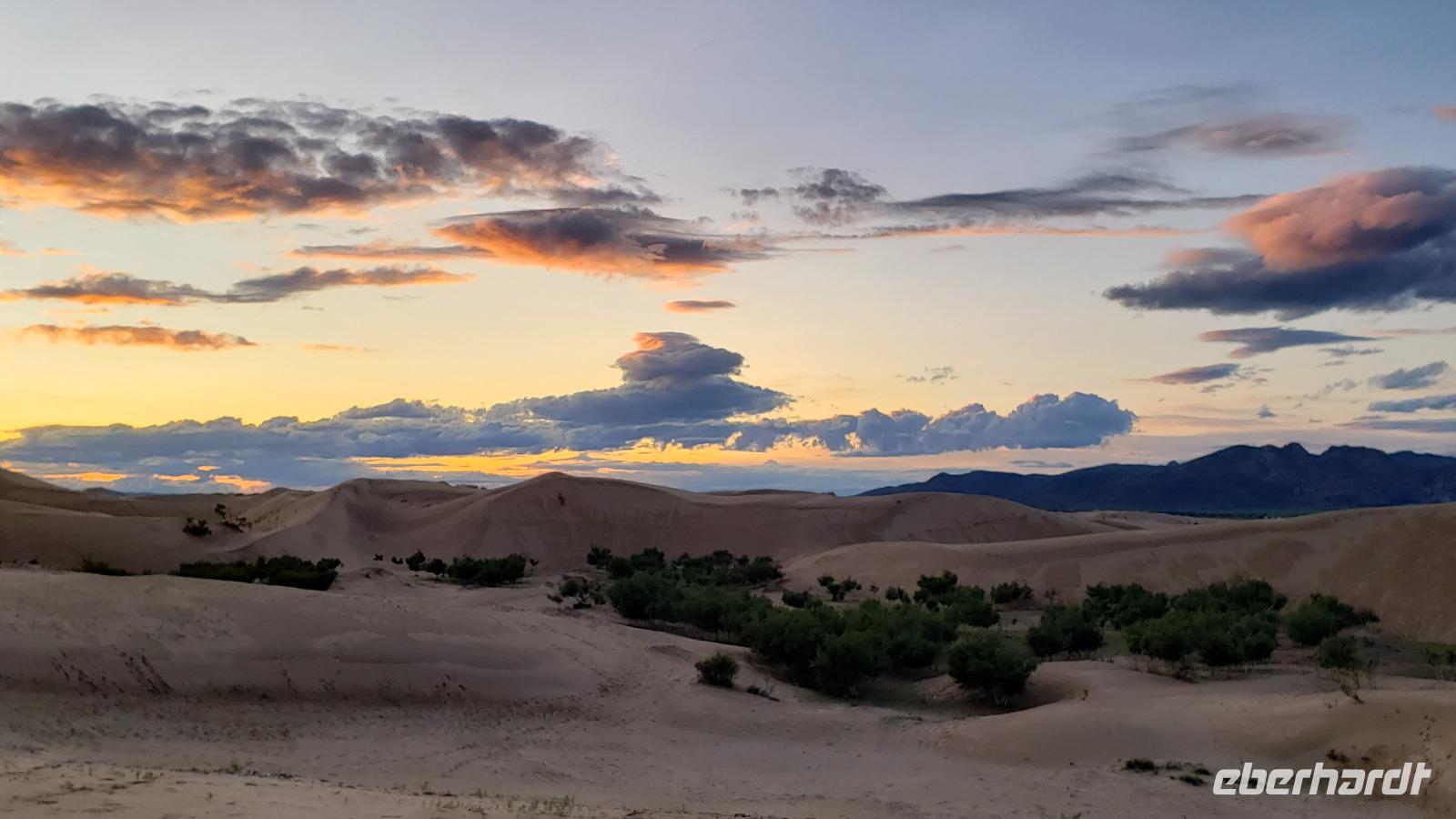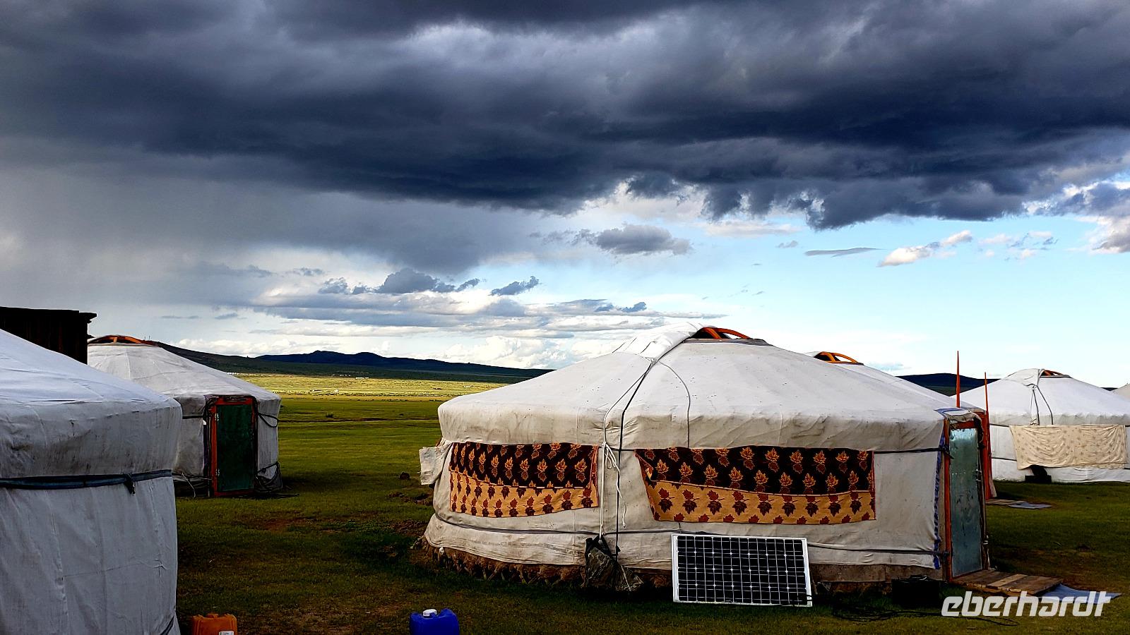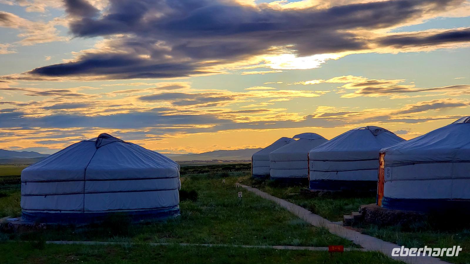 Wir sind gleich wieder mit den Koffern abgereist nach dem Frühstück, da unser Ziel heute 400km weit entfernt liegt. Auf holpriger Straße und mit einigen Regenschauern fuhren wir fast den ganzen Tag quer durch die Mongolei. Die Landschaft mit ihren Farbspielen und Wolkengebilden ist sehr faszinierend. Zum Mittag machten wir Pause in einem neuen Buffet Restaurant. Das scheint sehr beliebt zu sein denn es war sehr voll. Am Spätnachmittag kamen wir in unserem Jurten Camp an. Wir brachten nur die Koffer in die Jurten und fuhren gleich weiter, da wir bei einer Nomadenfamilie eingeladen waren. Dort saßen wir bei Buttertee und Stutenmilch alle im Kreis mit der Familie und unterhielten uns nett. Das heißt, Mandakh musste natürlich alles übersetzen aber wir haben viel gelacht. Am Ende haben wir noch Fotos mit traditionellen Kostümen gemacht, die Kamele bestaunt und einige Gastgeschenke überreicht. Dann mussten wir auch schon wieder ins Jurten Camp, da um 19 Uhr das Abendessen serviert wurde. Uns wurde mitgeteilt das aufgrund eines Defekts der Wasserleitung kein Wasser zum Duschen da wäre. Was kann man machen? Dann wird eben heute nicht geduscht. Als kleine Entschädigung konnten wir den Manager überreden uns ein Bier zu spendieren, dann war alles halb so schlimm. Nach dem Essen entschlossen wir uns spontan noch zur Elsen Tasarchai Sanddüne zu fahren um den Sonnenuntergang zu beobachten. Das war echt super und die Düne ist viel größer als wir vermutet hatten, man fühlt sich wie in der Wüste! Deshalb nennt man sie auch "Mini Gobi".