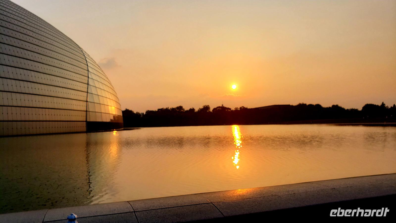 Erstaunlich gut im Zug geschlafen, unsere Reisebegleiterin Martina hatte schon Brote geschmiert und dann mit Kaffee oder Tee an die Gruppe in den 3 Abteilen verteilt. Dann ging es noch ein paar Stunden durch die Landschaft Chinas, es wurde bergig, das war eine nette Abwechslung für die Augen. Nur ein paar Minuten verspätet erreichten wir Peking, wo unsere Reiseleiterin Lin uns schon erwartete. Als erstes fuhren wir ins Hotel und machten eine Stunde Pause zum Duschen. Dann sollten wir eigentlich mit dem Reisebus in den Sommerpalast, aber alle wollten lieber spazieren gehen und so machten wir eine kleine Rundtour durch alte Gassen, Märkte und schließlich zum Platz des himmlischen Friedens. Als wir an der runden, vom Wasser umgebenen Oper vorbeikamen, ging gerade die Sonne unter und wir konnten tolle Fotos machen. Dann führte Lin uns in ihr Lieblingsrestaurant und wir saßen kaum, da wurden schon 6 verschiedene chinesische Spezialitäten aufgefahren. Das war alles sehr lecker und das Tsingtao Bier schmeckt auch. Das war schon mal ein guter Start in China, alle sind sehr zufrieden.