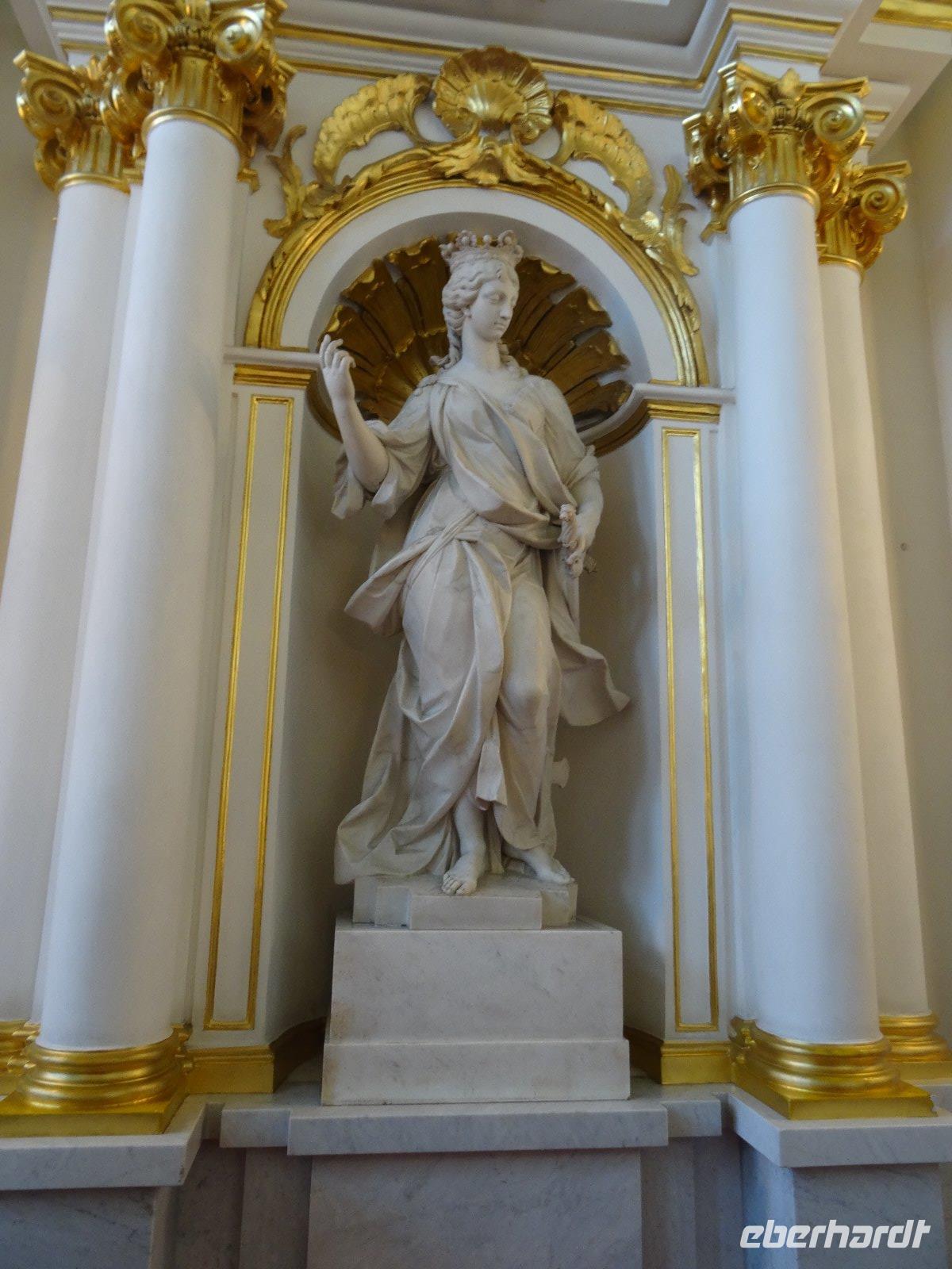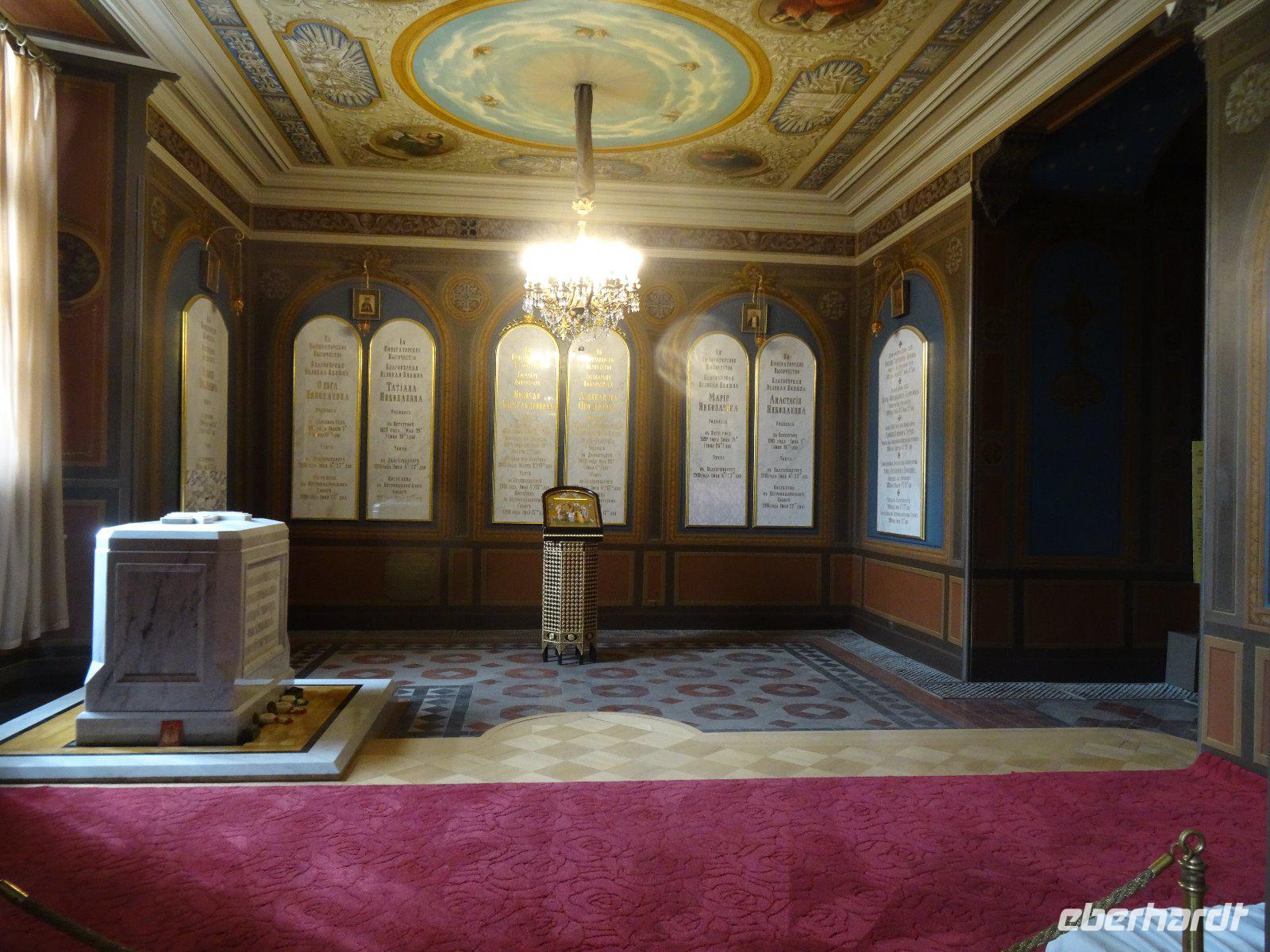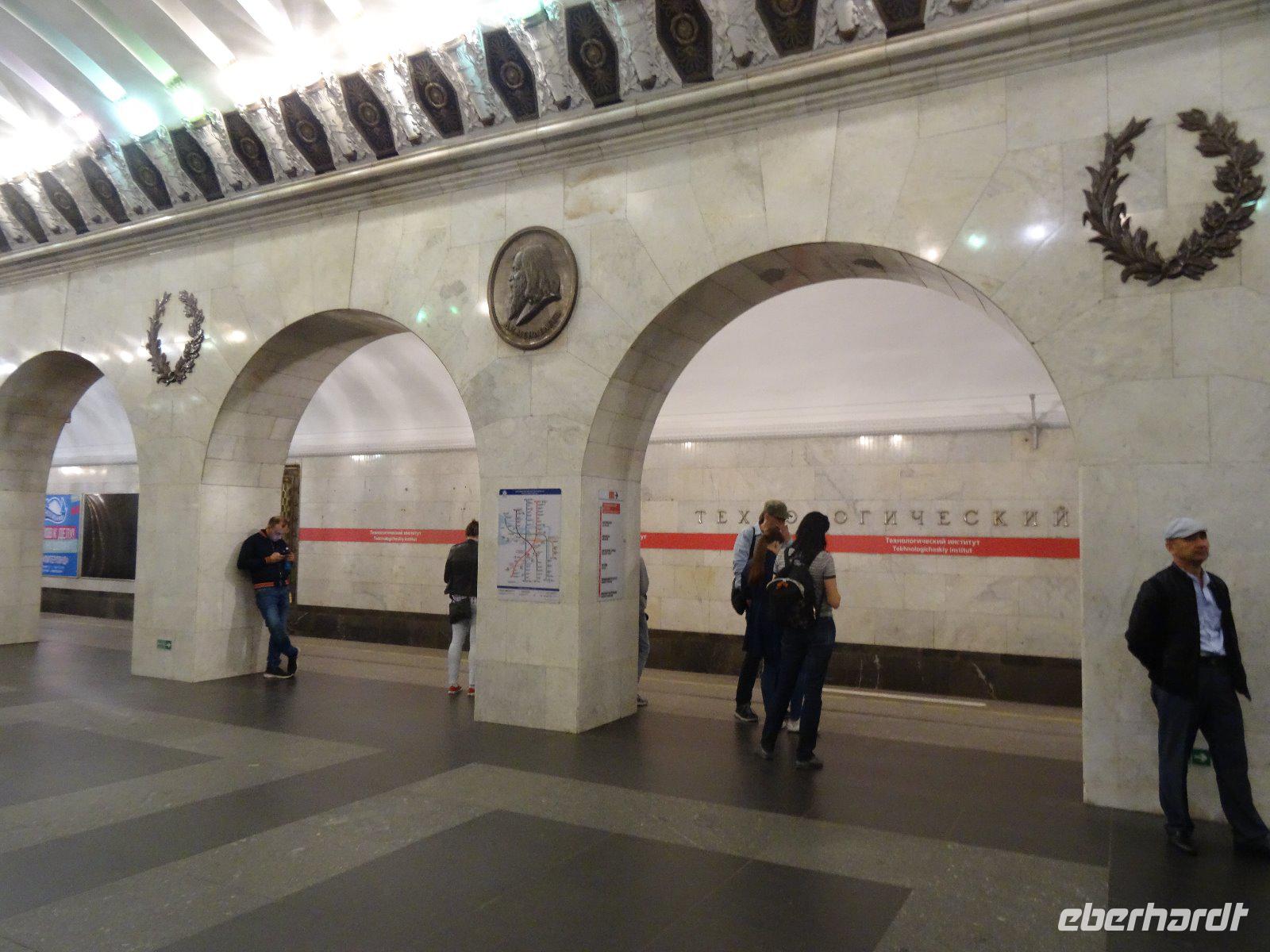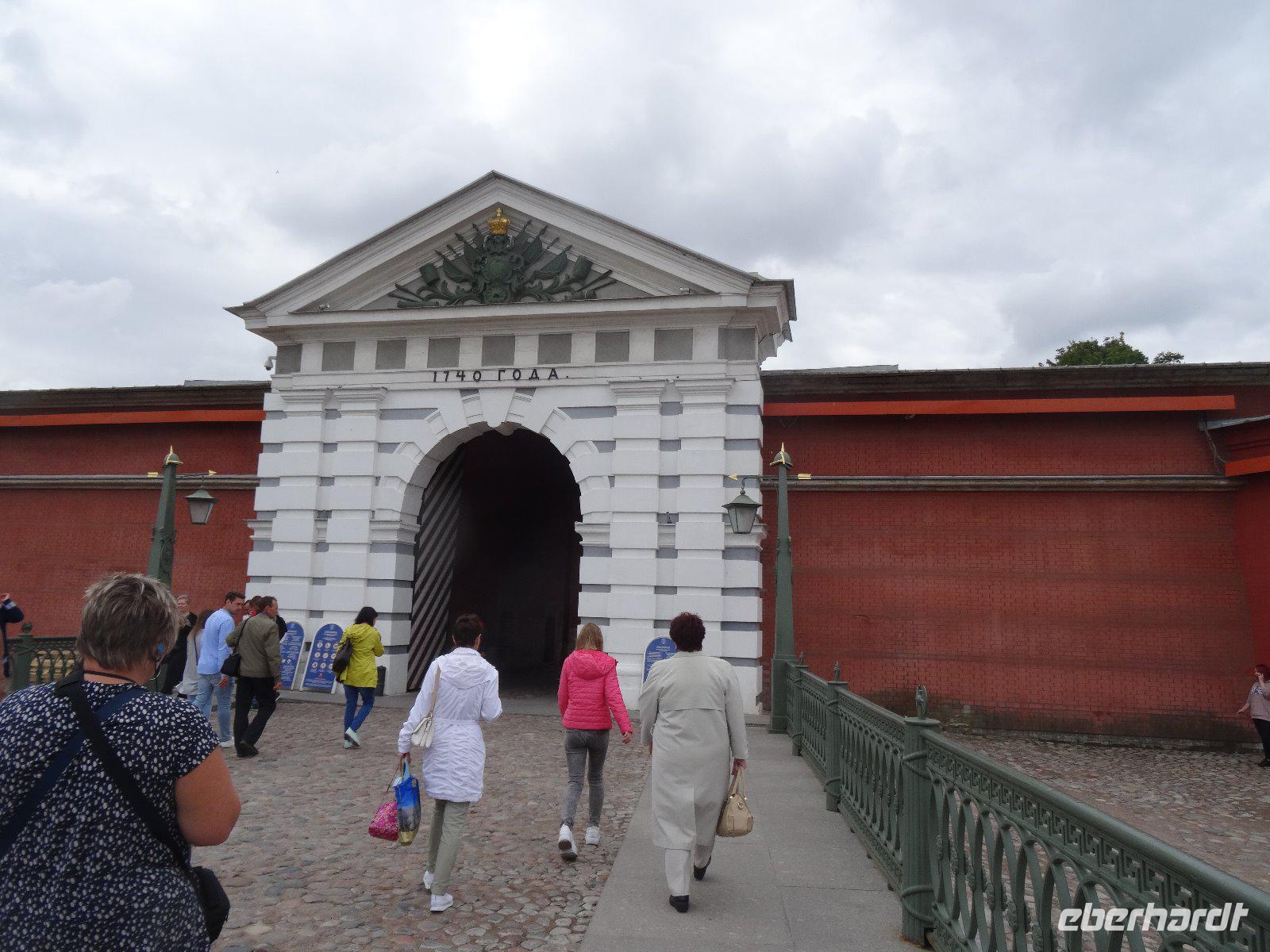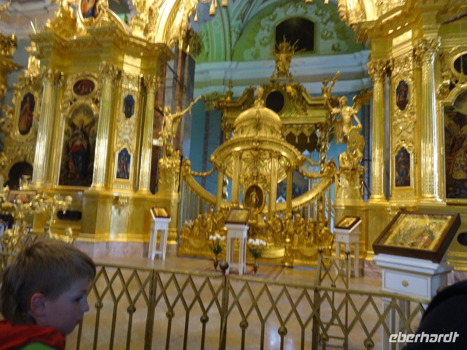 An der breitesten Newa-Stelle weden eifrig Fotos geschossen und dann geht es weiter in die Peter und Paul-Festung. Sie befindet sich auf der Haseninsel und wir betreten die Festung durch das große Peterstor und gehen vorüber am Ingenieurshaus und dem Kommandantenhaus bis zur Kathedrale. Vorher gibt es noch ein Foto der Statue von Peter dem Großen mit winzigem Kopf. In der Kathedrale hören wir dem Gesang einiger Mönche zu, bestaunen die goldene Pracht und besuchen die Zarengräber in der angrenzenden Kapelle. Dann wird es Zeit für etwas Praktisches: wir fahren einige Stationen mit der Metro und sehen die hübsche Station "Puschkin". Nach kurzer Rast im Hotel treffen sich die meisten wieder für einen kleinen Spaziergang zum Newski-Prospekt und natürlich auch zum Kaffeetrinken.