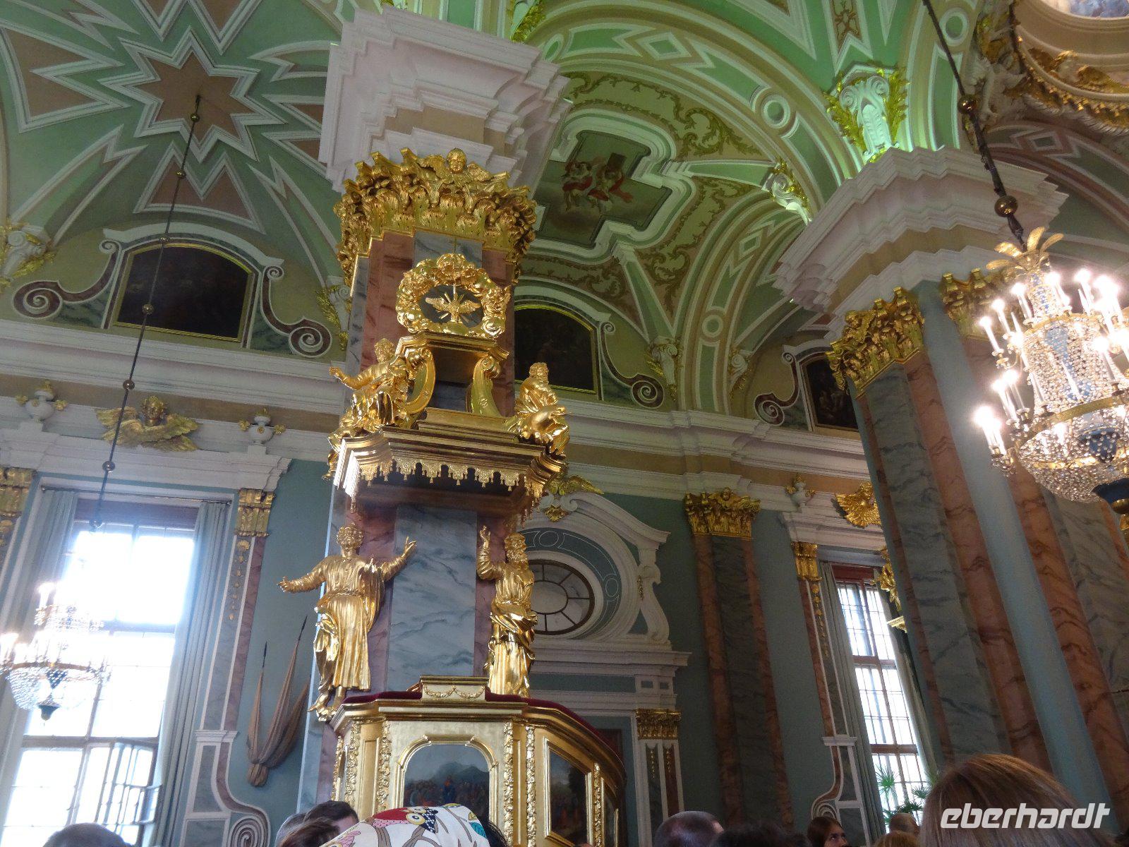 Heute widmen wir uns der schönen Stadt St. Petersburg. Olga erzählt uns von Peter dem Großen, der im Jahre 1703 seine neue Hauptstadt als "Fenster zum Westen" plante. Zunächst kommen wir zur Christi-Auferstehungs-Kathedrale, auch Blutkirche genannt, weil sie an der Stelle steht, wo Zar Alexander II. im Jajre 1881 einem Attentat erlag. Die Kirche ist jetzt ein Museum. Daneben sehen wir noch die große Kasaner Kirche und dann geht es ein Stück Flaniermeile entlang. Der Newski-Prospekt ist das Herzstück der Stadt und bietet eigentlich alles, was des Städters Herz begehrt. Wir aber wollen nicht bummeln, sondern etwas sehen und fahren zum Sommergarten, der zwischen der Newa, der Fontanka und dem Schwanenkanal liegt. Streng geometrisch angelegt, ist er die grüne Lunge der Stadt.