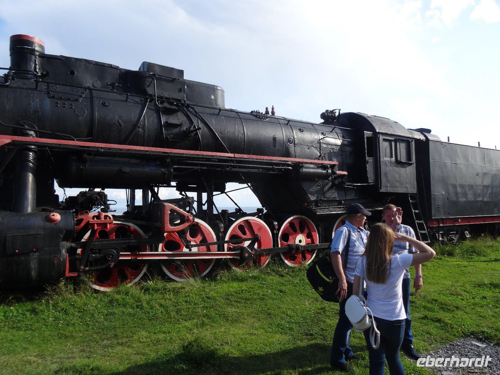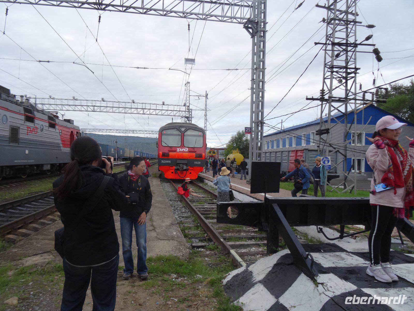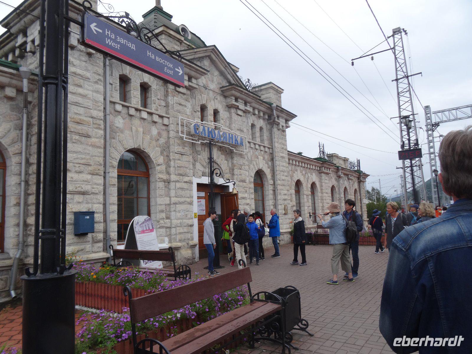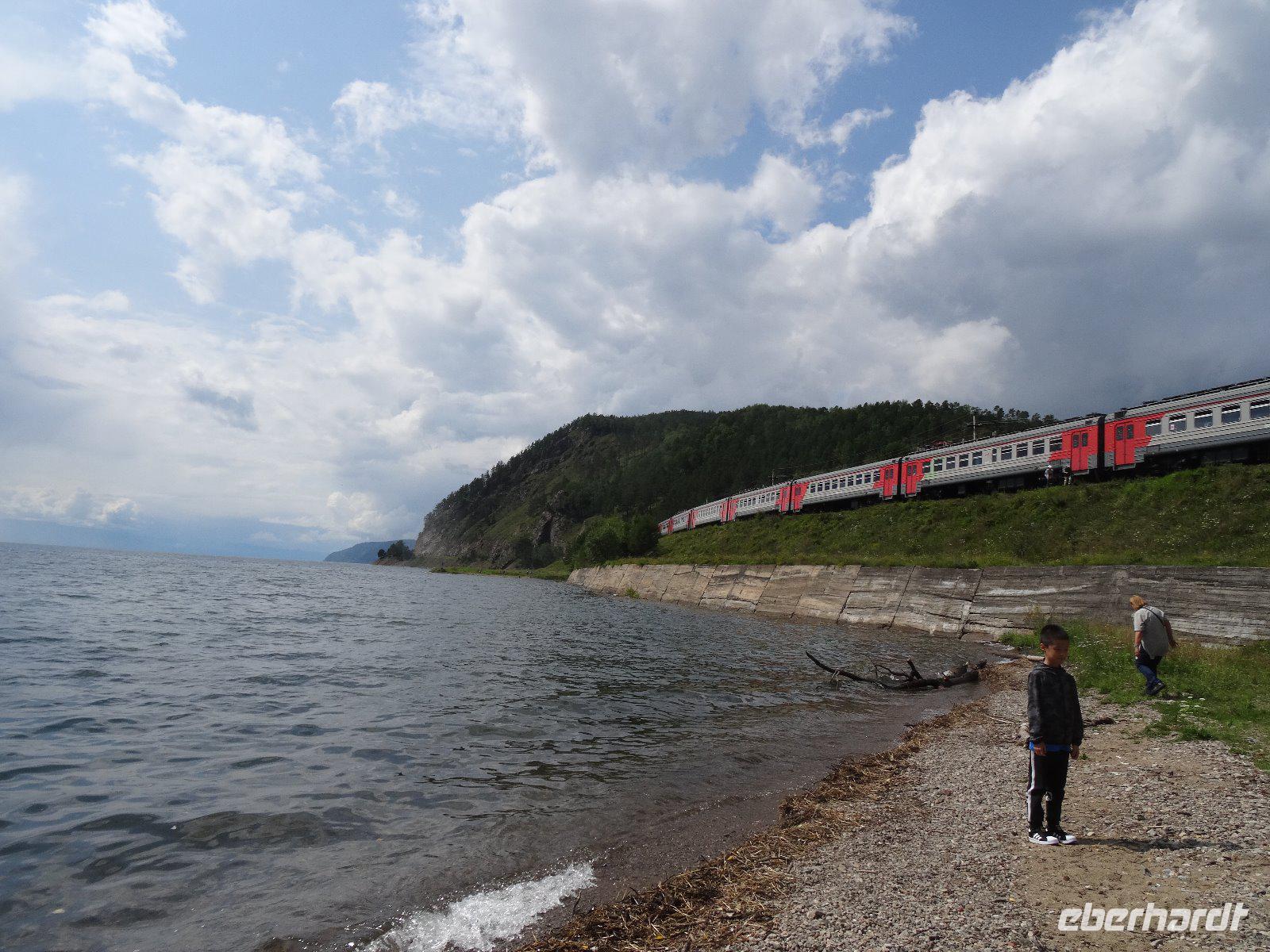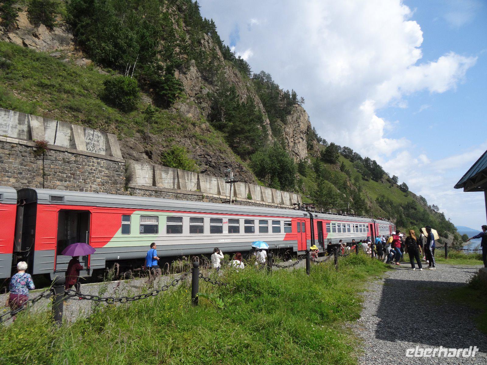 7:00 verabschieden wir uns vom Hotel und fahren zum Bahnhof. Mit dem Krugobaikalski-Express geht es nun Richtung Baikalsee. Die alte Strecke der Transsib nutzt der Zug und wir fahren mit mehreren Stopps ein Stück am Südufer des Sees entlang. Der 84 km lange Streckenabschnitt hat nur noch eine lokale bzw. touristische Bedeutung. Durch den Bau des Wasserkraftwerkes in Irkutsk wurde der ursprüngliche Streckenverlauf überflutet und aktuell führt die Transsib nun direkt nach Süden bis Sljudjanka und am Südufer weiter.