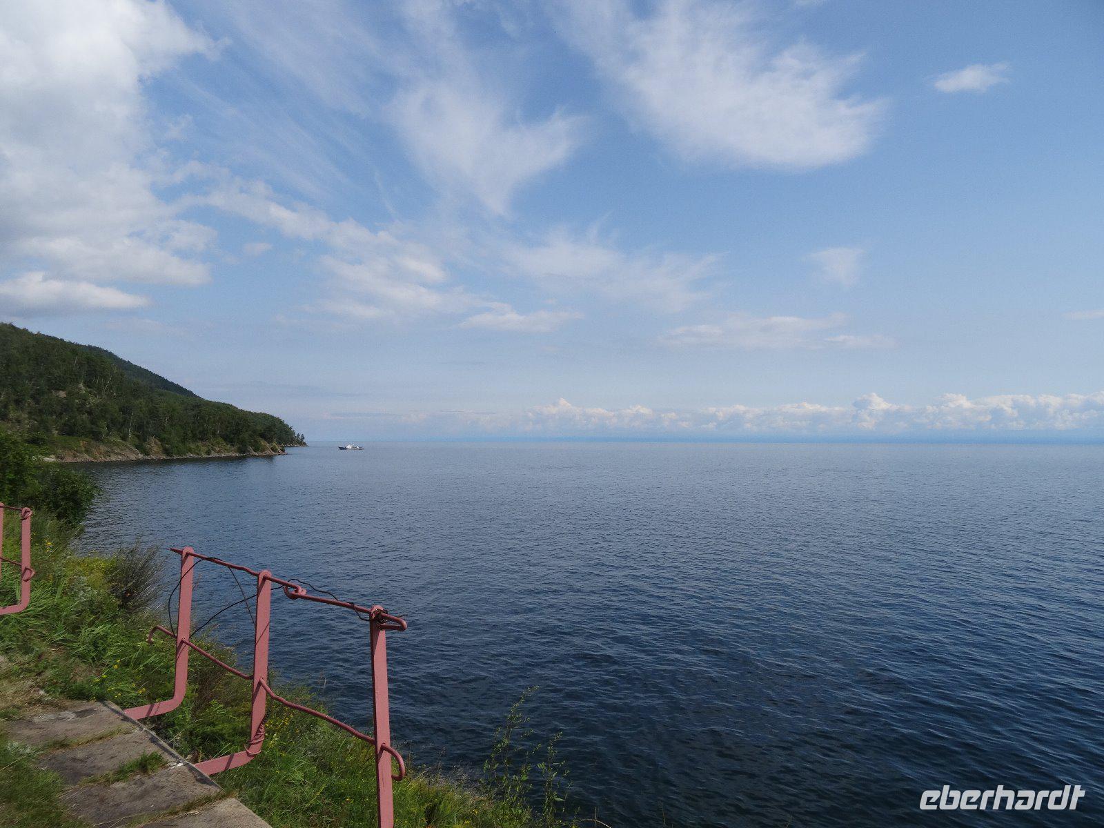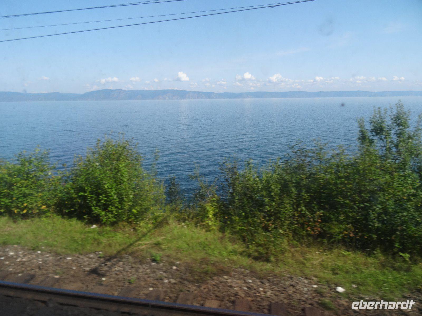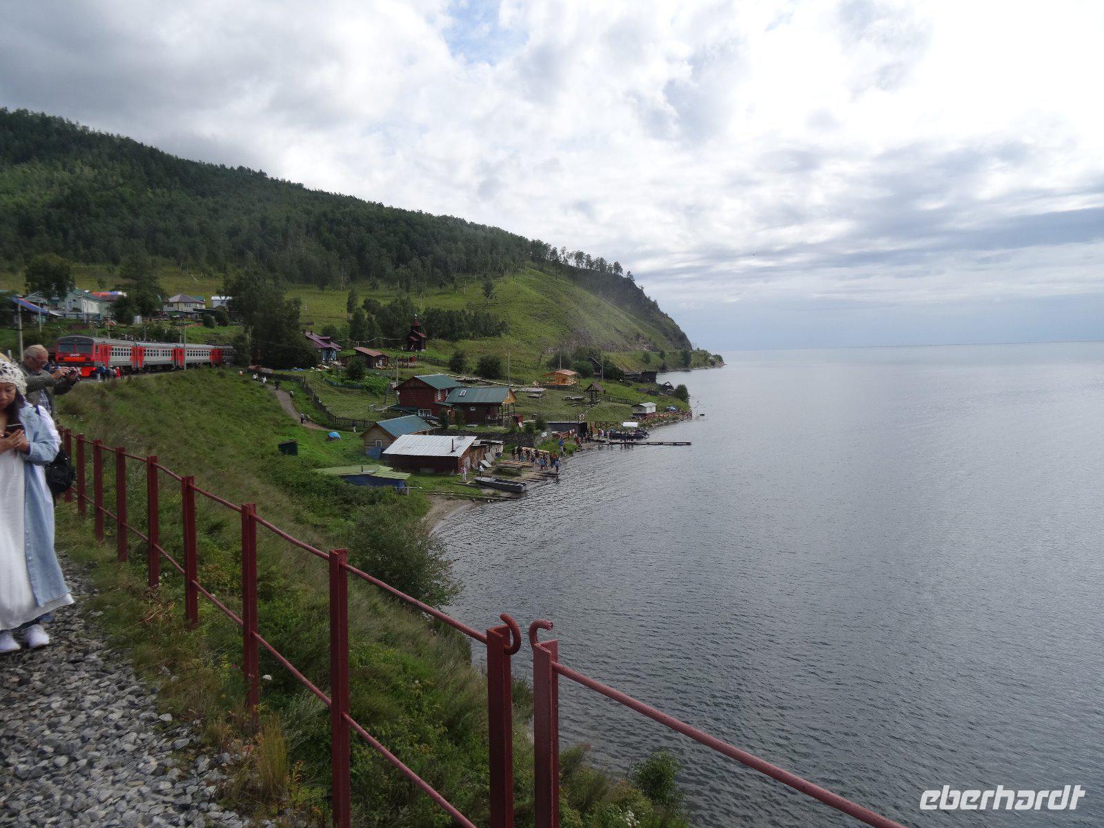 Wir bewundern die Größe des Sees, er ist 636 km lang und seine Breite schwankt zwischen 27 und 80 km. Seine Oberfläche ist so groß wie Belgien und durch die große Tiefe von maximal 1642 m beinhaltet er 20 % der Süßwasserreserven der Erde. Aus 400 m Tiefe wird das Trinkwasser gepumpt. Wir fotografieren eifrig den See mit seinen Steilufern und Buchten und bei den Haltepunkten informieren wir uns über den alten Streckenverlauf, bewundern die ingenieurtechnische Leistung und denken voller Mitleid an die Sträflinge, die hier schuften mussten.