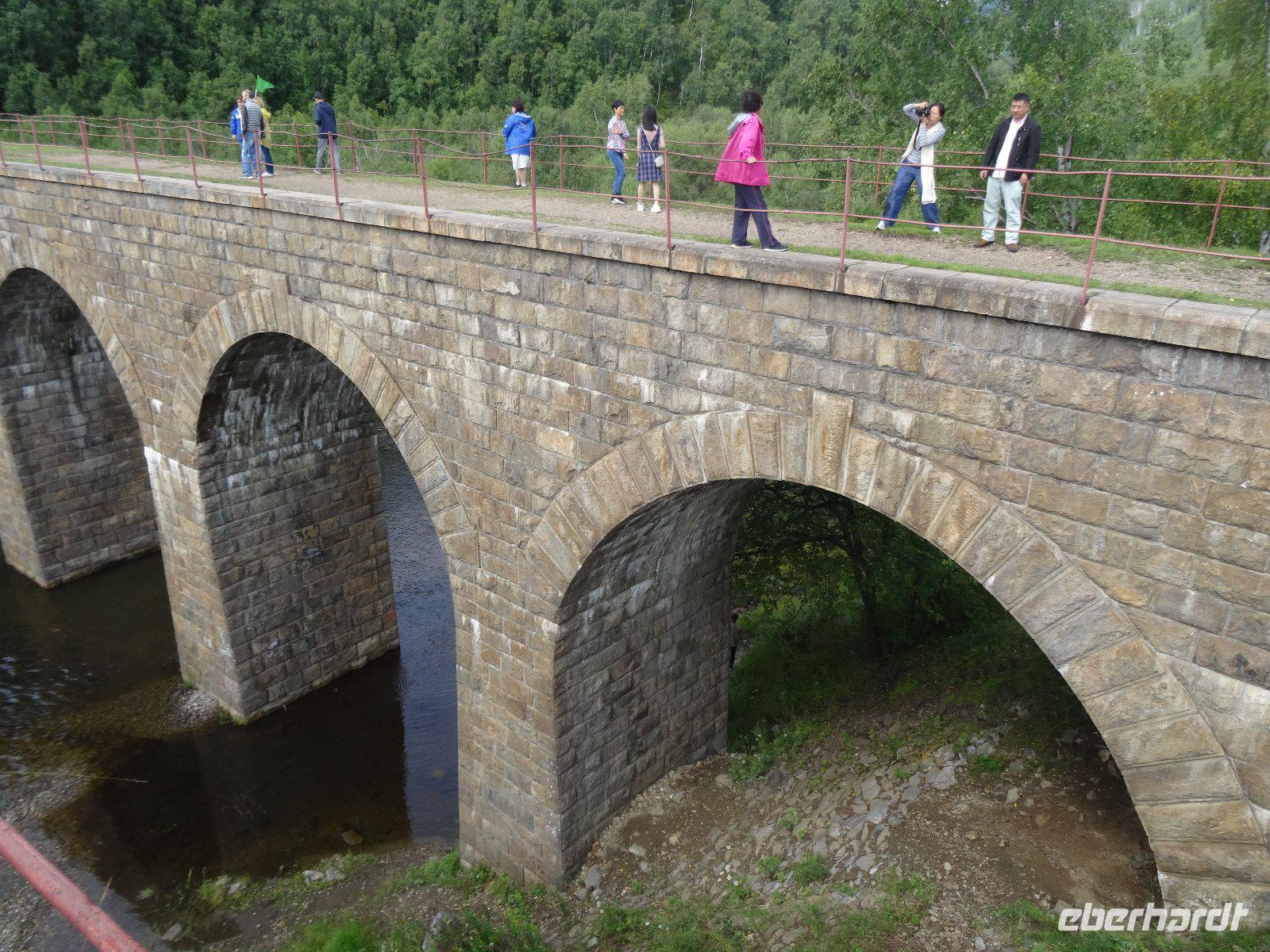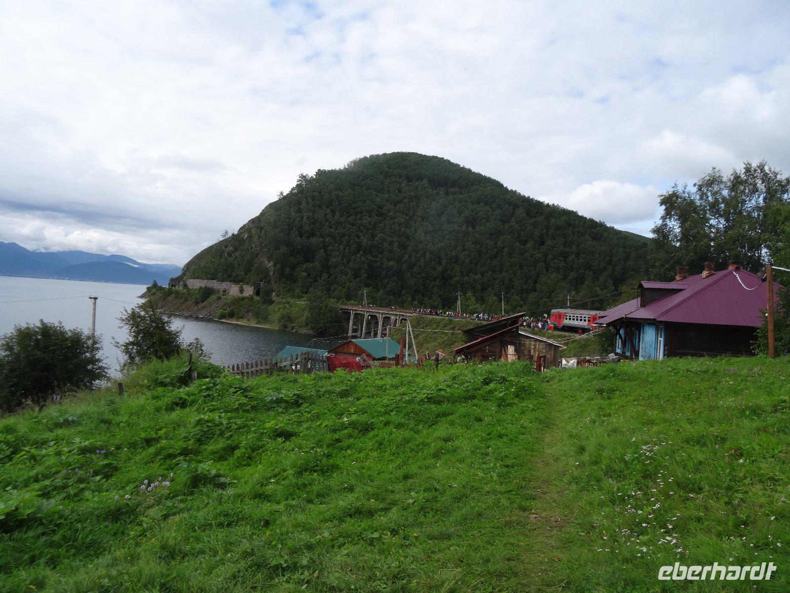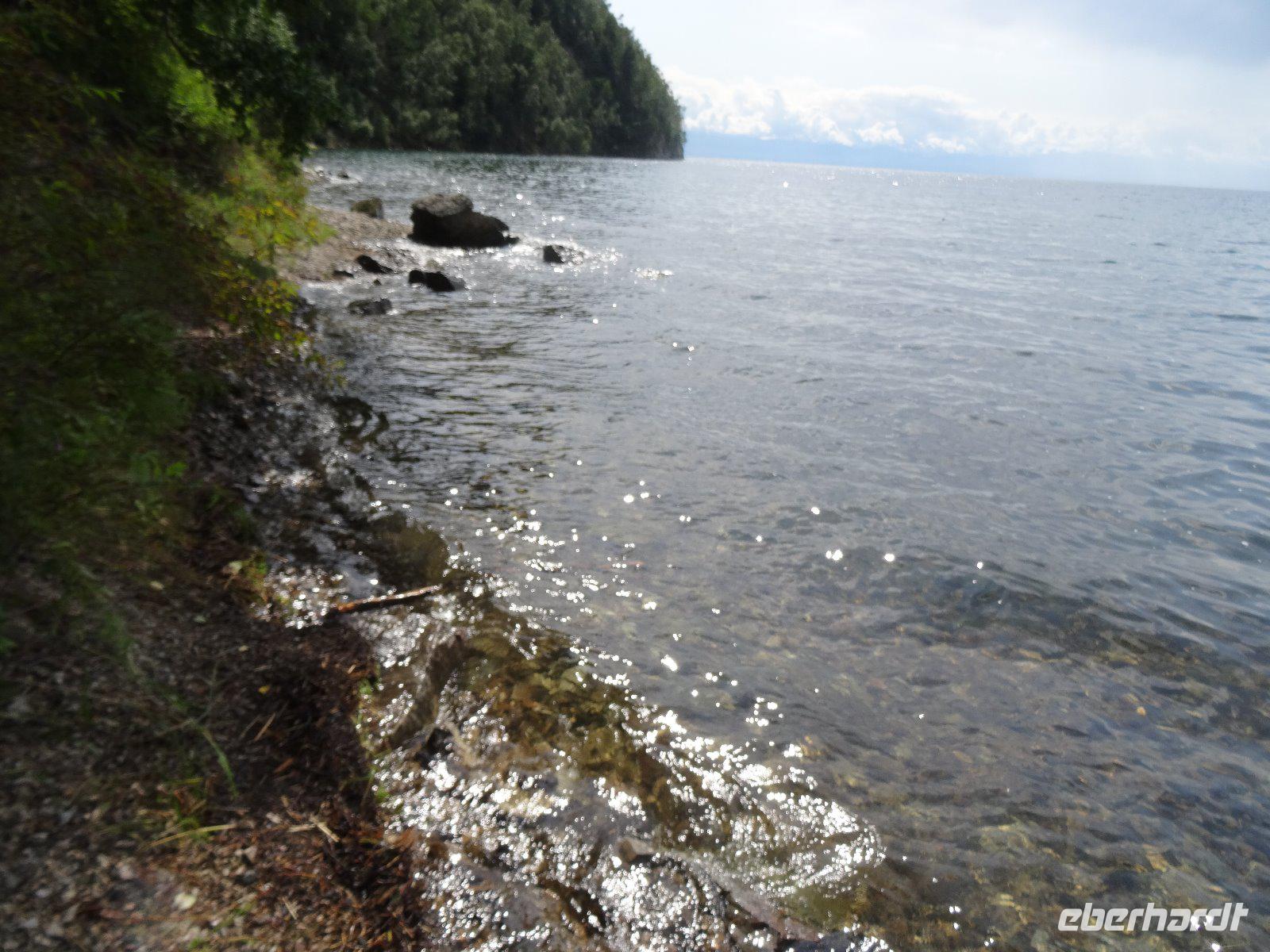 Wir bewundern die Größe des Sees, er ist 636 km lang und seine Breite schwankt zwischen 27 und 80 km. Seine Oberfläche ist so groß wie Belgien und durch die große Tiefe von maximal 1642 m beinhaltet er 20 % der Süßwasserreserven der Erde. Aus 400 m Tiefe wird das Trinkwasser gepumpt. Wir fotografieren eifrig den See mit seinen Steilufern und Buchten und bei den Haltepunkten informieren wir uns über den alten Streckenverlauf, bewundern die ingenieurtechnische Leistung und denken voller Mitleid an die Sträflinge, die hier schuften mussten.