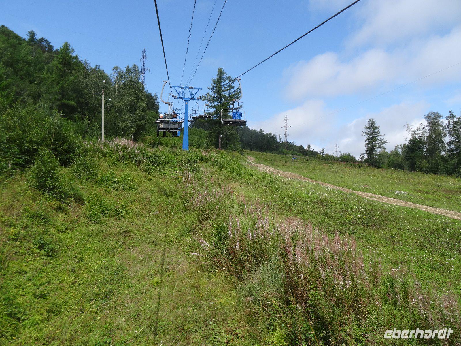 Nun lockt uns der Aussichtspunkt auf dem757 m hohen Cerskij-Fels. Es führt zwar auch ein Wanderweg hinauf, aber wir ziehen die bequeme Variante per Seilbahn vor und erreichen den Gipfel ganz entspannt. Die Aussicht ist wirklich atemberaubend und so werden entsprechend viele Fotos geschossen. Der Name des Gipfels kommt vom Geographen Jan Cerskij, der 1863 nach Sibirien verbannt wurde und umfangreiche Forschungen zum Baikalsee betrieb. Den Abstieg vom Gipfel erledigen wir wieder per Gondel und dann geht es zum Fischmarkt in Listvjanka. Der geräucherte Omul ist wirklich eine Delikatesse und wir sprechen ihm herzhaft zu. Mit gefülltem Magen bummelt es sich dann noch ganz angenehm über den übrigen Markt mit Obst und Gemüse sowie diversen Souvenirs. Einige Tapfere gehen zu Fuß zurück zum Hotel, der Rest lässt sich fahren.
