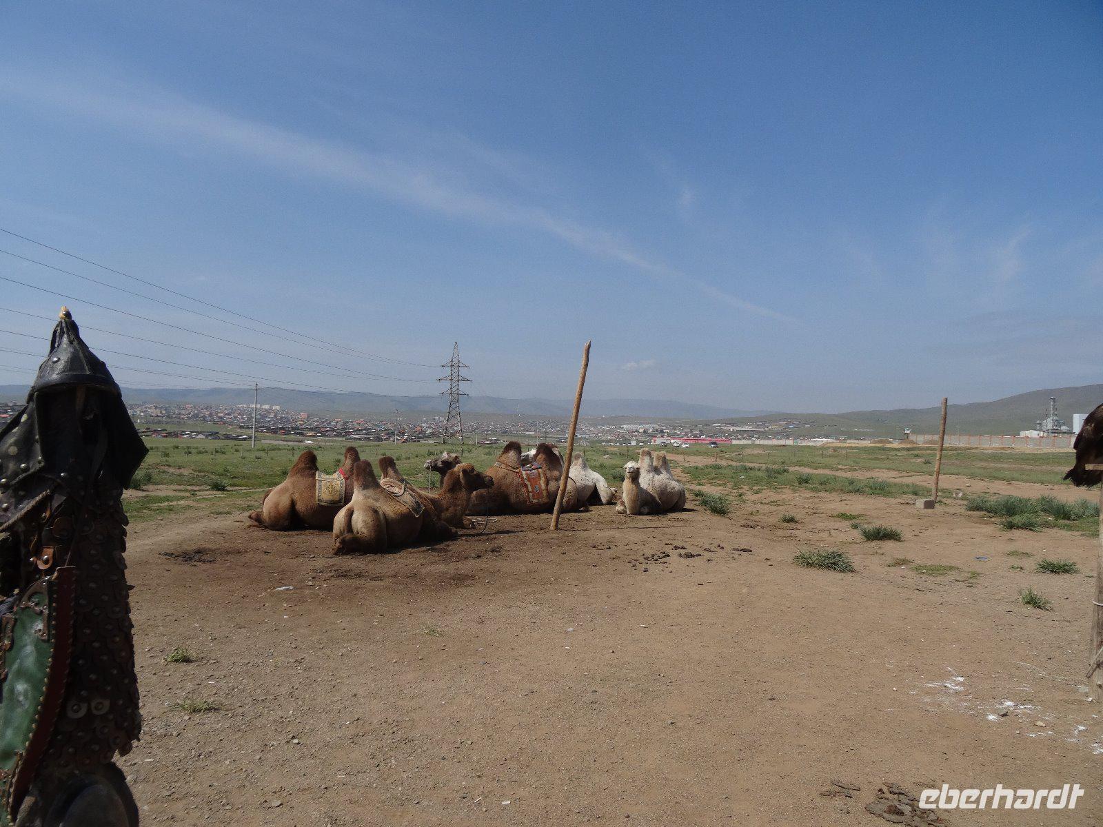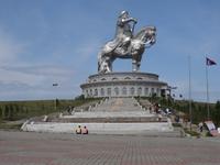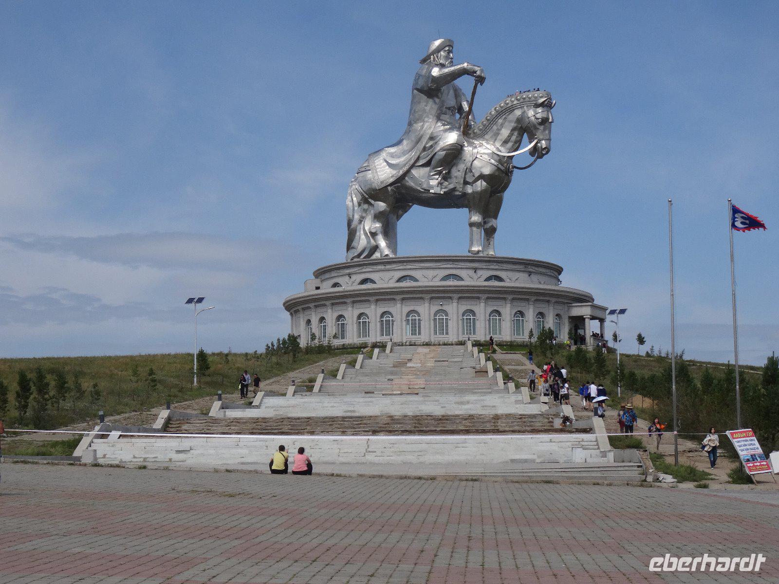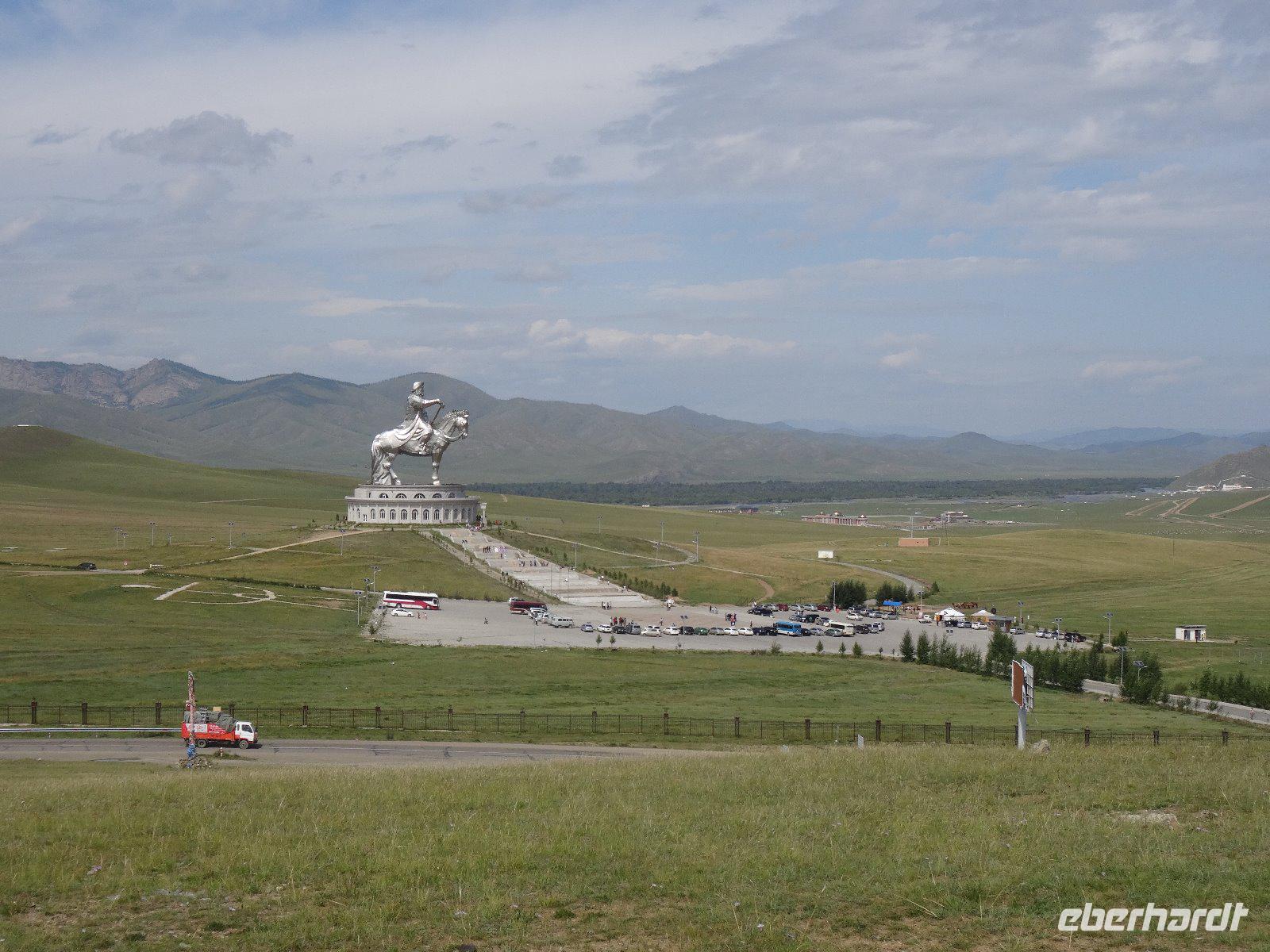 Wir erledigen nun noch solch profanen Dinge wie Briefmarkenkauf, Supermarkt und Souvenirstände und dann fahren wir ins Camp zurück zum Mittagessen. Danach scheiden sich die Geister, einige wollen nur gemütlich spazieren und sich ausruhen, andere wiedrum lockt ein Denkmal auf einem nahegelegenen Hügel und so brechen wir auf, ihn zu erklimmen. Oben angelangt, sehen wir, dass das Denkmal dem großmongolischen Reich gilt und an frühere Größe erinnert. Zufrieden werden einige Erinnerungsfotos geschossen und dann geht es wieder abwärts.