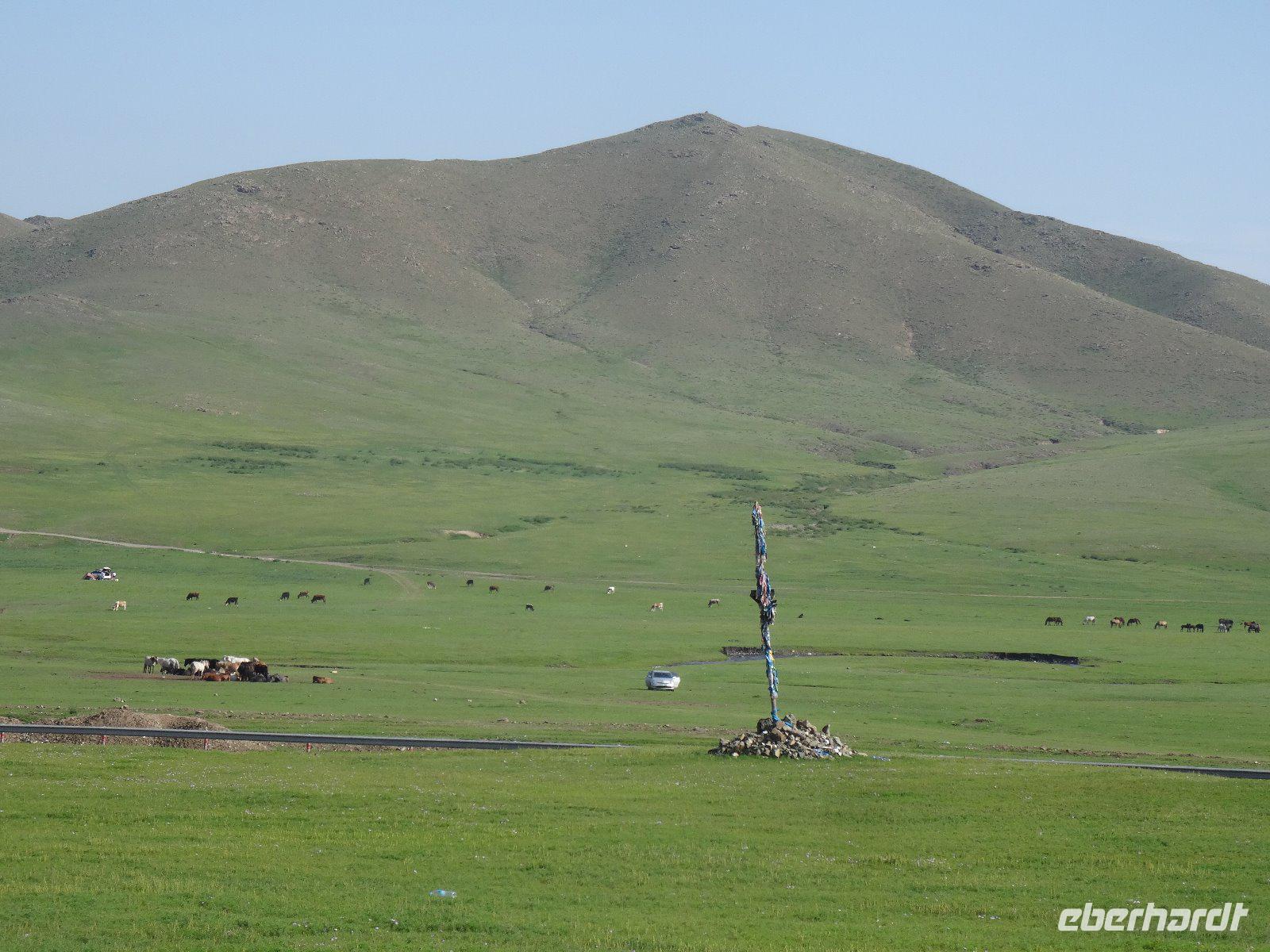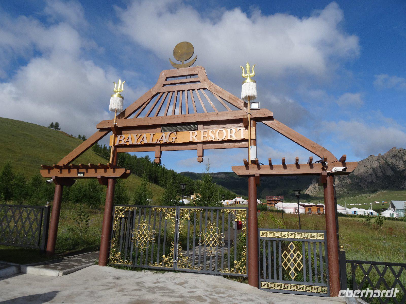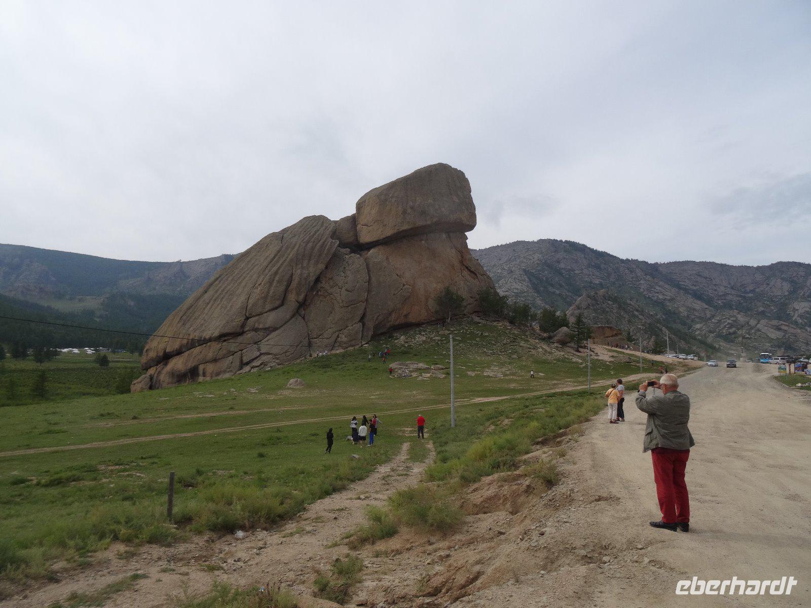 Wir erledigen nun noch solch profanen Dinge wie Briefmarkenkauf, Supermarkt und Souvenirstände und dann fahren wir ins Camp zurück zum Mittagessen. Danach scheiden sich die Geister, einige wollen nur gemütlich spazieren und sich ausruhen, andere wiedrum lockt ein Denkmal auf einem nahegelegenen Hügel und so brechen wir auf, ihn zu erklimmen. Oben angelangt, sehen wir, dass das Denkmal dem großmongolischen Reich gilt und an frühere Größe erinnert. Zufrieden werden einige Erinnerungsfotos geschossen und dann geht es wieder abwärts.