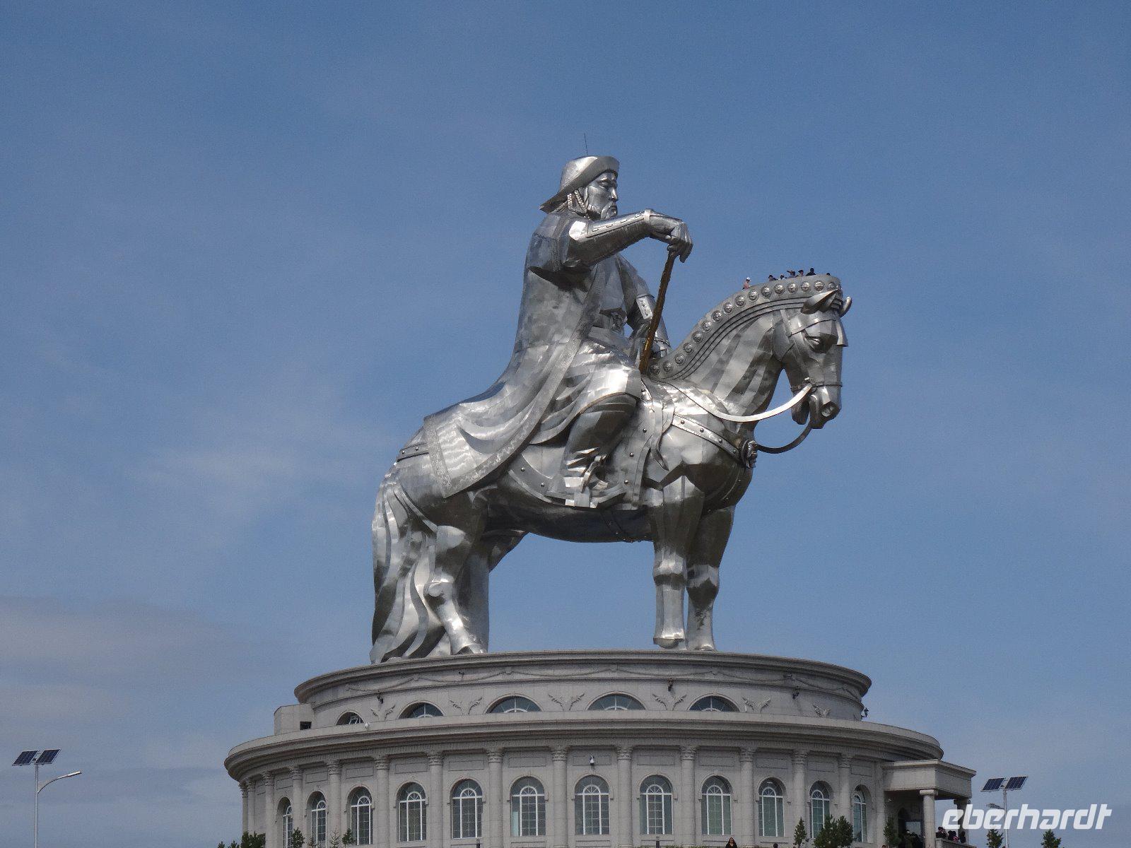 Schon von weitem ist die riesige Statue Dschingis Khans zu sehen, sie ist über einem Gebäude errichtet und dieses steht auf einem Hügel. Wir gehen hinein und besehen das kleine Museum und genießen den Ausblick von oben.