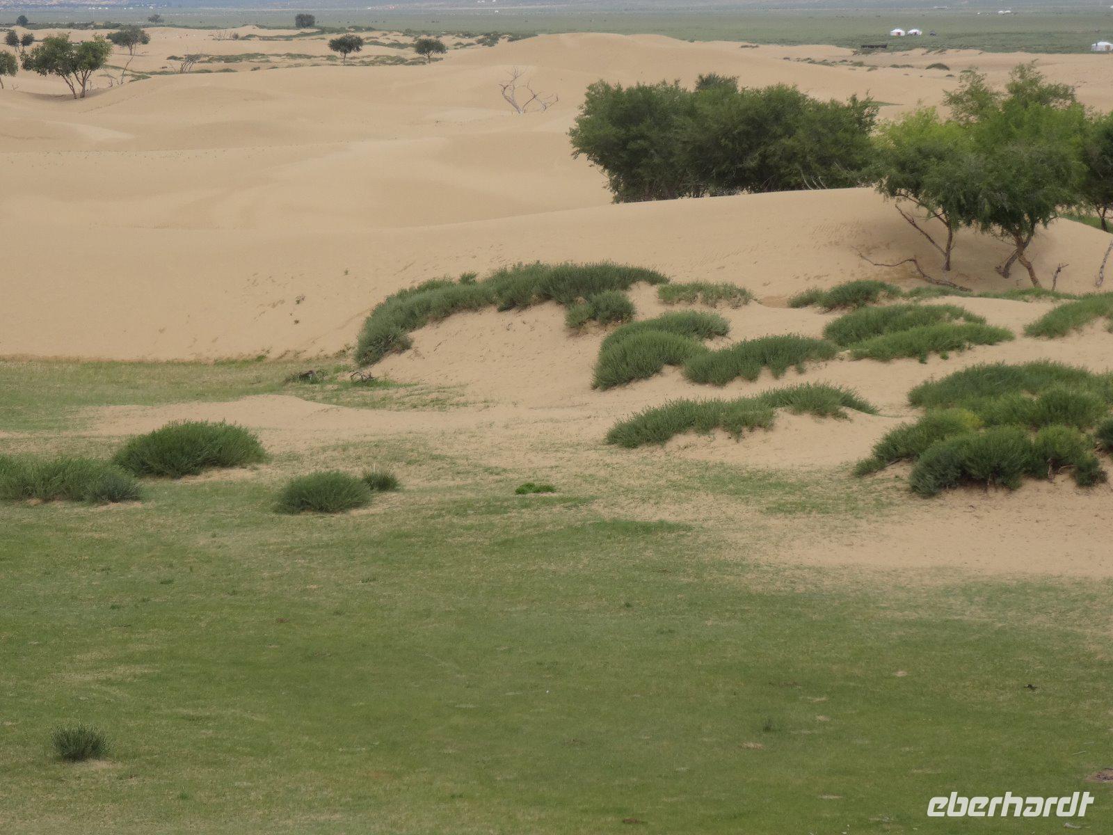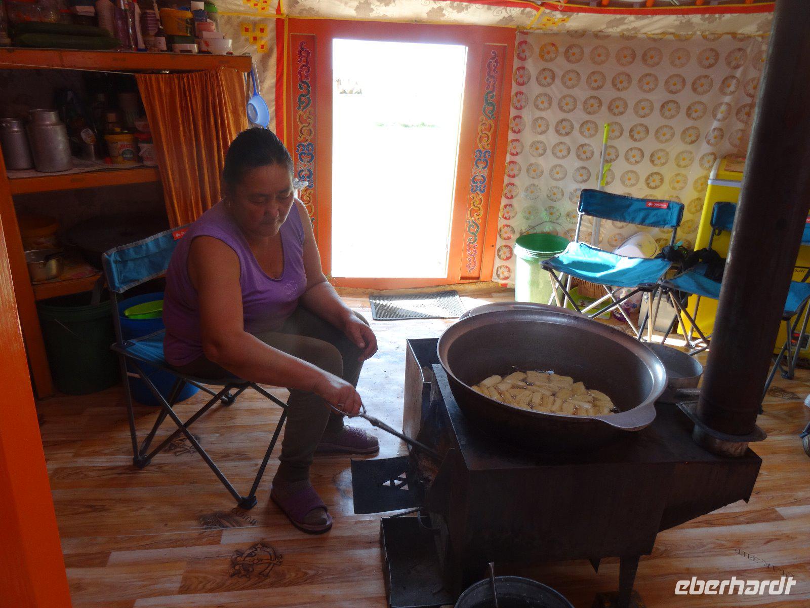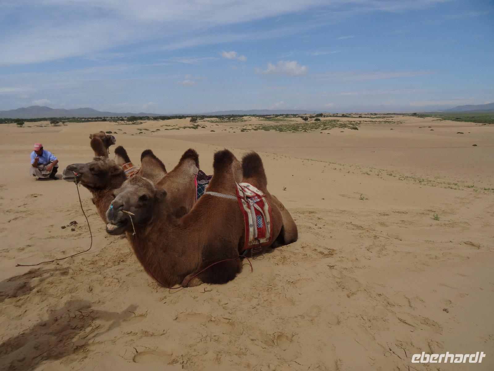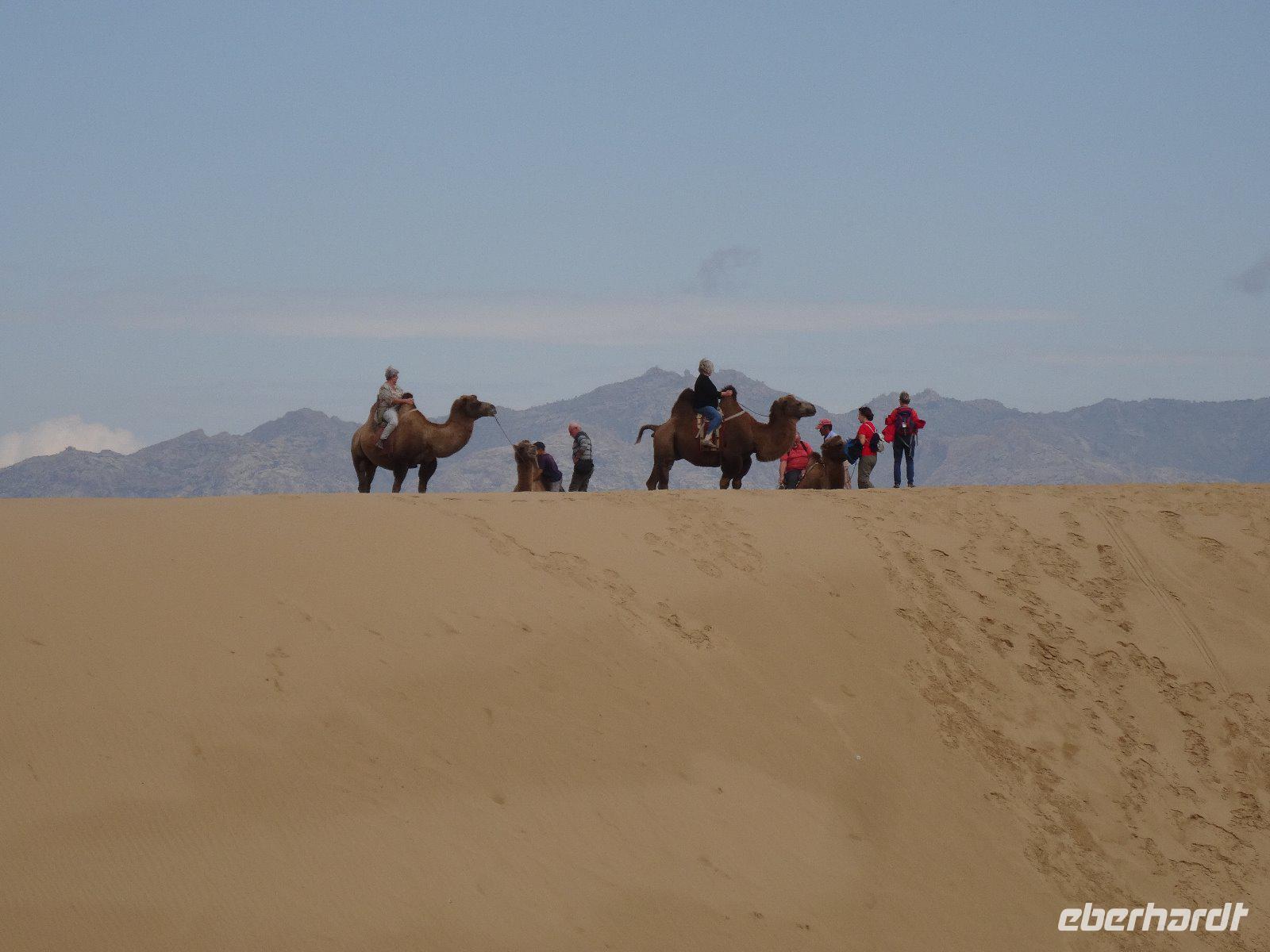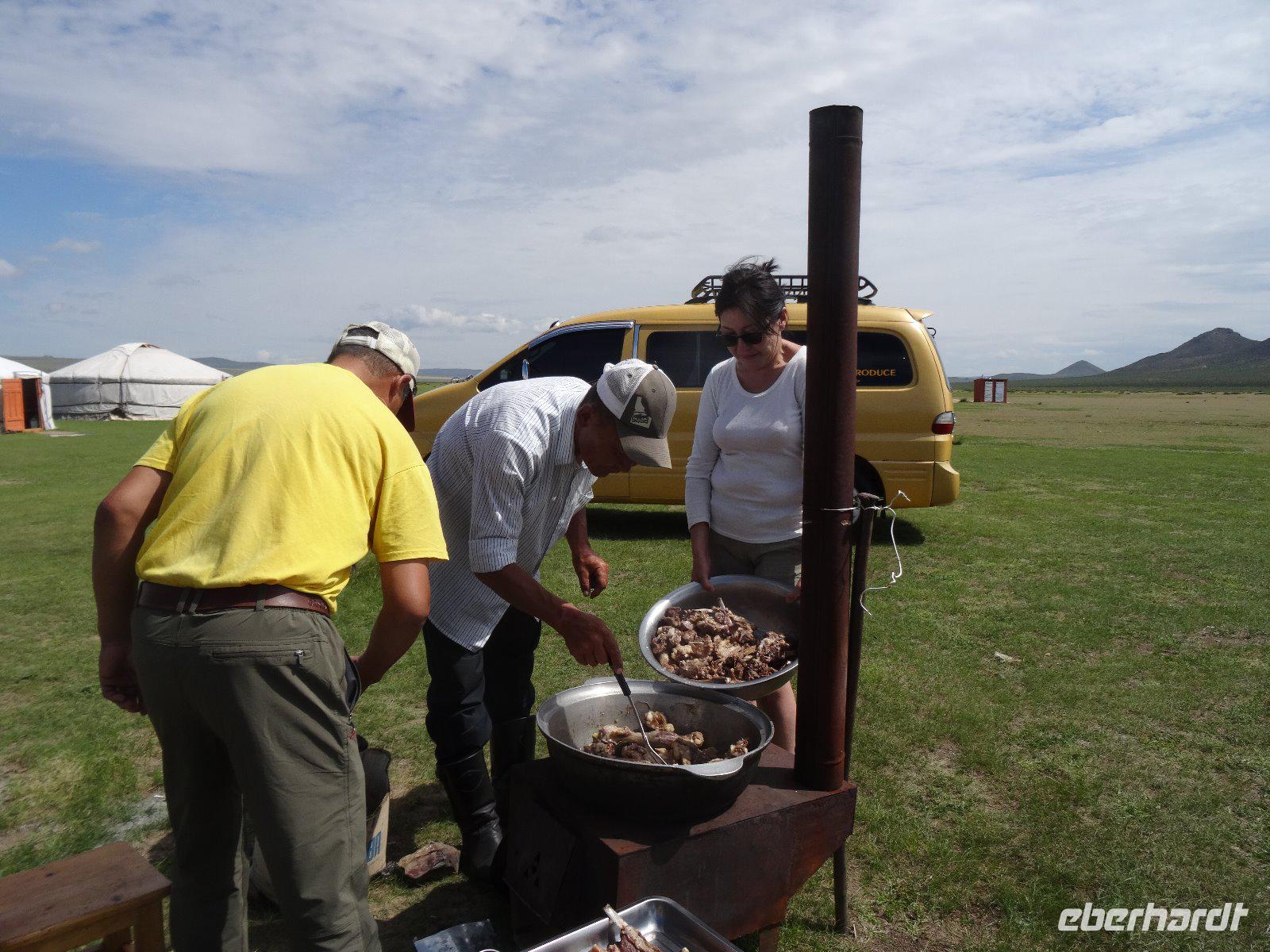 Das Gepäck wird wieder verladen und wir fahren erneut ein Stück durch die Steppe bis zu einer Nomadenfamilie. Sie zeigen und erklären uns ihre Jurte und bewirten uns mit Stutenmilch, Schmalzgebäck und Milchtee. wir überreichen unsere kleinen Gastgeschenke und schauen uns noch ein wenig um. Dann starten wir zur Sanddüne. Einige reiten auf Kamelen dahin, das sieht ganz zünftig nach großer Wüstendurchquerung aus. Hinter der Düne liegt noch ein größerer Felsen mit Felsmalereien, ein paar Mutige wandern noch bis dahin, um sie zu sehen. Dann geht es zurück zu unseren Gastgebern, die inzwischen unsere Mittagsmahlzeit aus Hammel- und Ziegenfleisch mit Reis zubereitet haben. Die Wanderung hat Appetit gemacht und so lassen wir es uns gut schmecken, trinken noch Kaffee oder Tee oder Stutenmilch und dann geht es weiter zum nächsten Camp Munkh Tenger. Dort ist es das erste Mal, dass es kein Internet gibt, sonst war es immer verfügbar, trotz der Abgelegenheit der Camps.