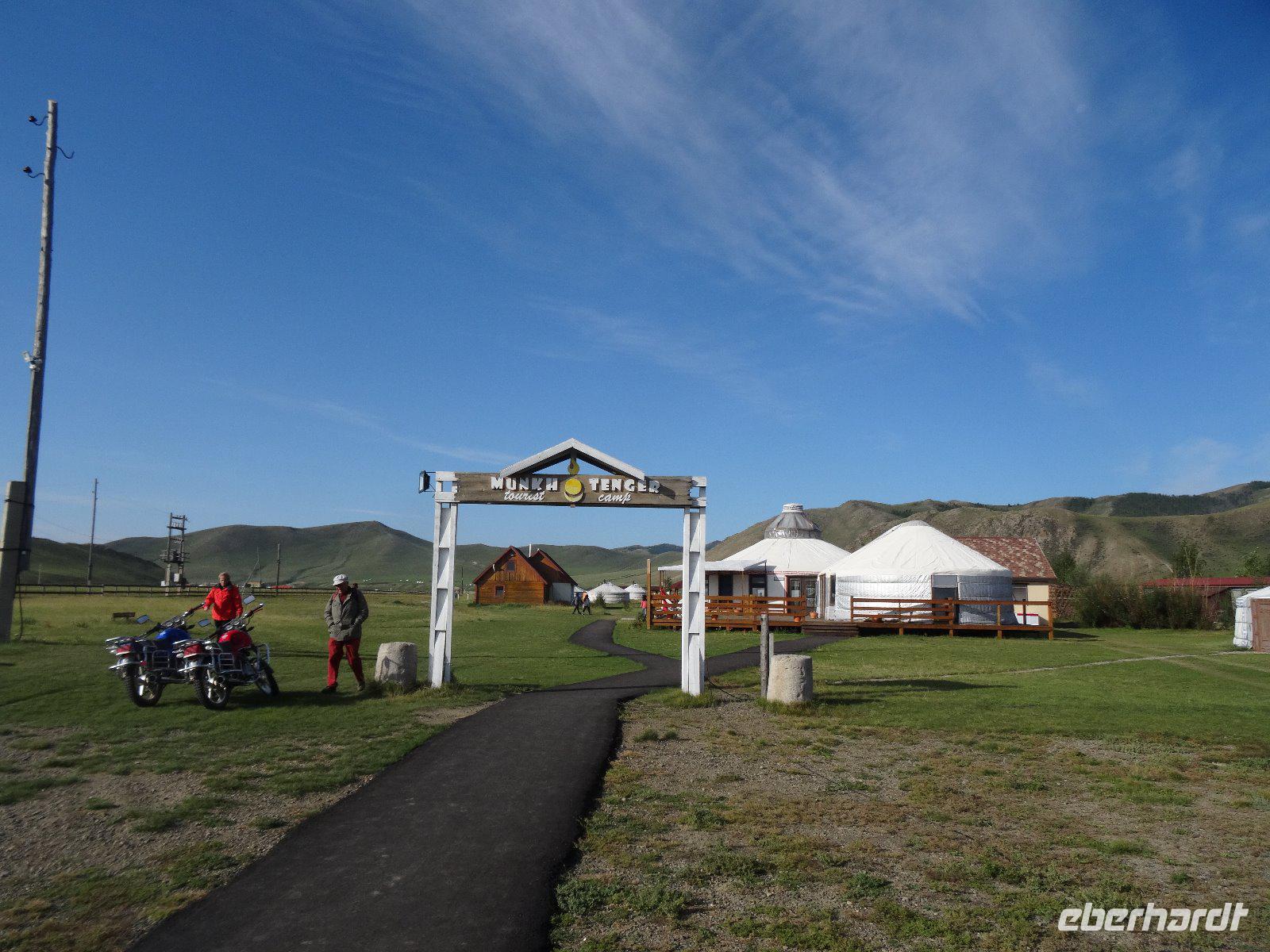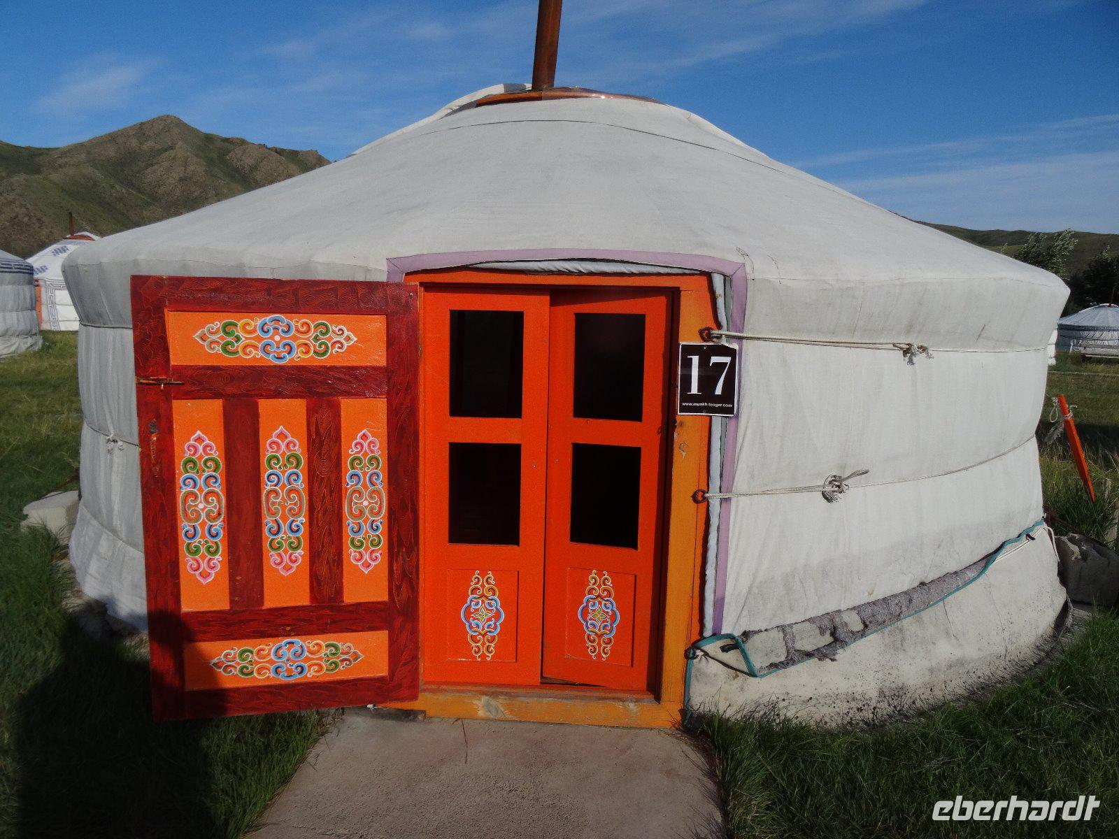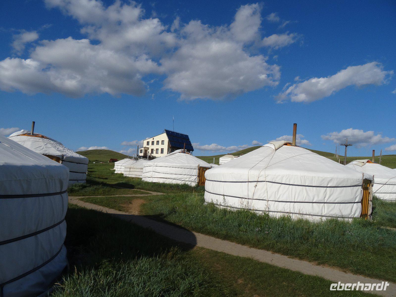 Dass die Mongolei ein großes Land ist, merken wir heute so richtig - sehr lange fahren wir auf einer recht schlechten Straße um zum nächsten Jurtencamp zu gelangen. Eine Mittagspause an einer Raststätte unterbricht die lange Fahrt, wir können uns etwas strecken und bewegen und dann geht es auch schon weiter. Am Nachmittag kommen wir im Camp Hoyor Zagal an und beziehen wieder unsere Jurten. Da die Abende und Nächte schon recht kalt sind, freuen wir uns, dass die Jurten kleine Öfen haben und dienstbare Geister diese auch heizen.