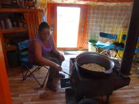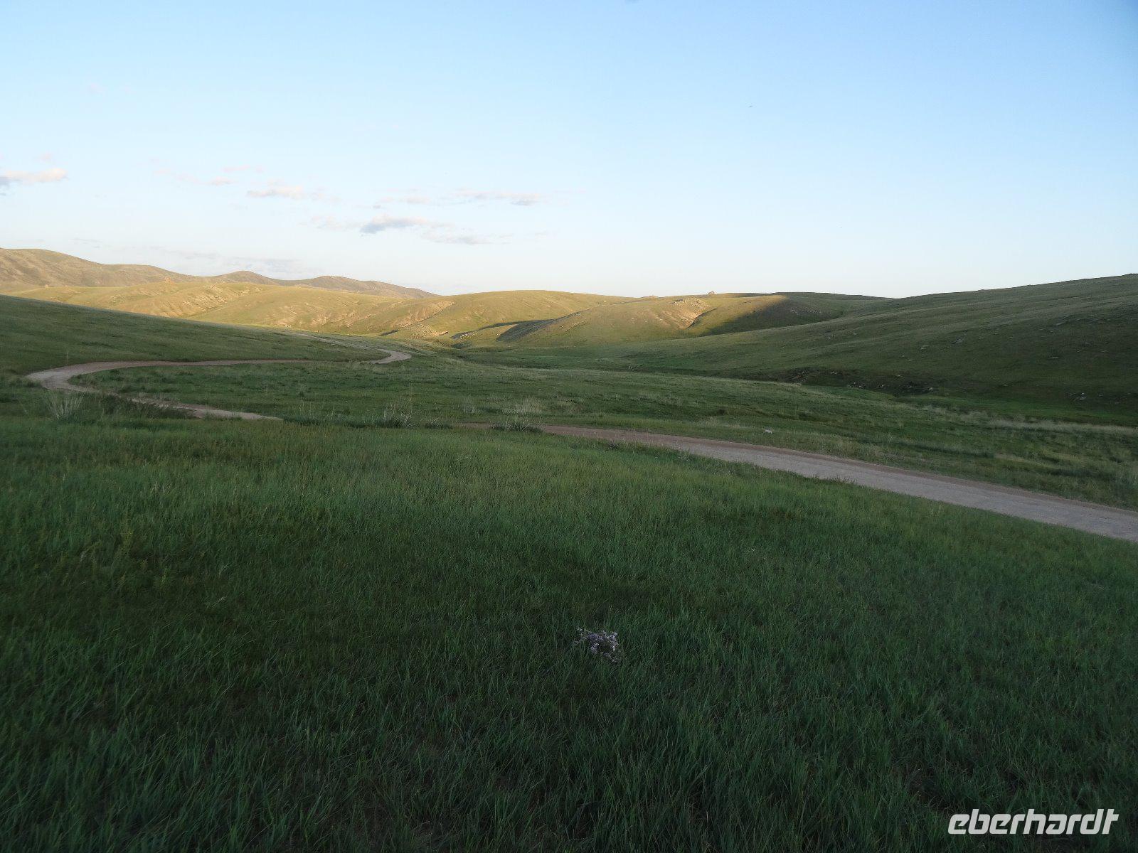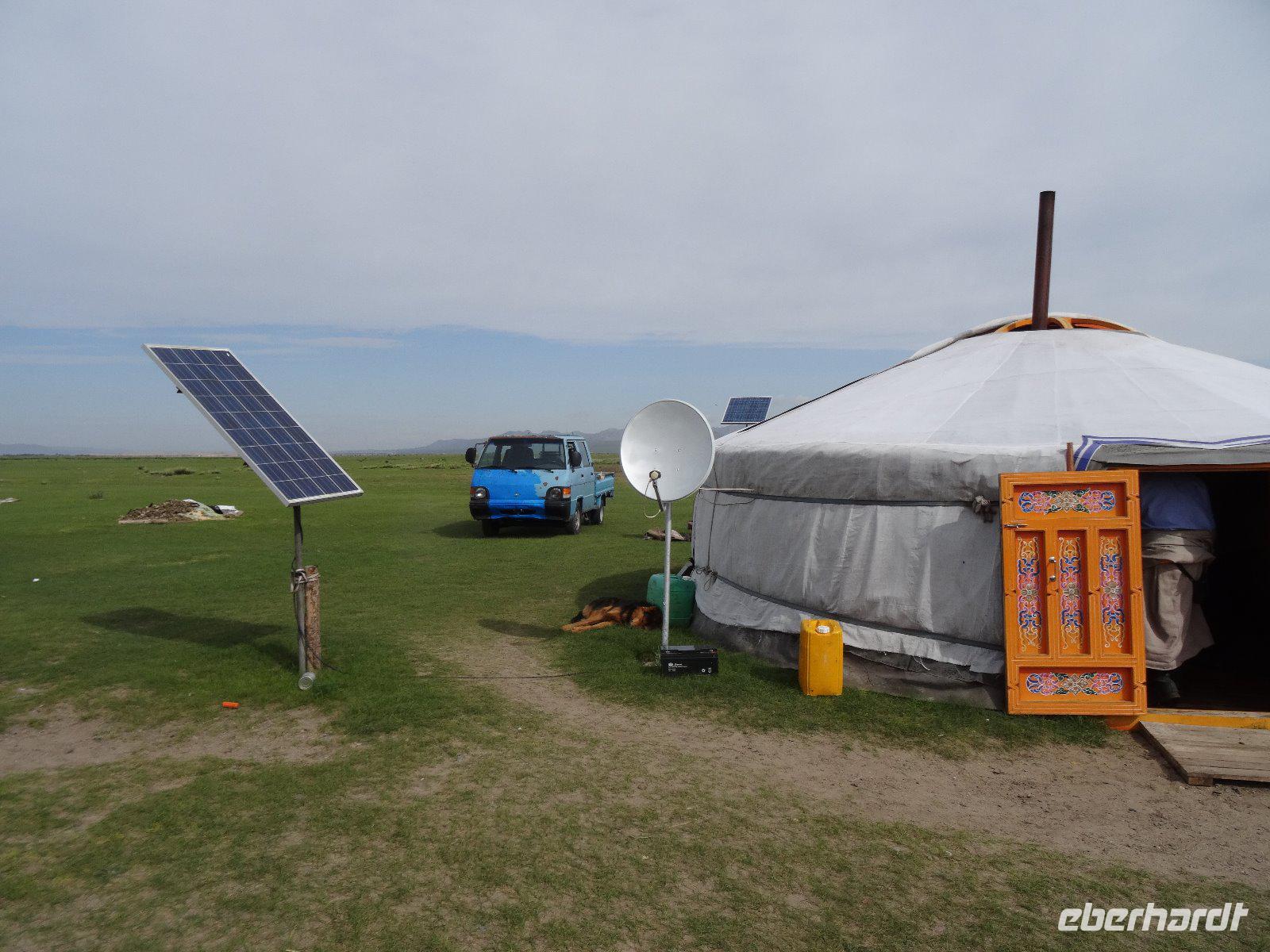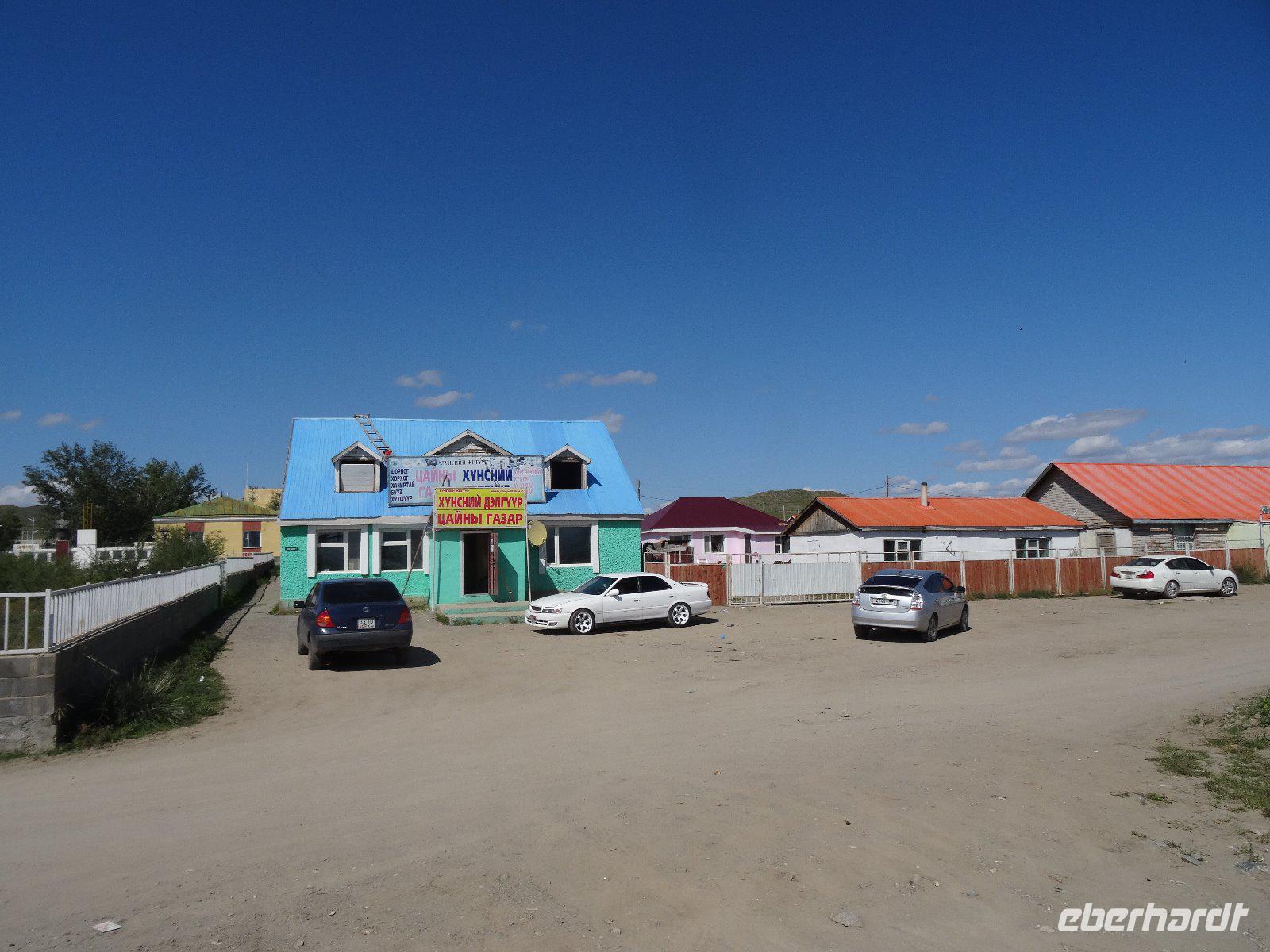 Dass die Mongolei ein großes Land ist, merken wir heute so richtig - sehr lange fahren wir auf einer recht schlechten Straße um zum nächsten Jurtencamp zu gelangen. Eine Mittagspause an einer Raststätte unterbricht die lange Fahrt, wir können uns etwas strecken und bewegen und dann geht es auch schon weiter. Am Nachmittag kommen wir im Camp Hoyor Zagal an und beziehen wieder unsere Jurten. Da die Abende und Nächte schon recht kalt sind, freuen wir uns, dass die Jurten kleine Öfen haben und dienstbare Geister diese auch heizen.