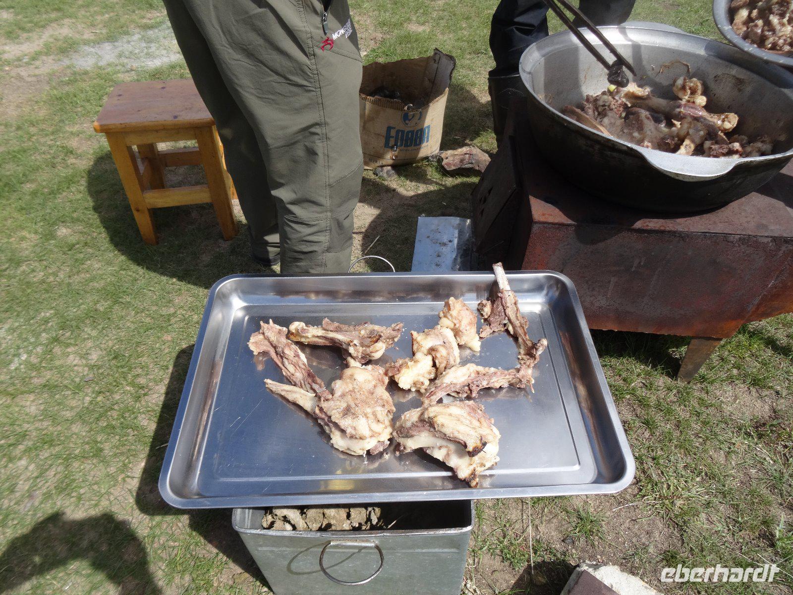 Kurze Zeit später erreichen wir unser Jurtencamp Bayalag im Nationalpark Terlj. Wir richten uns in unseren diversen Jurten ein und dann stärken wir uns an einem guten Büfett und feiern mit einer Flasche Wodka der Marke "Dschingis" unser Bergfest.